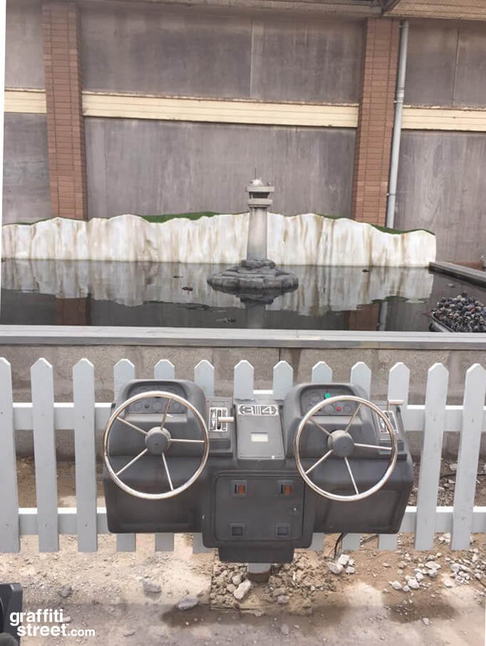 If you look closer at the wall resembling Lido’s showers, you’ll spot an impressive stencil artwork by Banksy. The artwork is created to depict two young boys sneakily peeking at a lady taking a refreshing shower. What’s more interesting is the clever use of old plastic to create a realistic shower curtain effect.