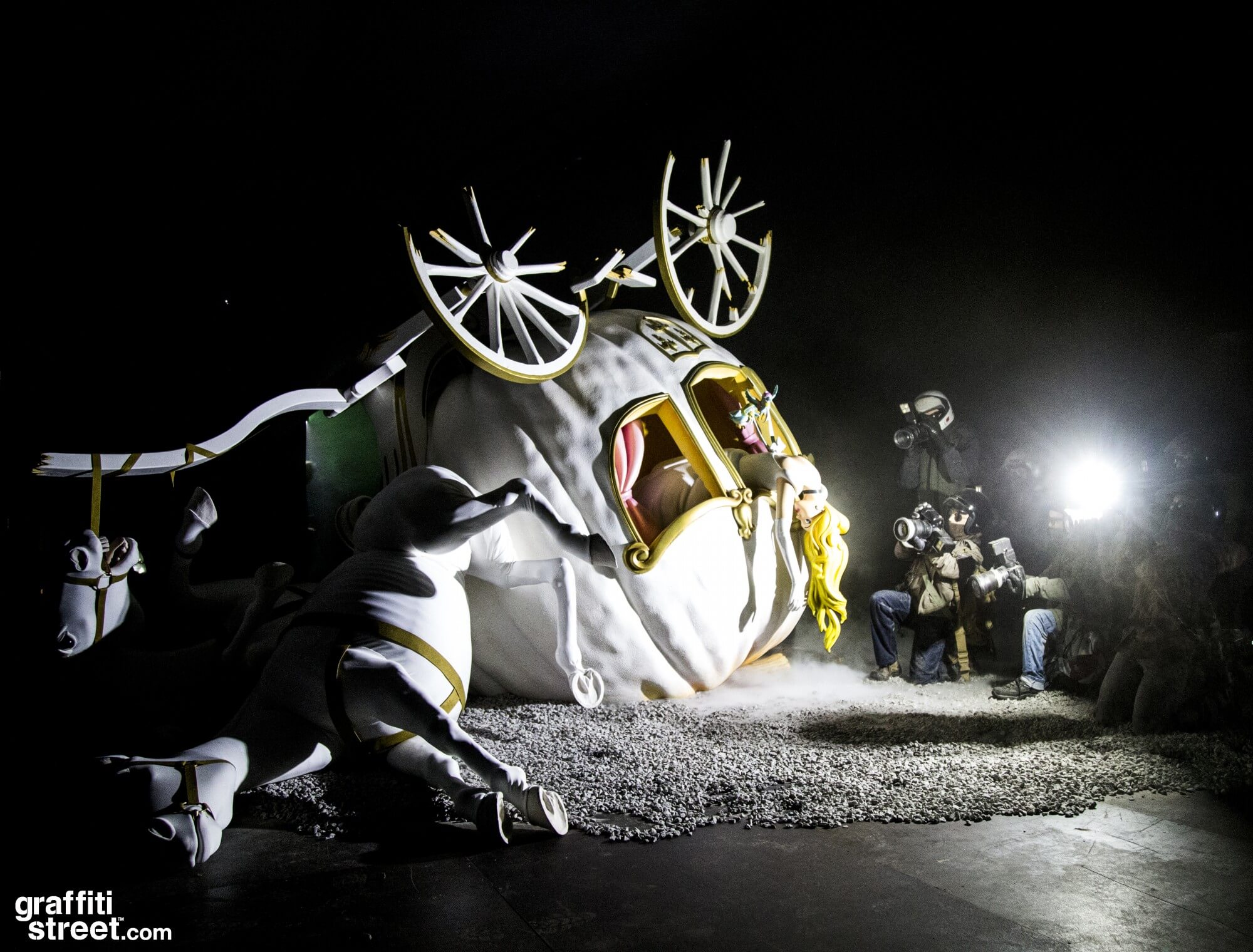 As you walk onto the bridge and through the decaying castle doors, the surroundings turn pitch black—however, the faint sound of cameras snapping guides you through the darkness. Following the sound, you suddenly come across a tragic crash scene. Cinderella’s lifeless body spills through the window of her pumpkin carriage, illuminated by a blizzard of flash photography from the surrounding group of paparazzi photographers.
