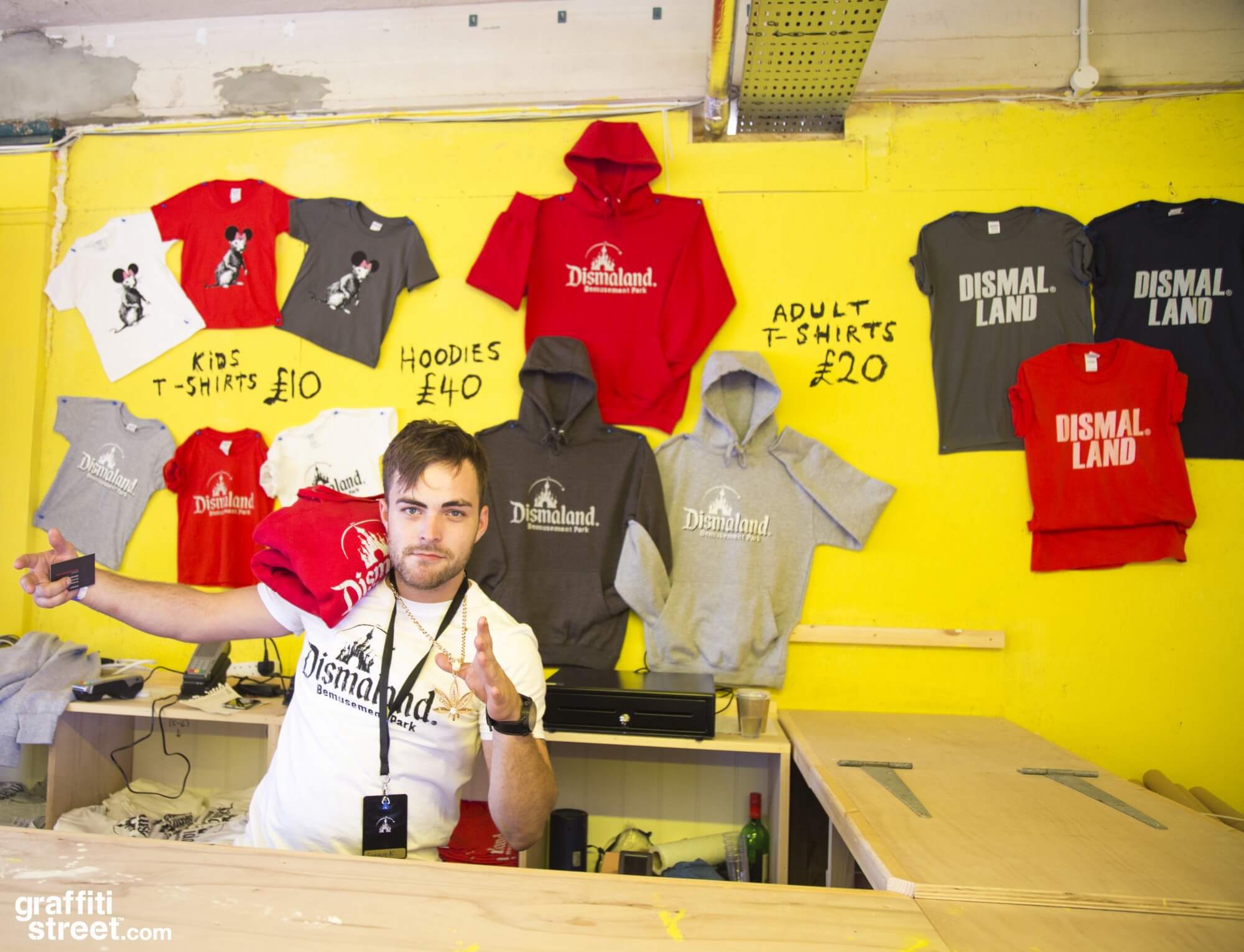 ” Think of this as a fairground that embraces brutality and low level criminality – so a fairground then”. Banksy
