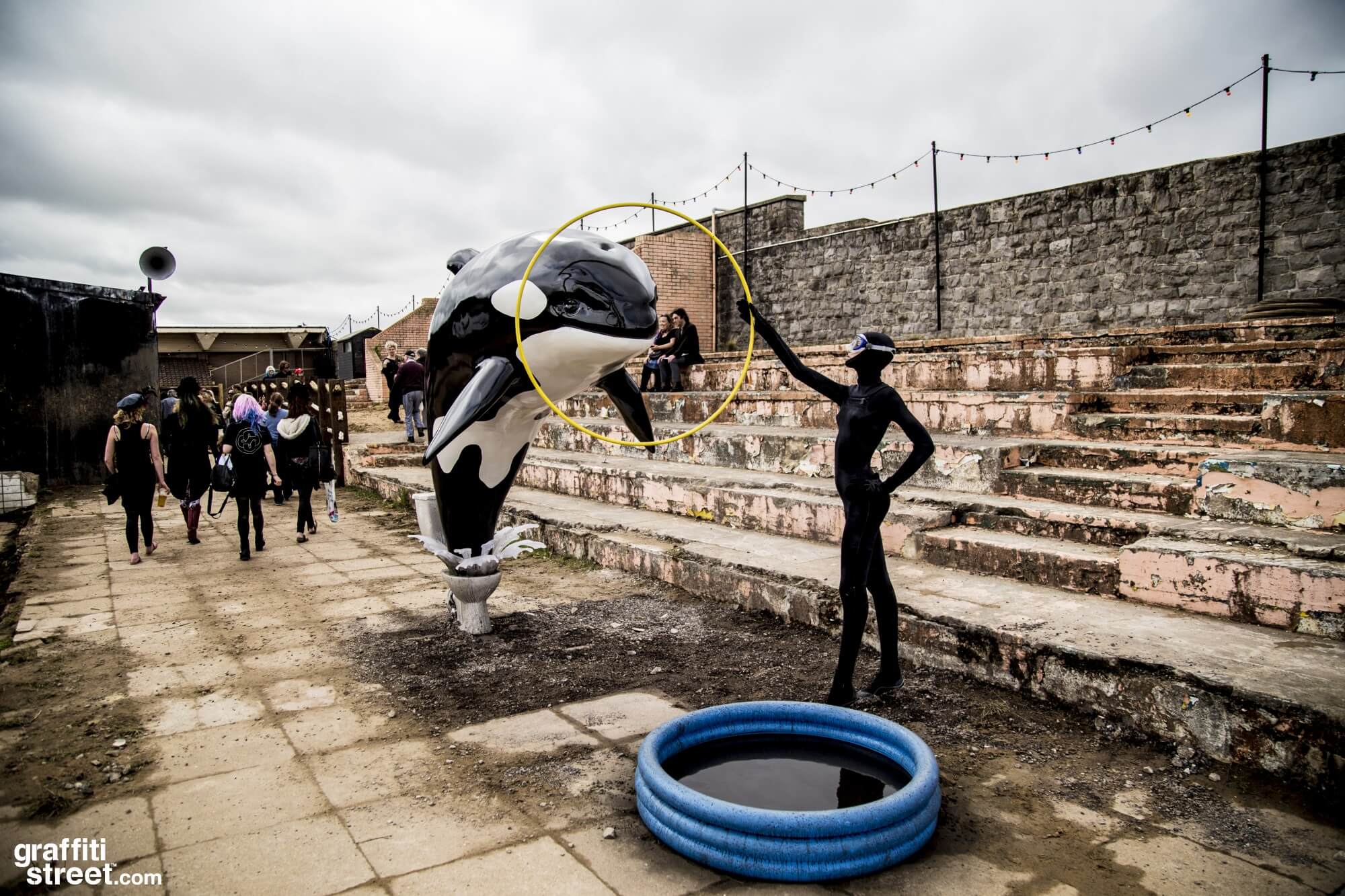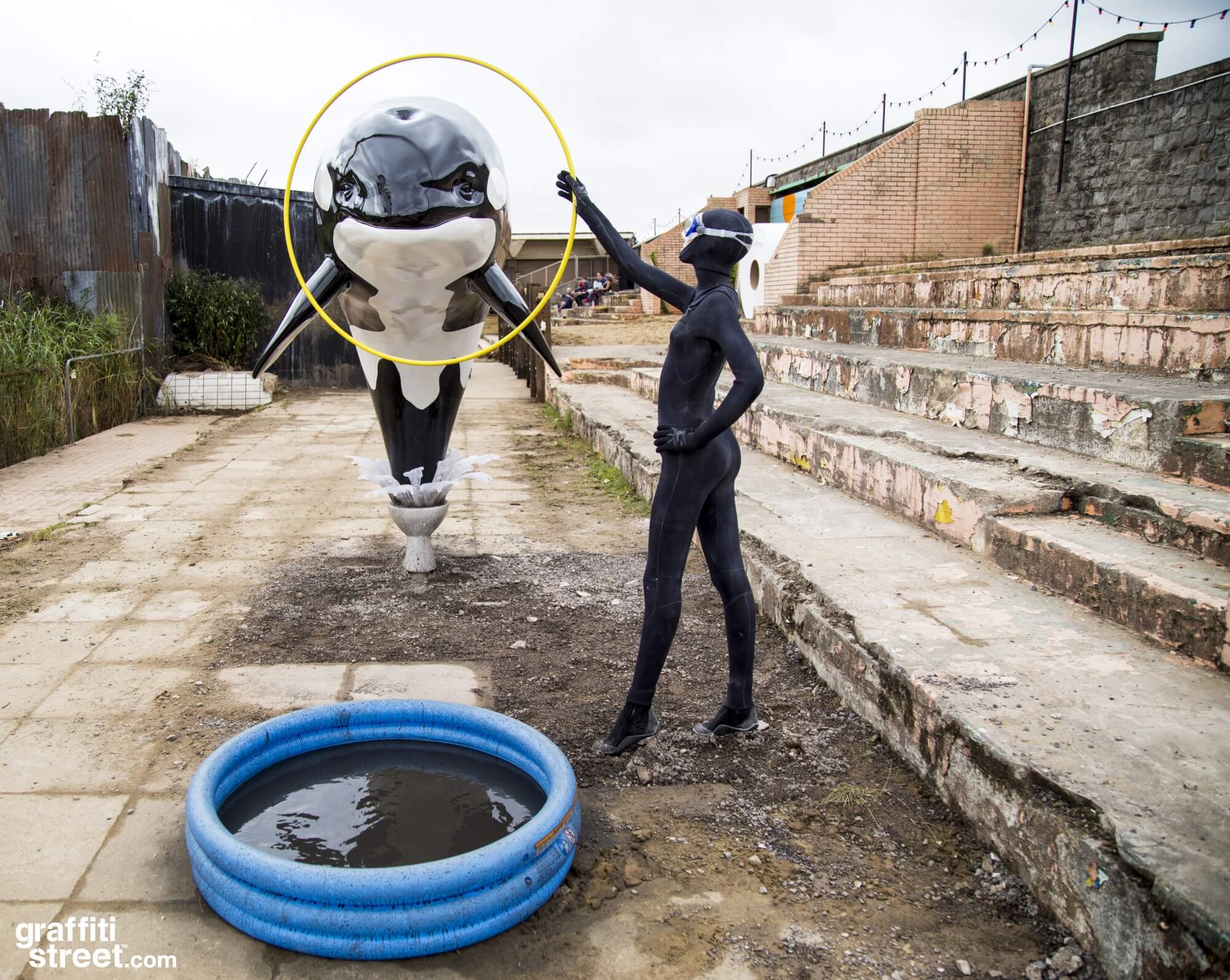 The image of Banksy’s artwork depicting an Orca jumping out of a toilet bowl, leaping through a hoop held by a trainer and landing in a children’s pool is a powerful statement against SeaWorld’s inhumane treatment of Orcas. These intelligent and social animals should not be kept in captivity and forced to perform degrading tricks for human entertainment. Instead, they deserve to live in environments with the necessary stimulation, exercise, and fulfilment. The confinement of Orcas in cramped and cruel conditions is a practice that needs to be abandoned immediately.