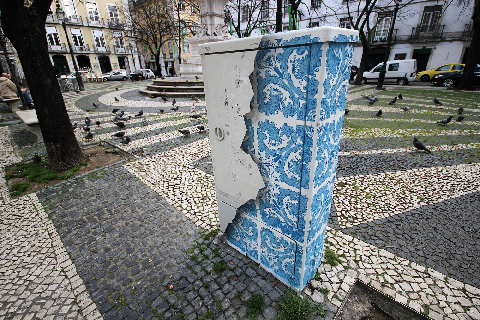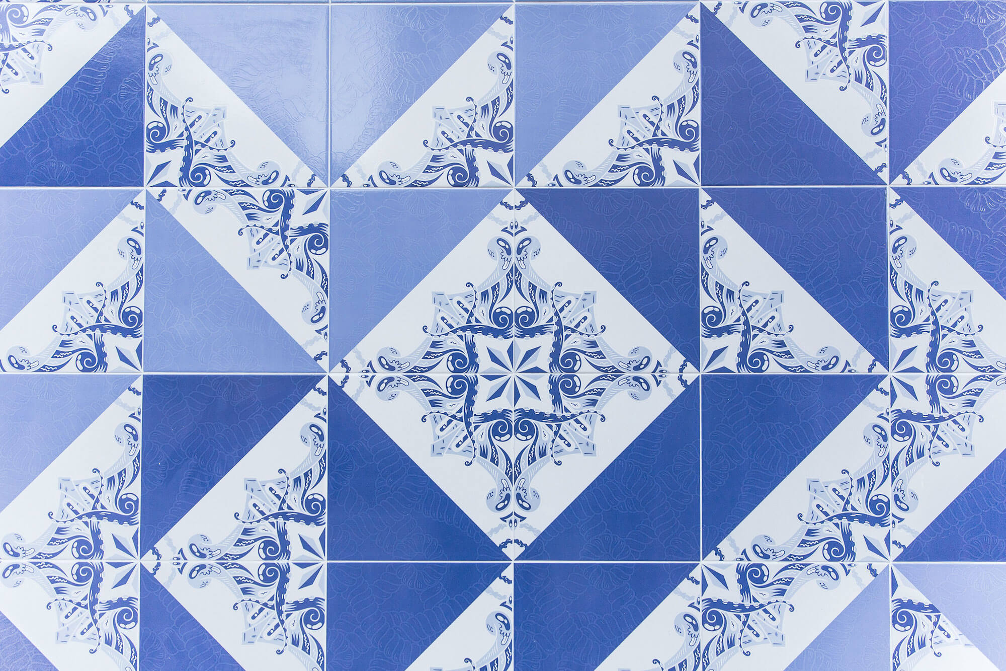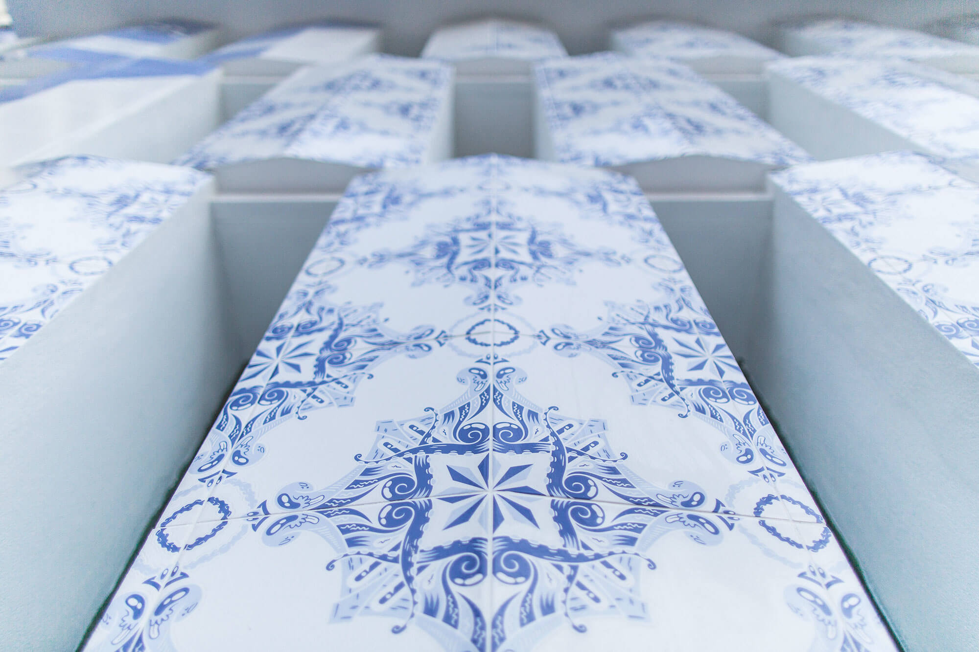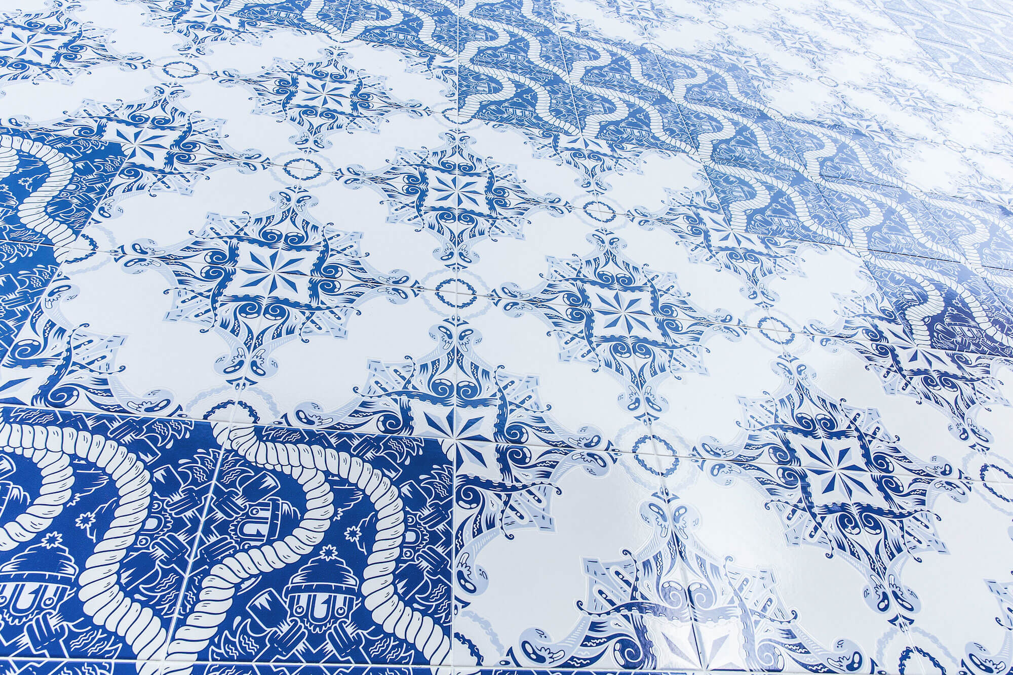 Add Fuel is Portuguese visual artist and illustrator Diogo Machado (b. 1980). A former graphic designer, his recent artistic practice has been focused on reinterpreting and playing with the language of traditional tile design, and that of the Portuguese tin-glazed ceramic azulejo in particular. Blending traditional and contemporary elements, his original vector-based designs and stencil-based street art reveal an impressive complexity and a masterful attention to detail.