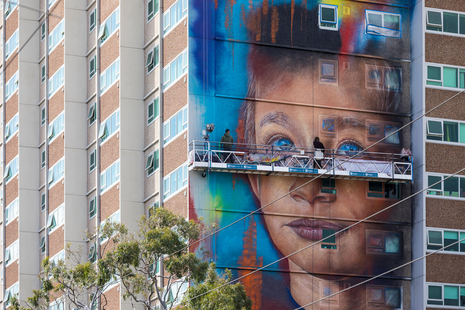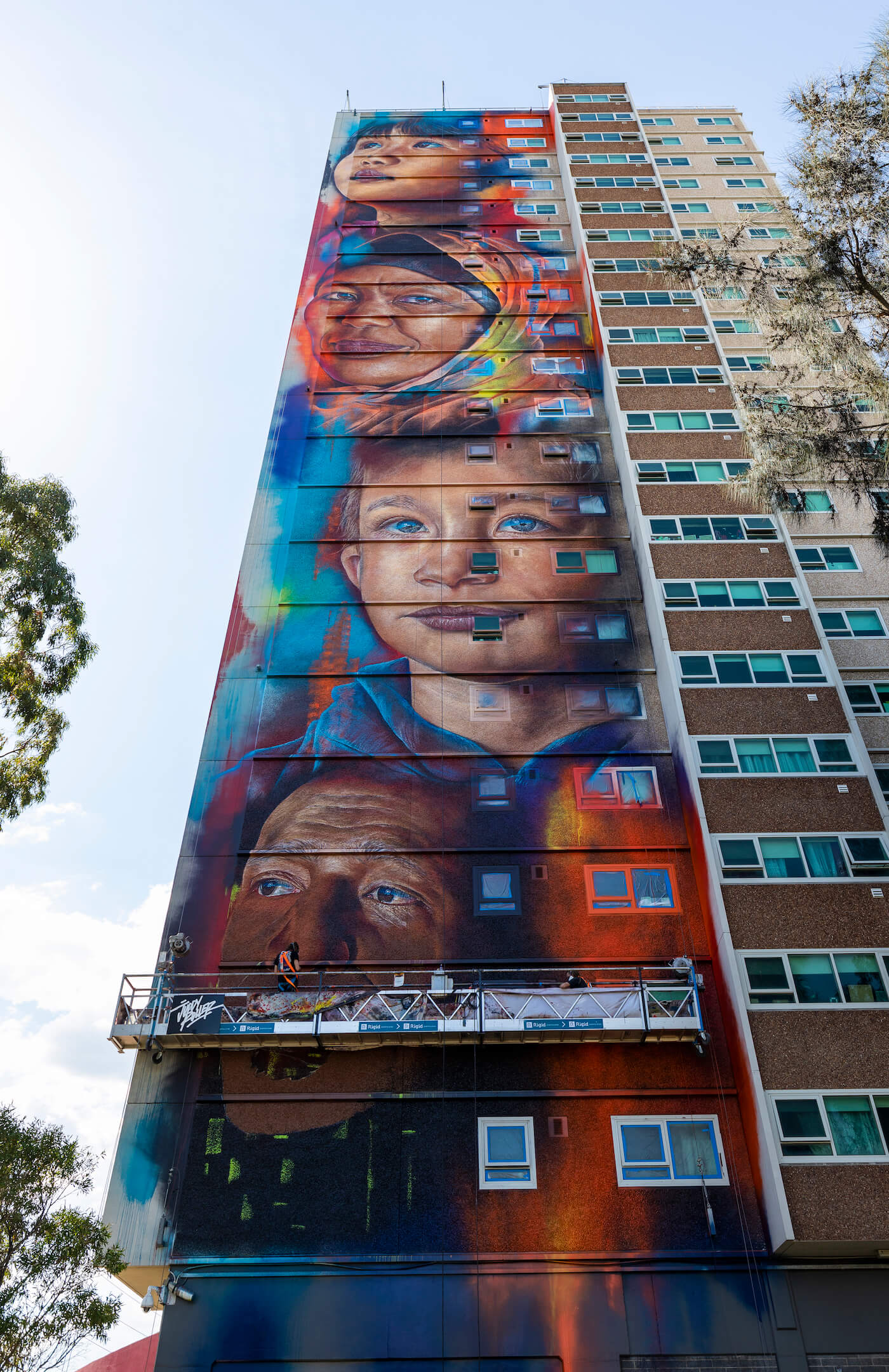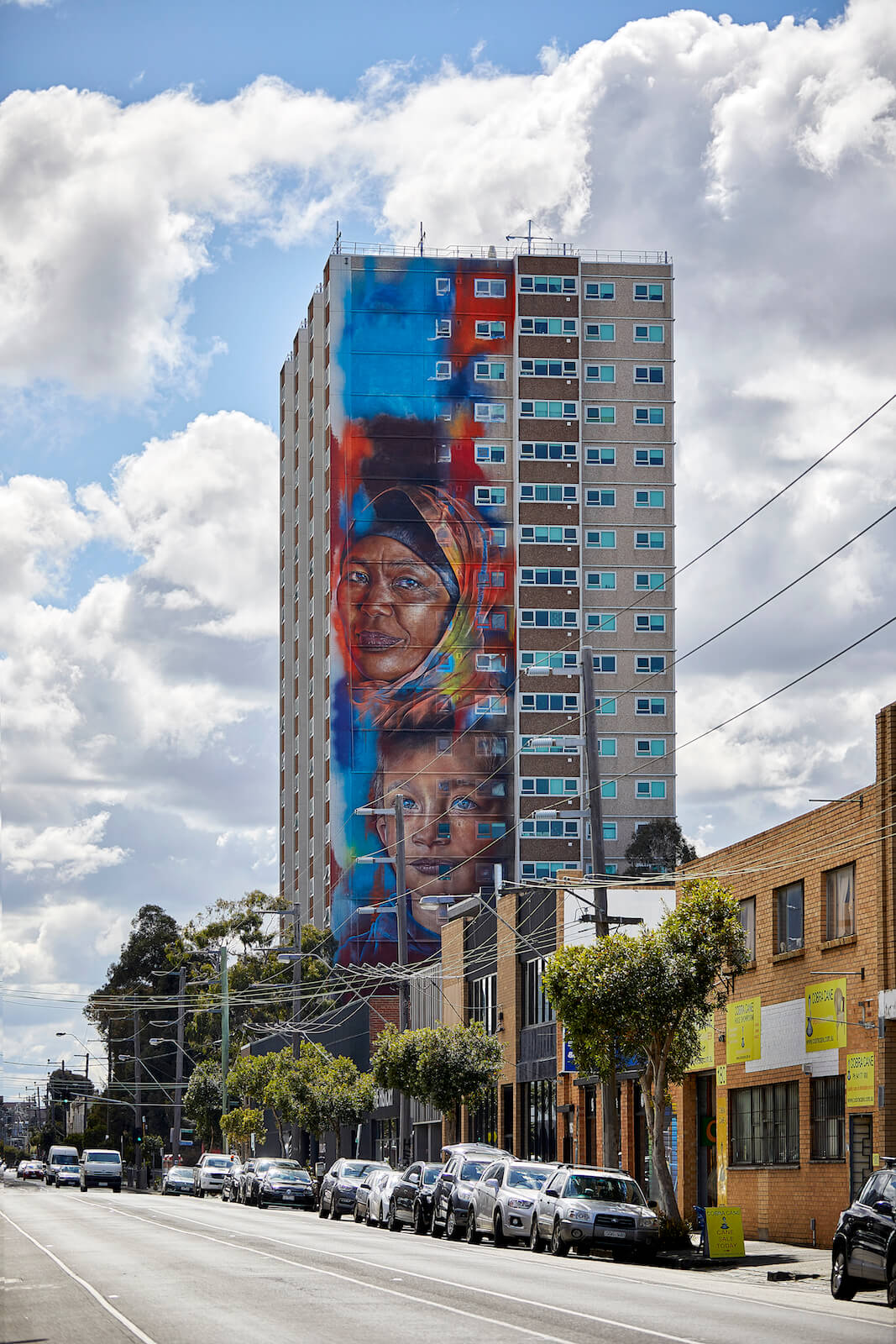 Having grown up in Fitzroy himself, Adnate has relished the opportunity to work with the local community — in particular, Collingwood Neighbourhood House, to ensure that the mural is an authentic representation of the Collingwood Housing Estate precinct and its residents.