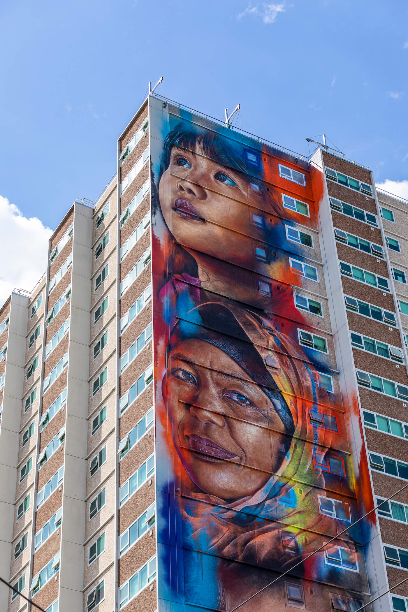 The work takes up the entire city-facing wall of one of Collingwood Housing Estate’s three 20-storey, 220-apartment tower blocks. The work profiles four of the estate’s residents and seeks to celebrate the multicultural community that calls the estate home.