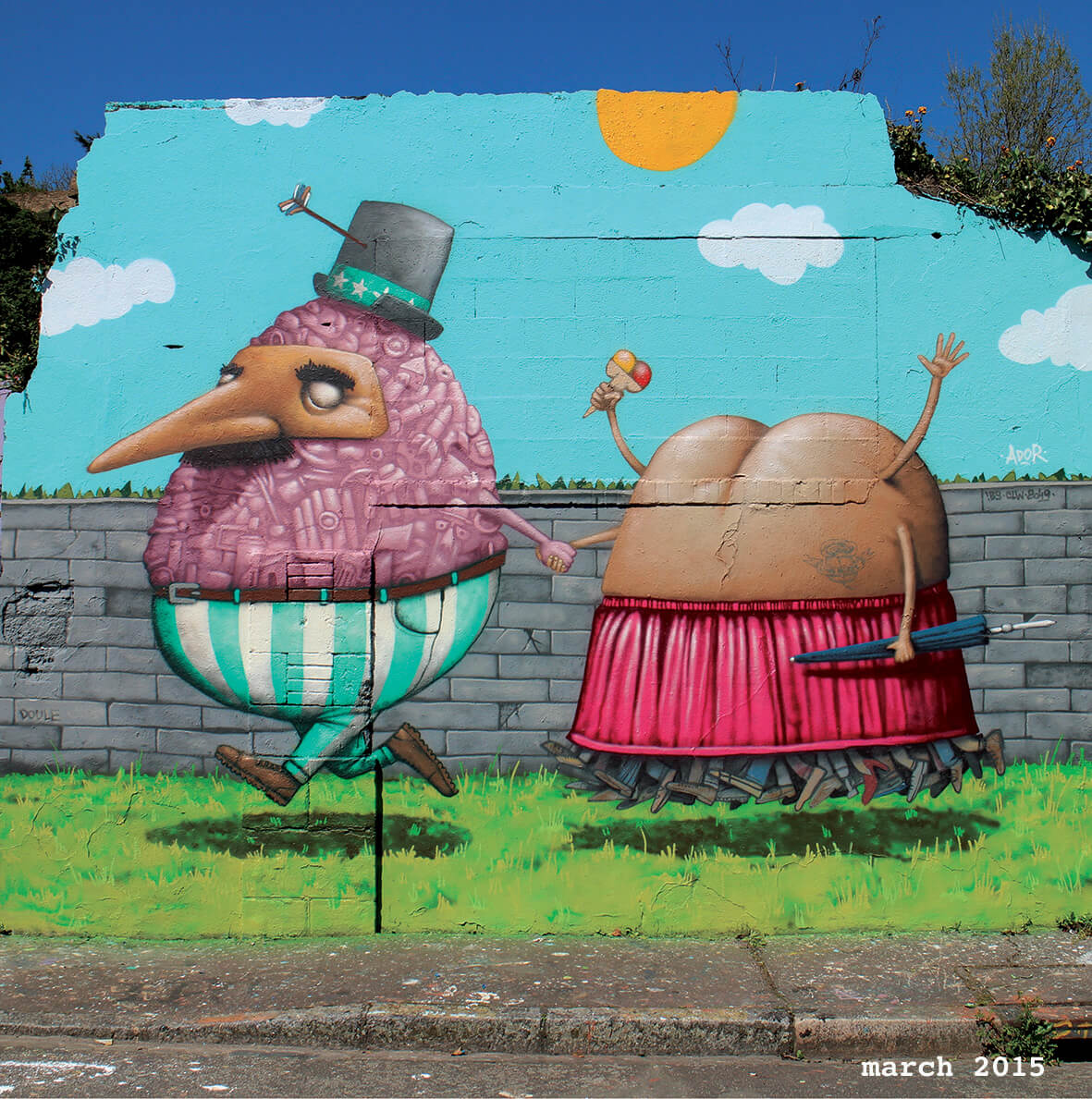 ADOR is a french street artist from Nantes, who creates murals of large-scale with imaginative humanoid characters. The wall is in his hometown of Nantes and during the past 12 months Ador has taken us through the seasons from Winter 2014 through to Autumn 2015 with his thought-provoking art.