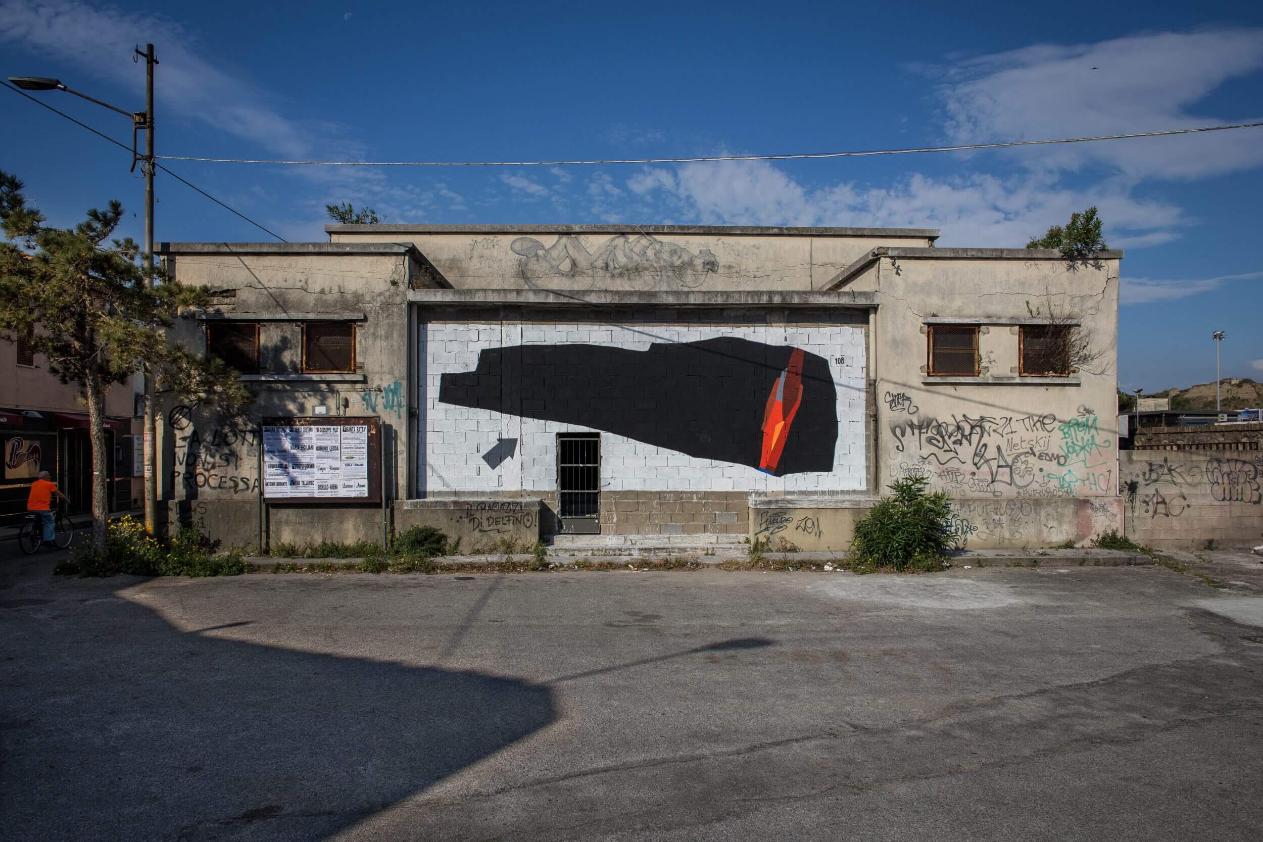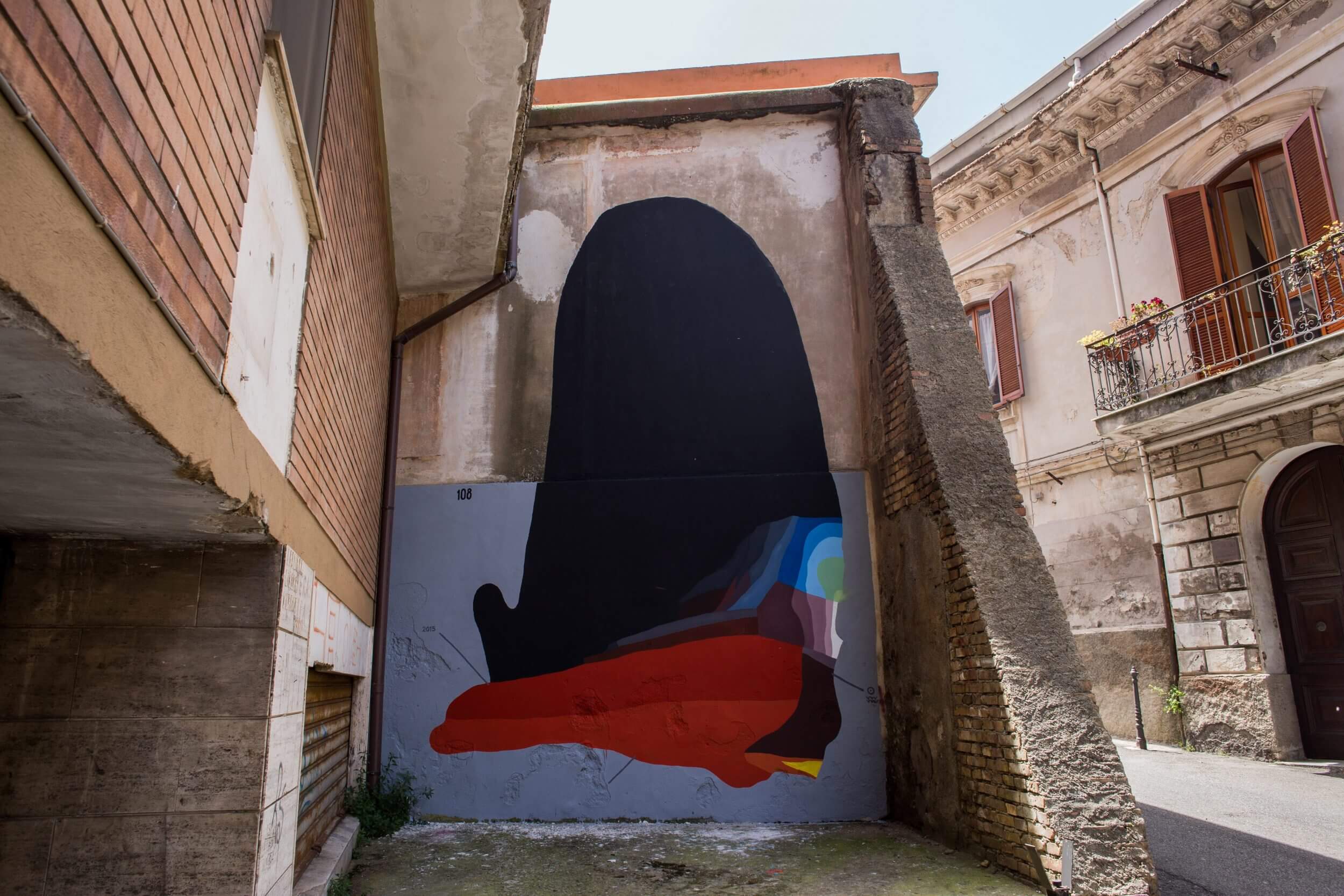 108 first mural is titled ‘Derealizzazione Improvvisa’ which translates to ‘Sudden derealisation’ and can be found in Via Ciacci in Catanzaro . The great Italian interpreter mural was situated on a blind alley and coincides with the entrance to the ancient city. This entry is the only one present and takes on a symbolic value to the rediscovery of a forgotten beauty. Unfortunately today it is a state of neglect so artist 108 is giving the entry the facelift the city deserves.