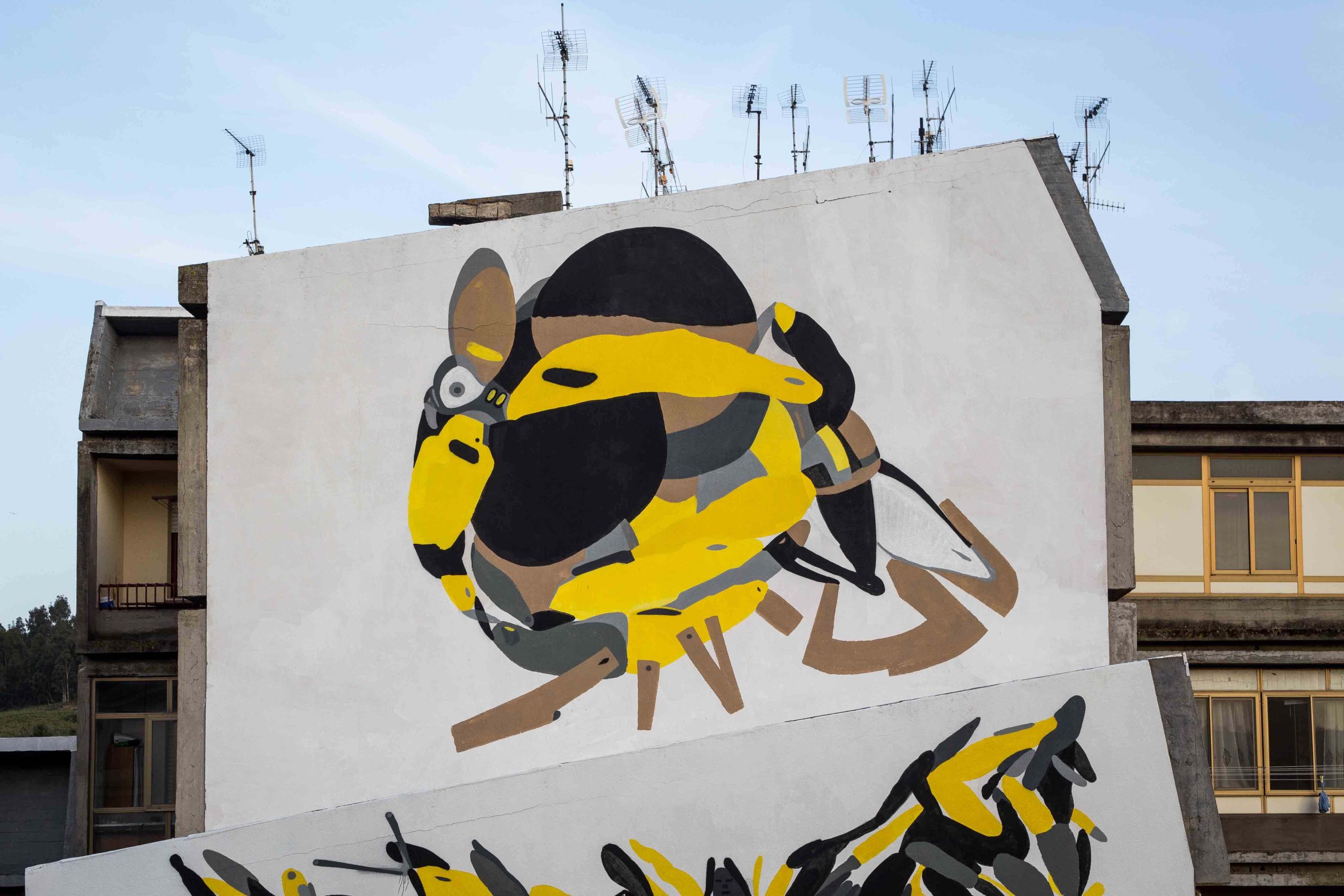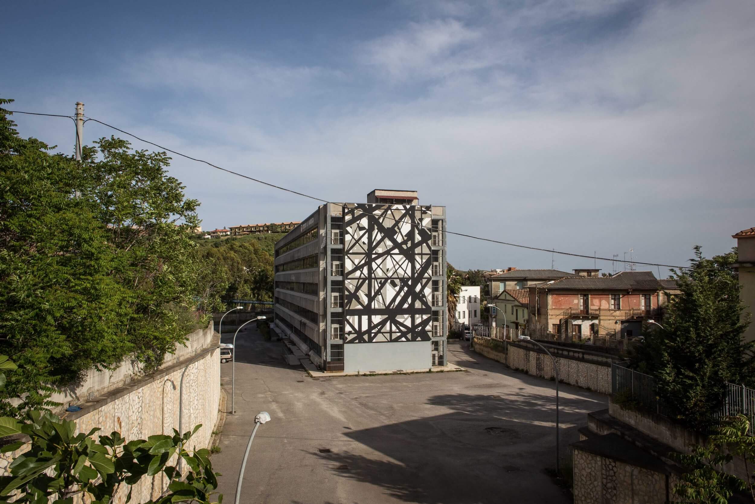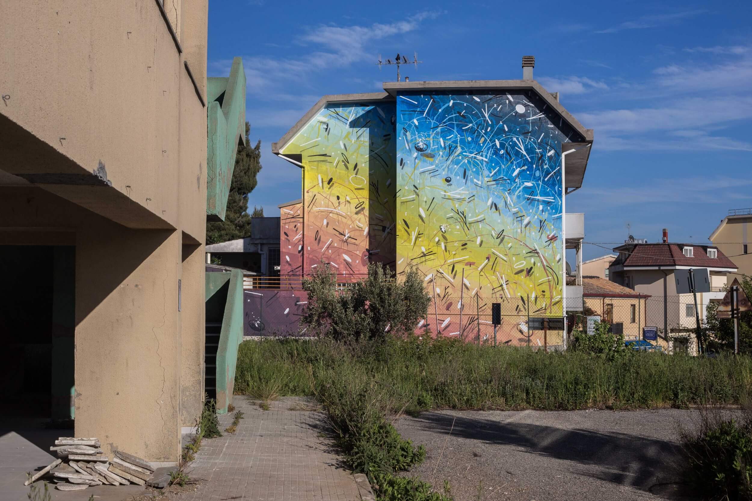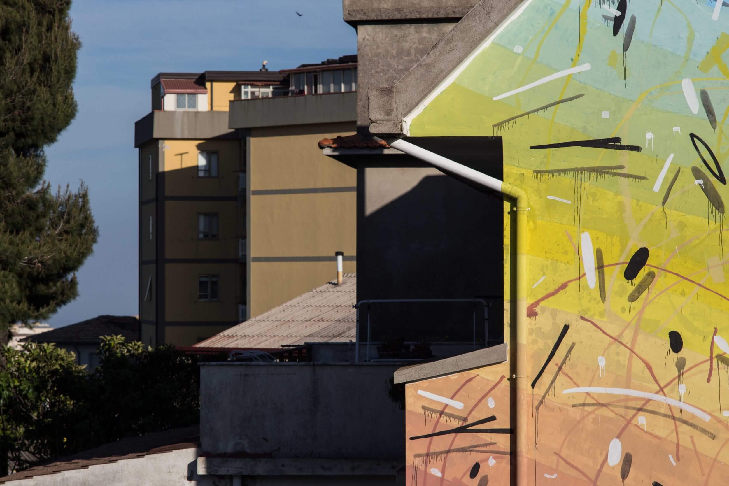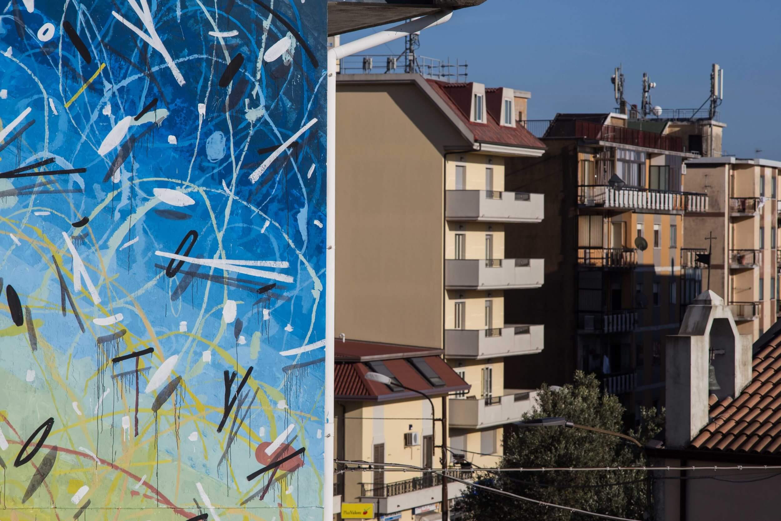 Tellas is back in Catanzaro with “Profondo Sud”, a personal work in Materdomini district, within walking distance from Alberonero’s wallpainting. Tellas describes the mural as a gradient running and organic where nature can explode and throw up its fragments. Made on a private building located next to the Academy of Belle Arti, the work will provide new insights for professors as well as stimulate the creativity of students who work opposite.