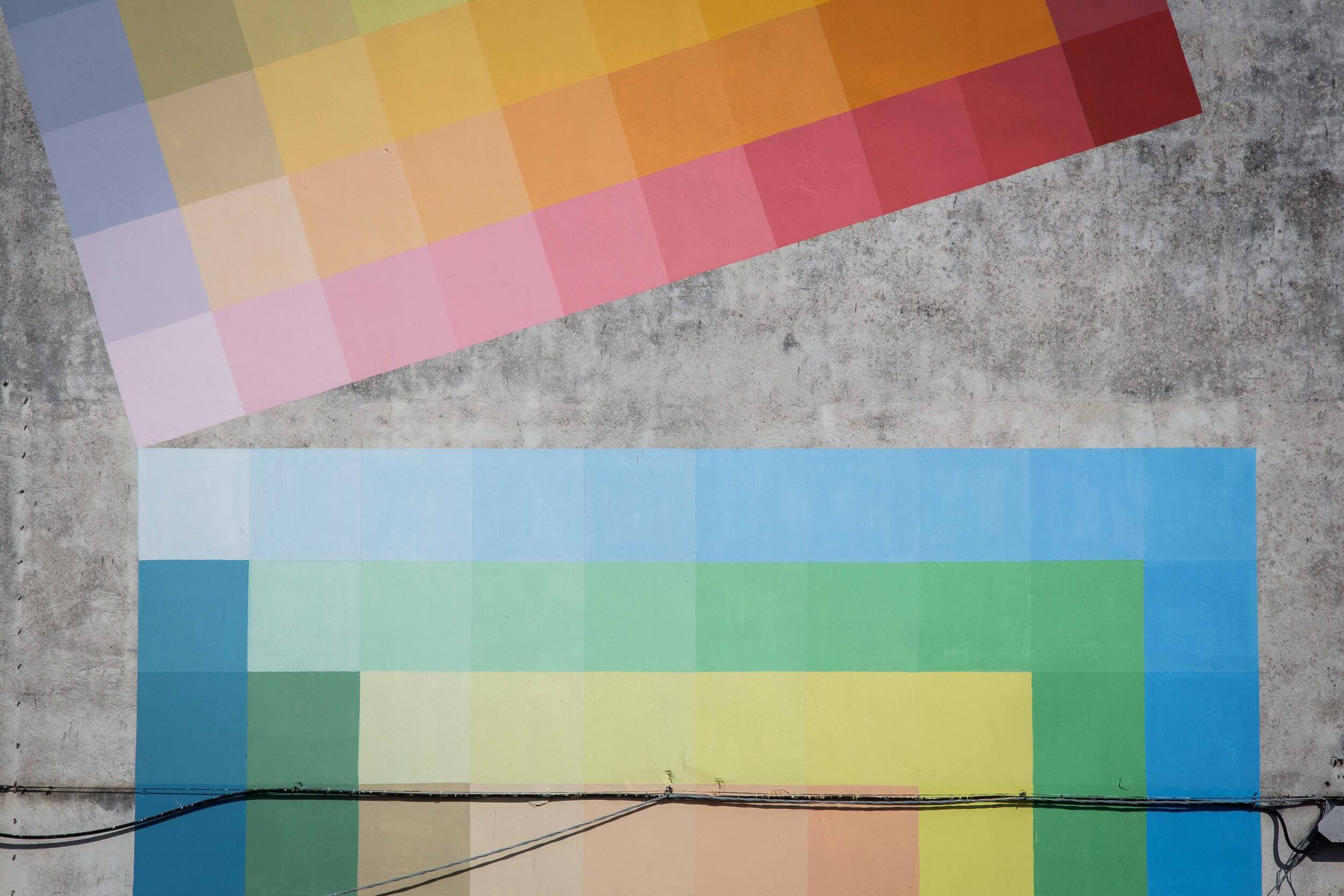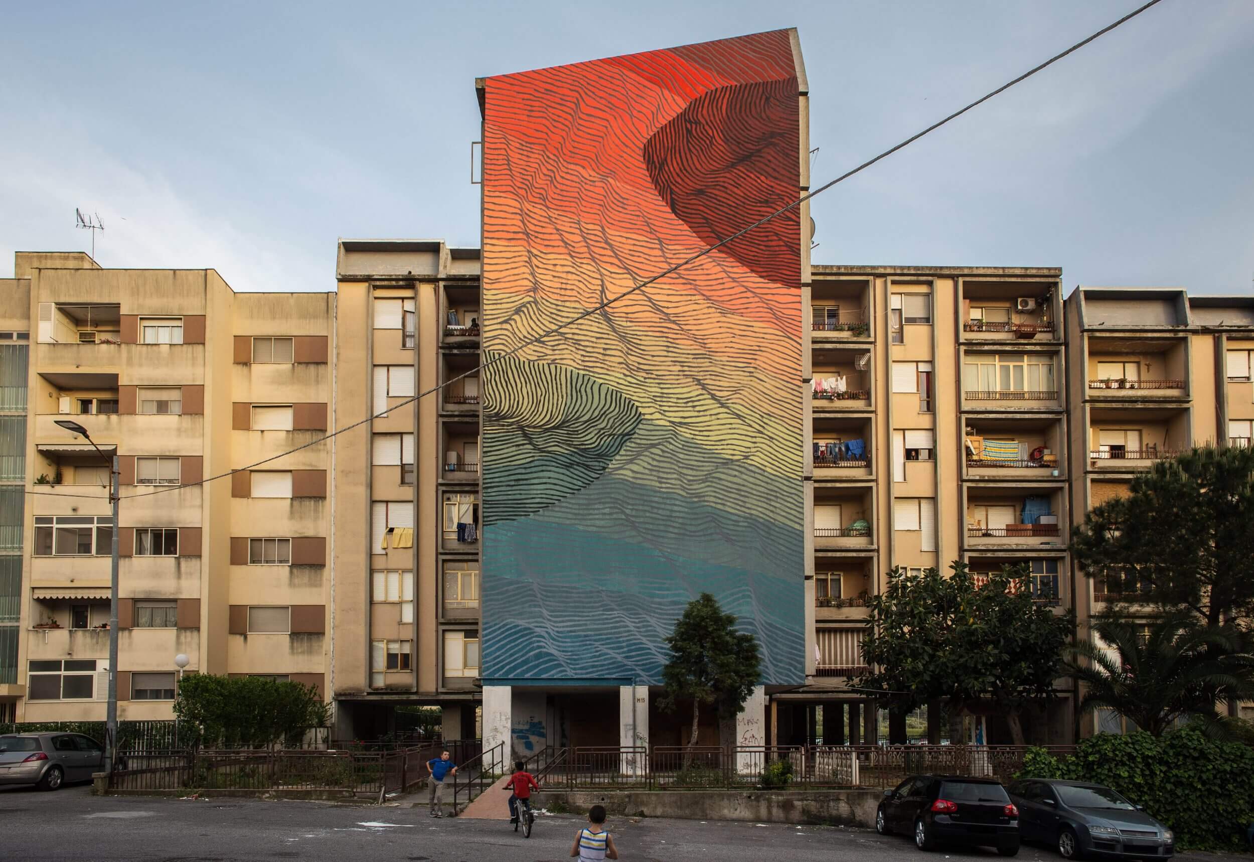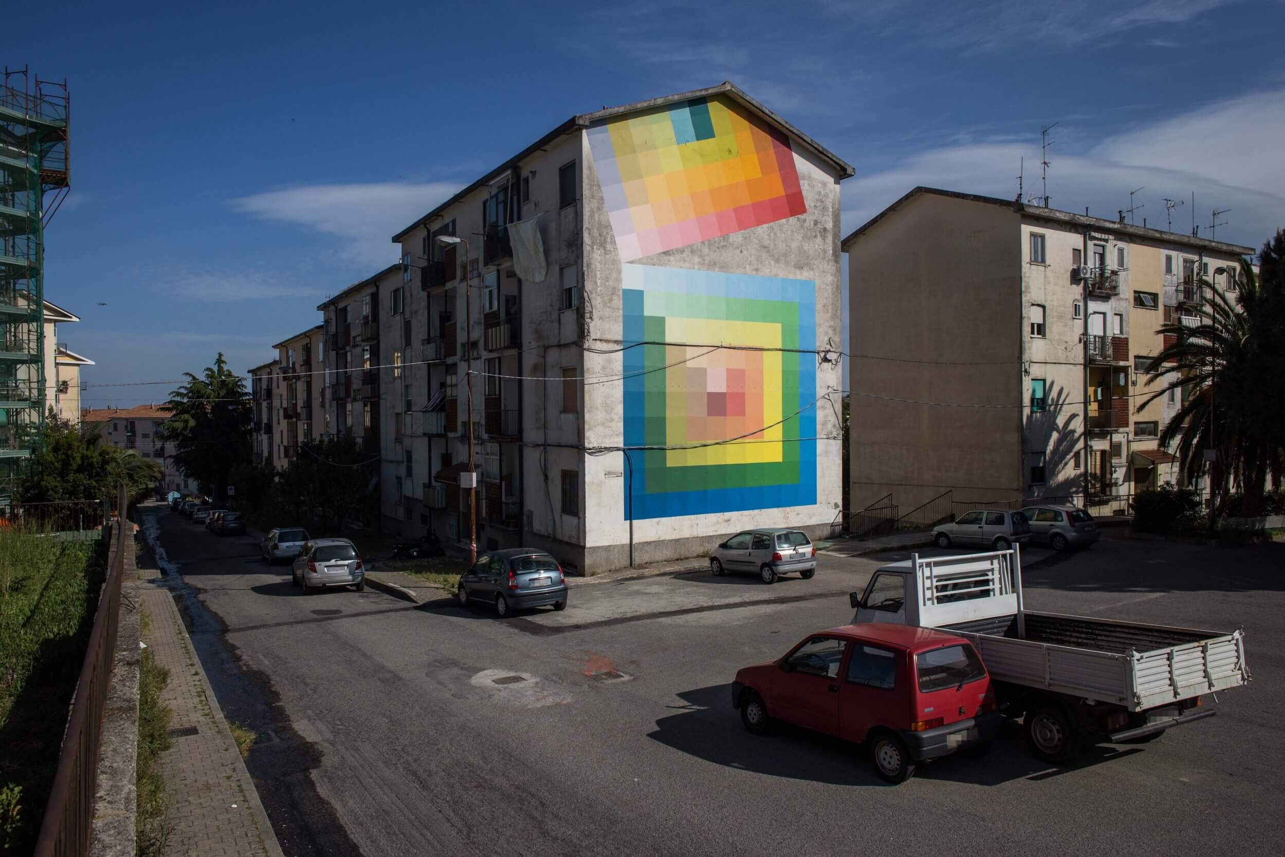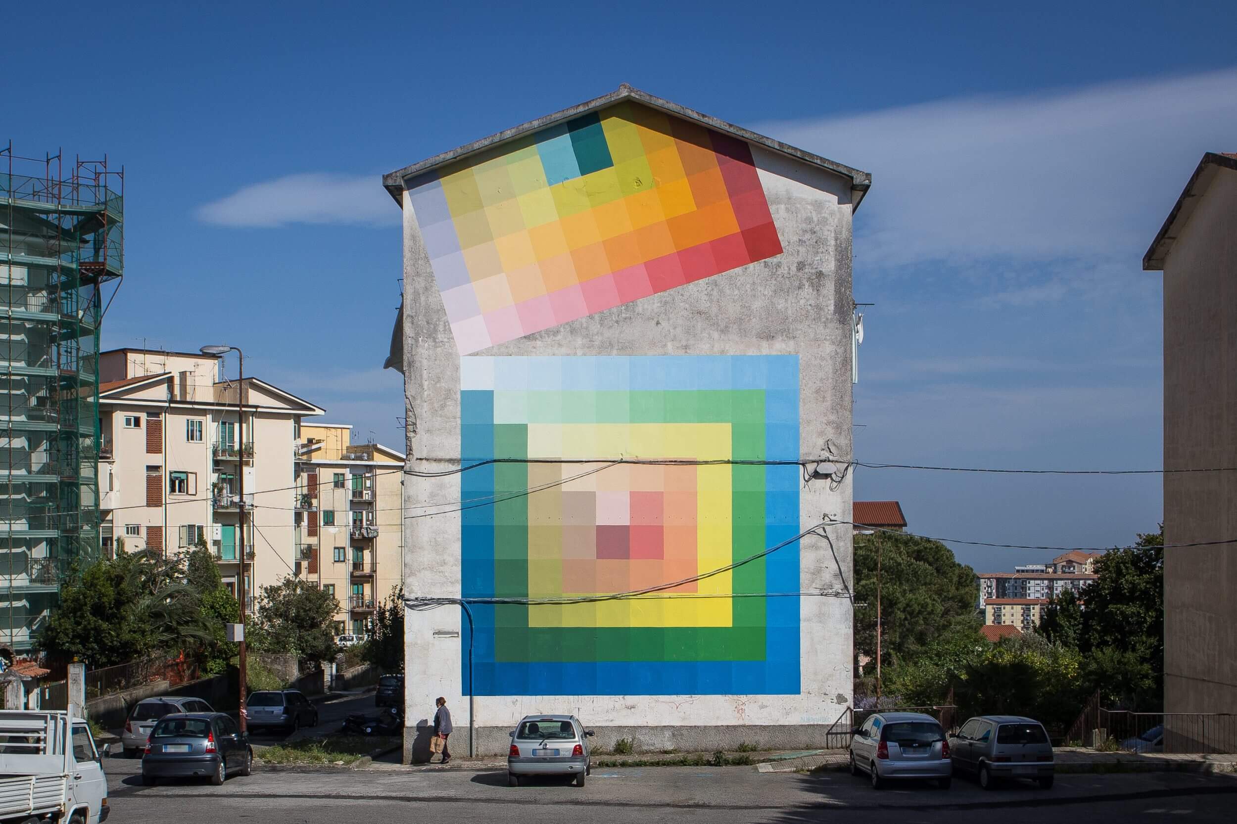 Alberonero street mural can be found in Dante Square in the Materdomini district of Catanzaro. Alberonero painted over the inscription “Porco Benvenuto”. These words have been painted forty years ago and to reach to the top the men made a human ladder. So to honour the challenge of the men Alberonero used one hundred and fifty eight different colours that orderly move from cold to hot colours on a sloping level. These colours strengthen the relationship between architecture and landscape and honours the history of the wall.