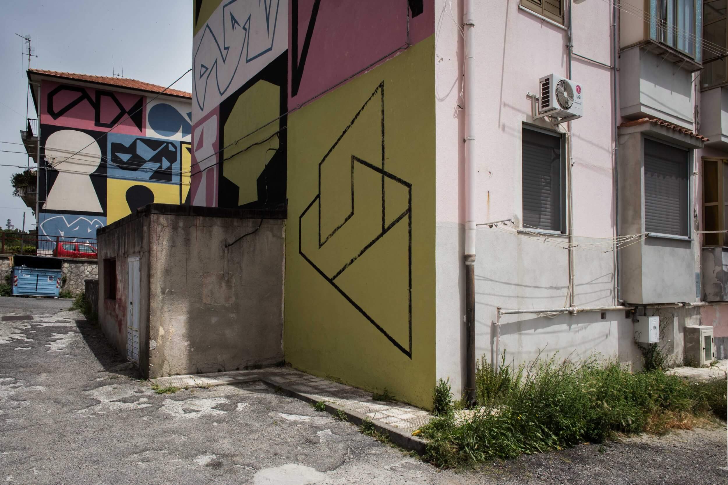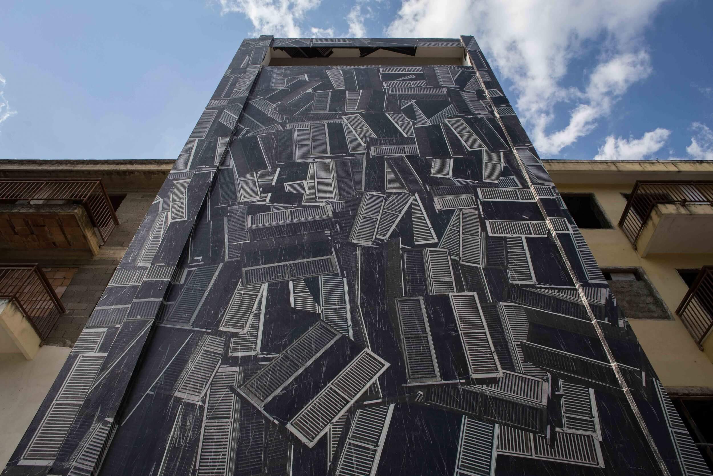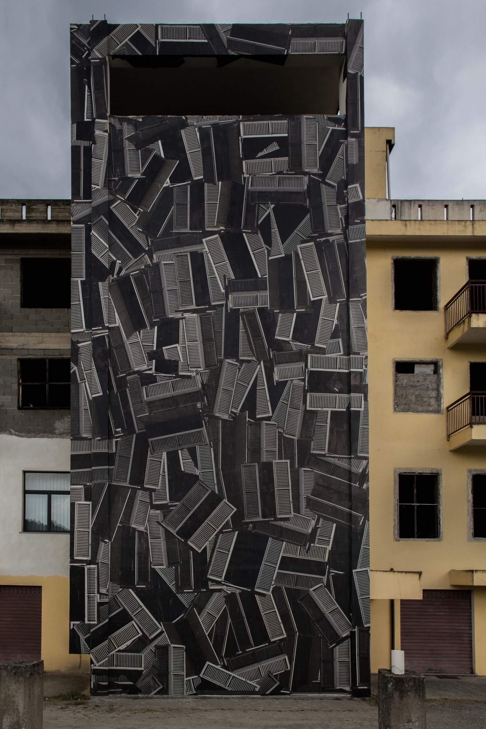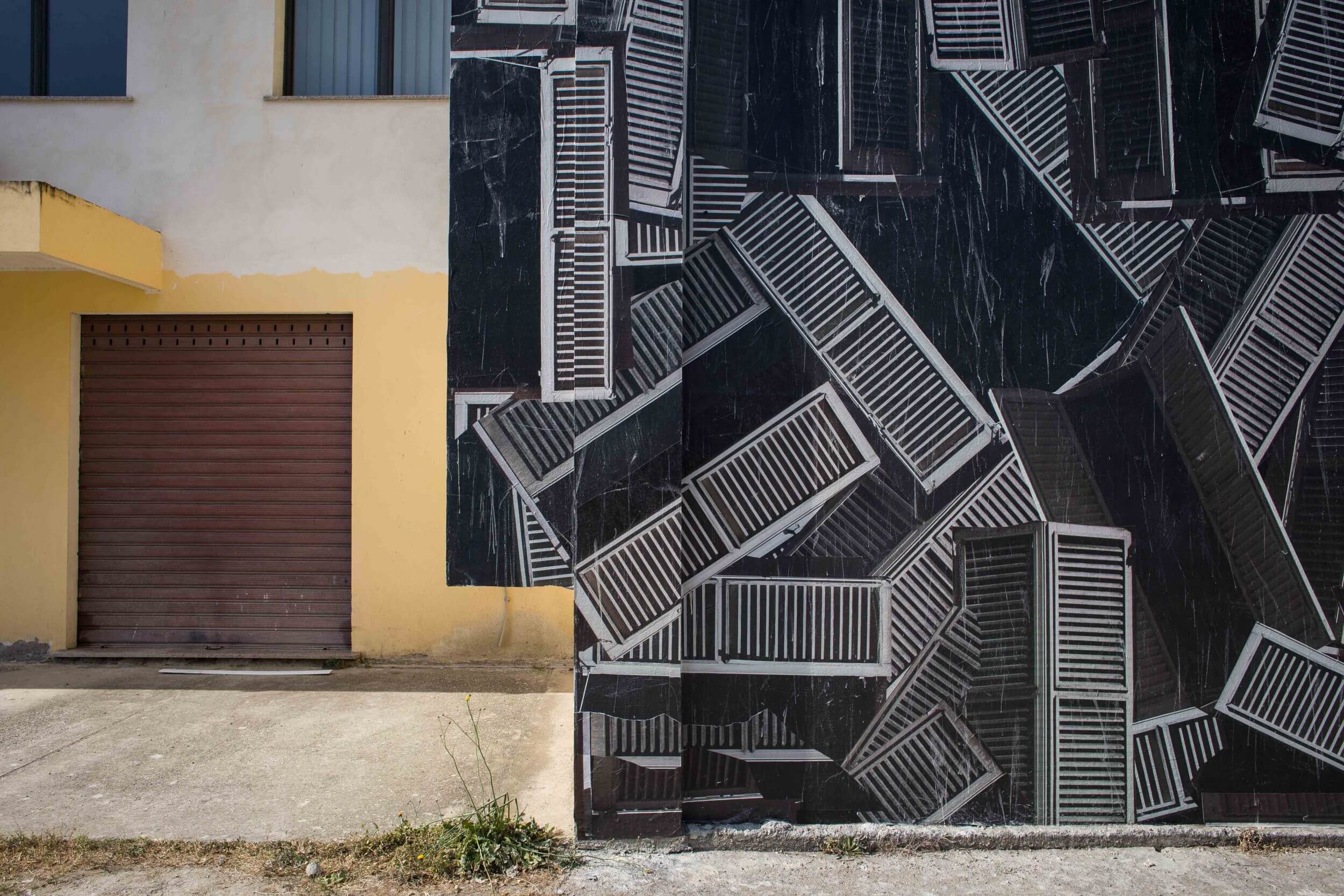 Sbagliato chaotically pastes the iconic window shutter on the wall in Sarrottino, Catanzaro. The mural, conceived in an area of high seismic risk, refers to the social situation in Sarrottino, which Sbagliato describes as new generations, living on the earth, with continual trembles under their feet.