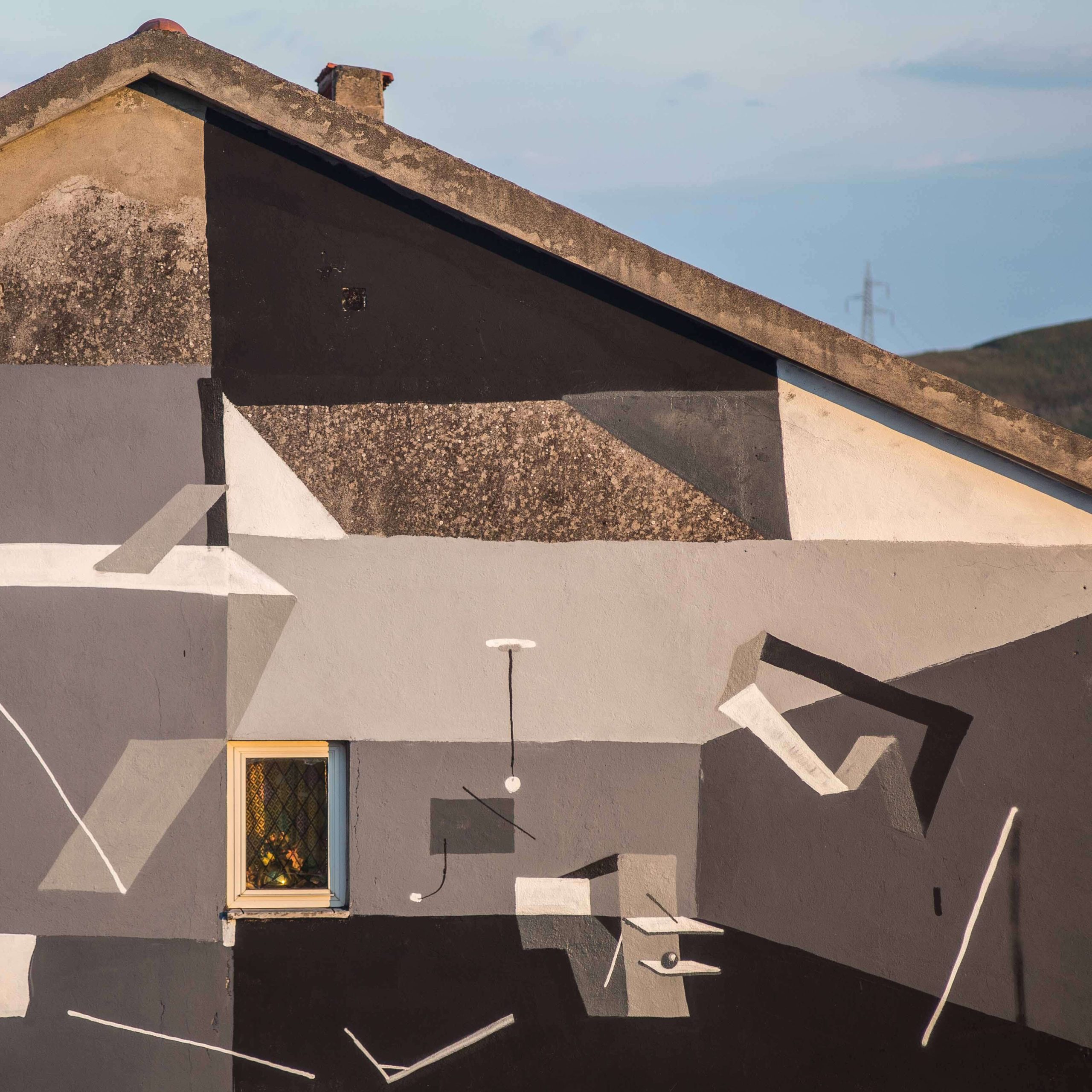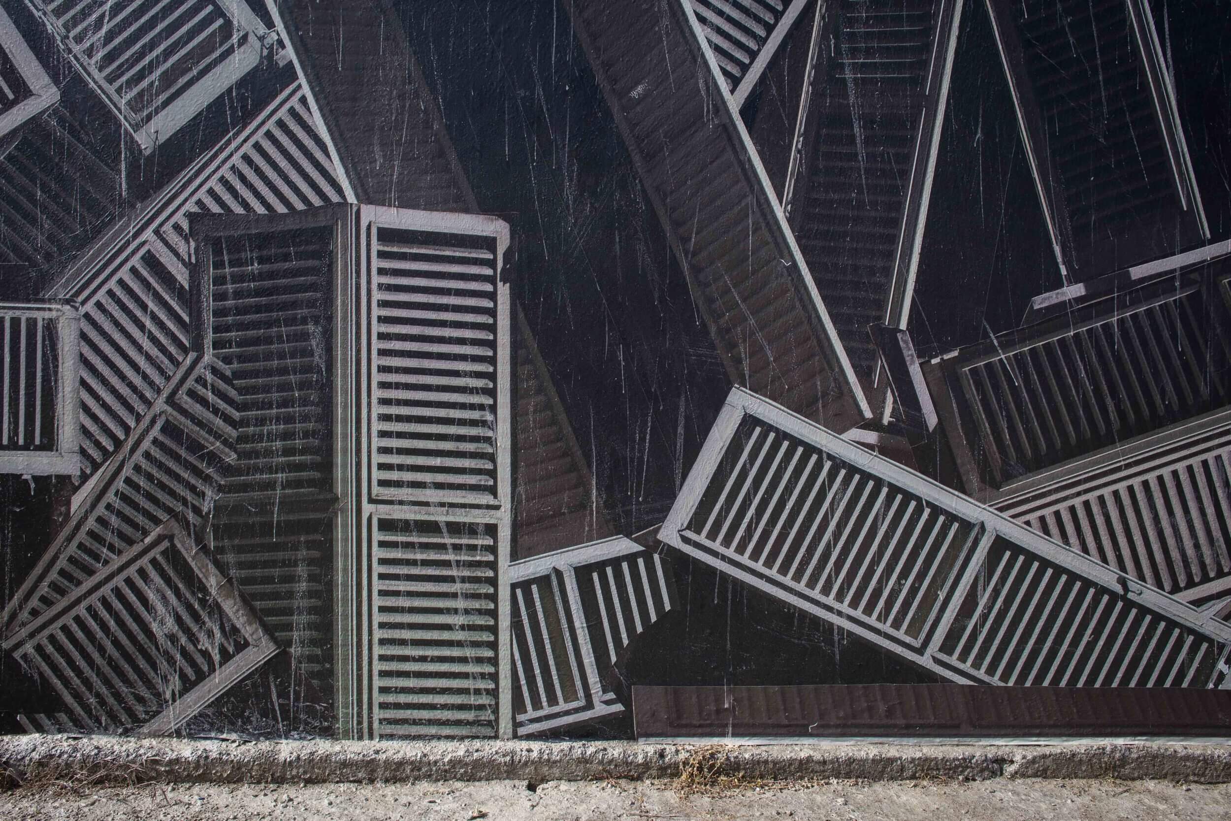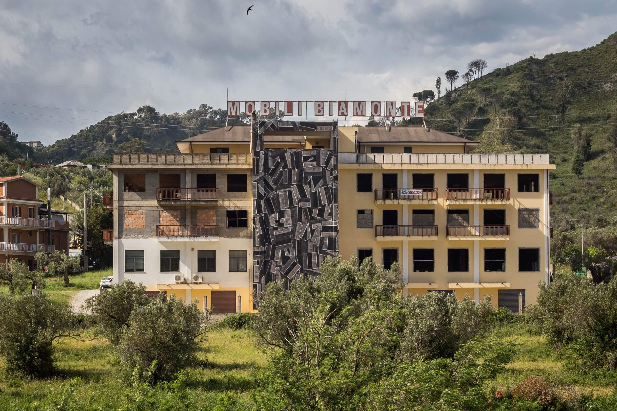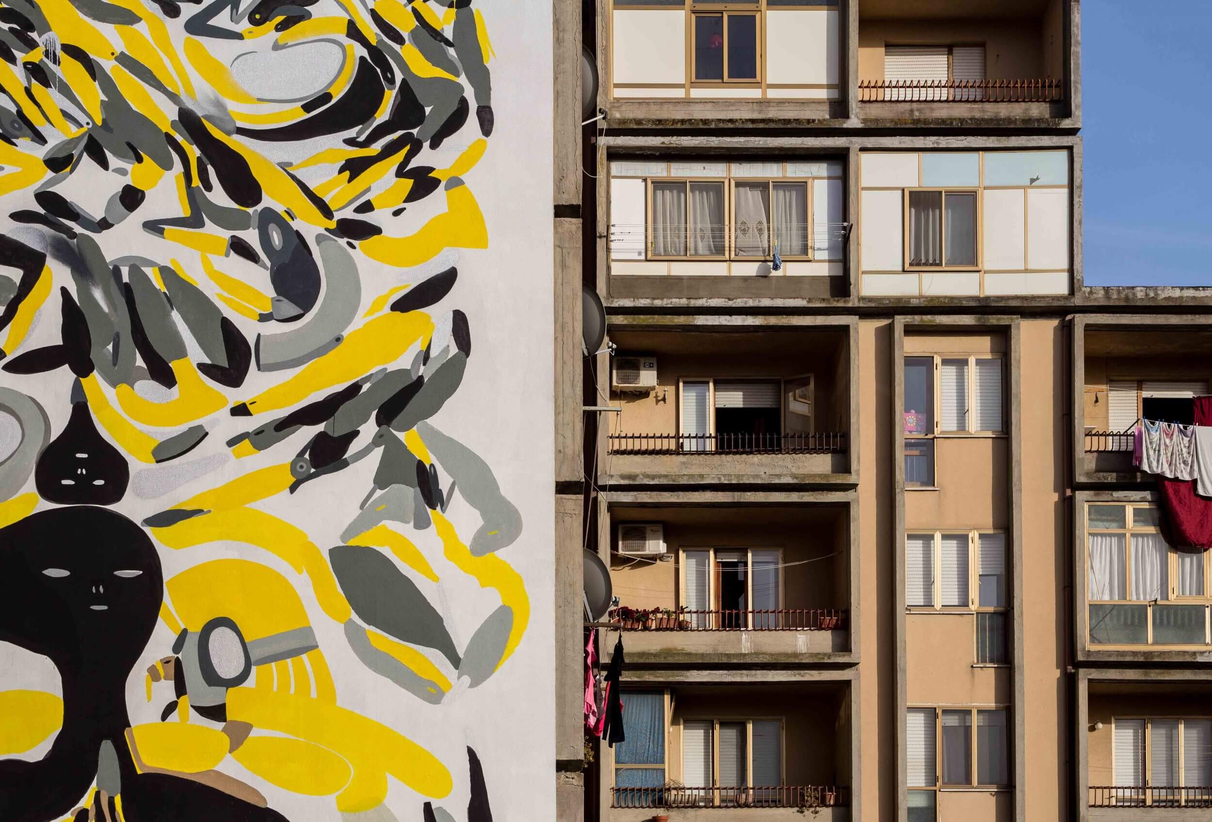 Sbagliato chaotically pastes the iconic window shutter on the wall in Sarrottino, Catanzaro. The mural, conceived in an area of high seismic risk, refers to the social situation in Sarrottino, which Sbagliato describes as new generations, living on the earth, with continual trembles under their feet.