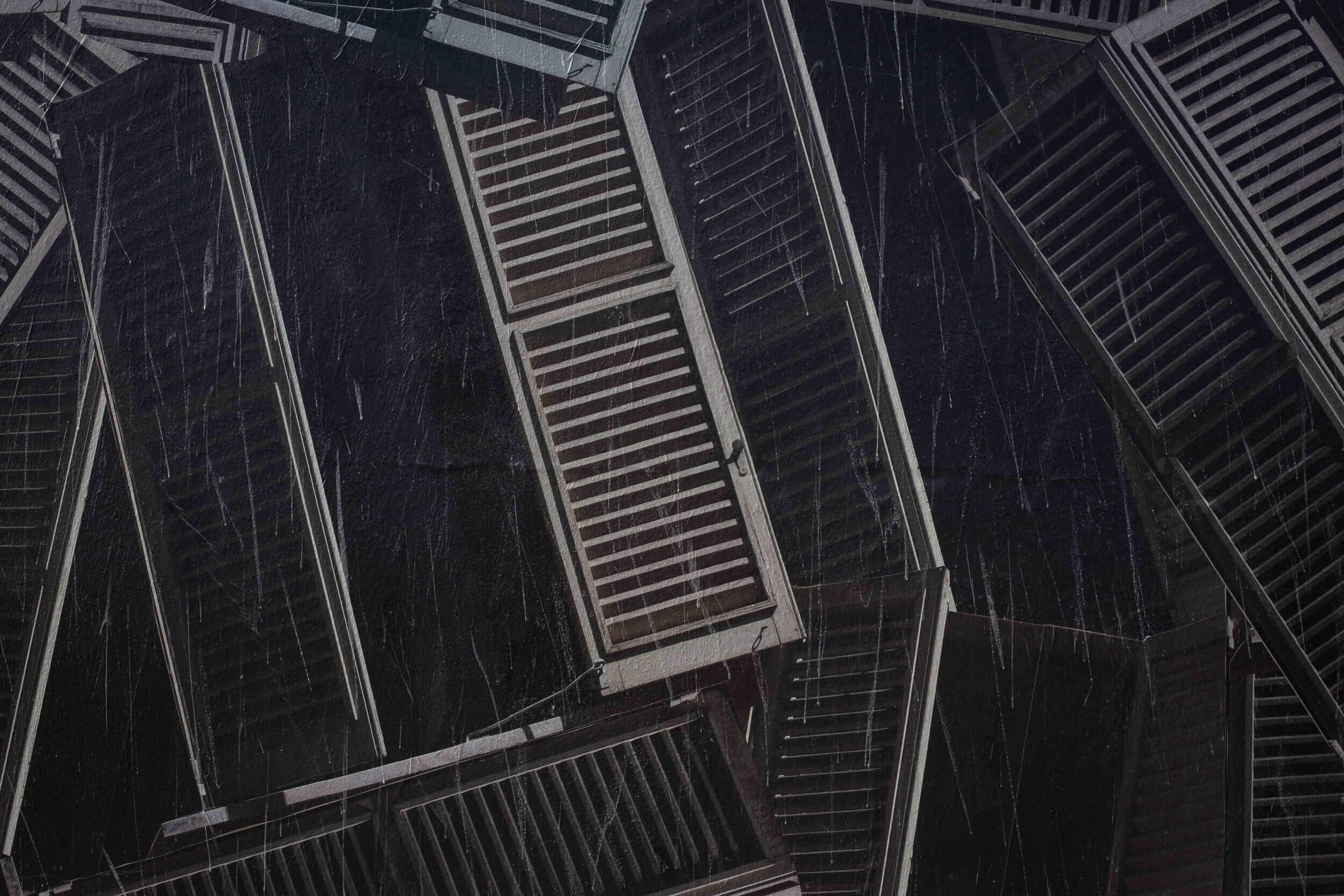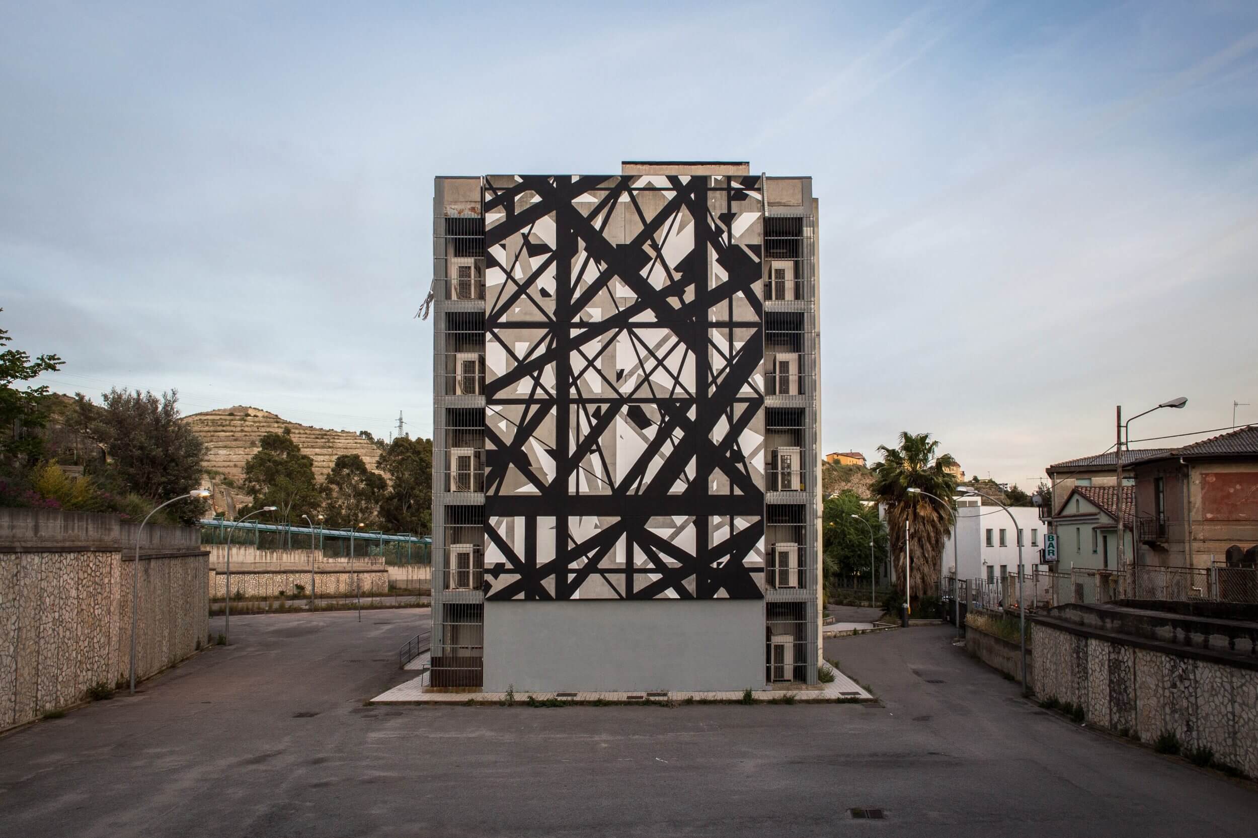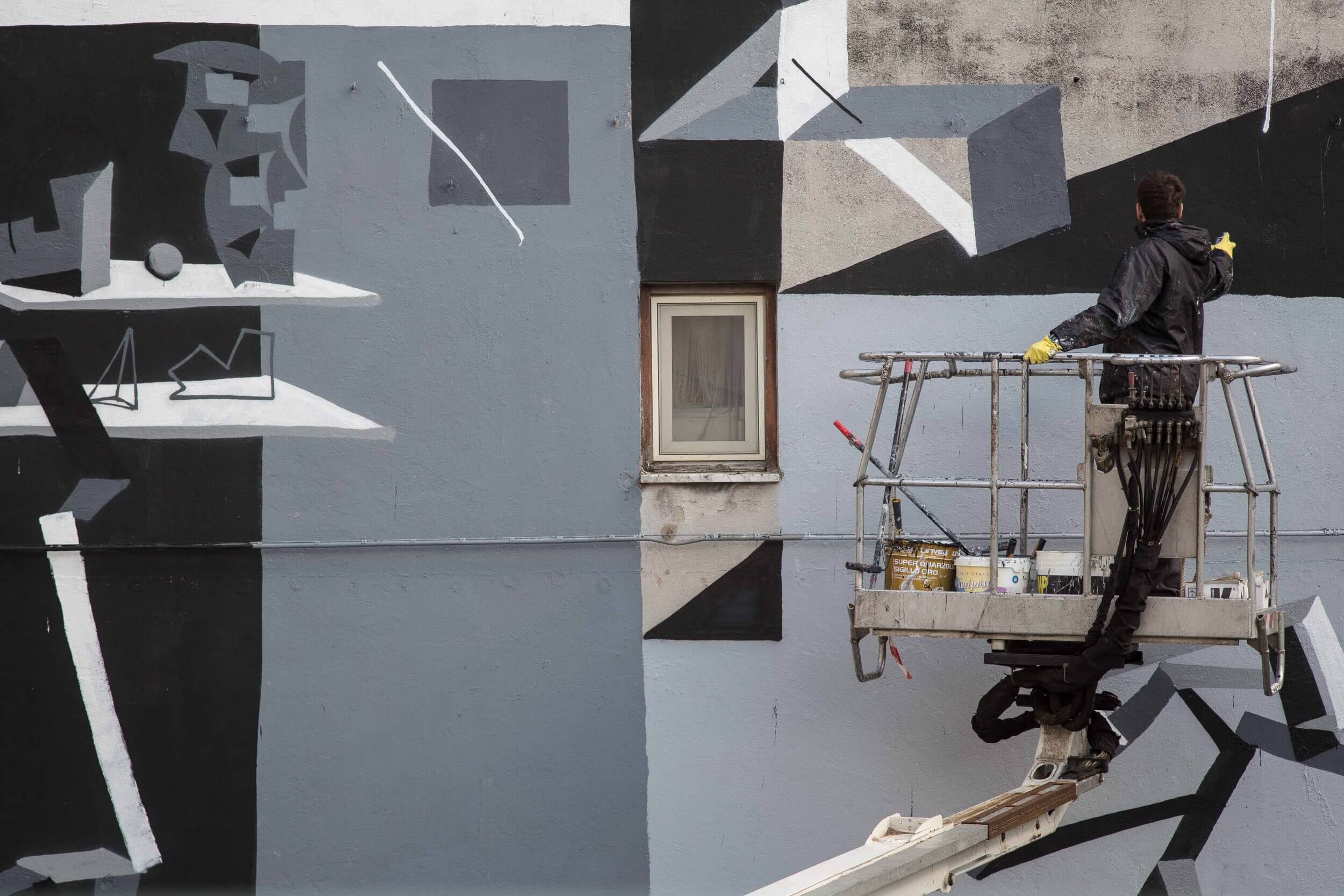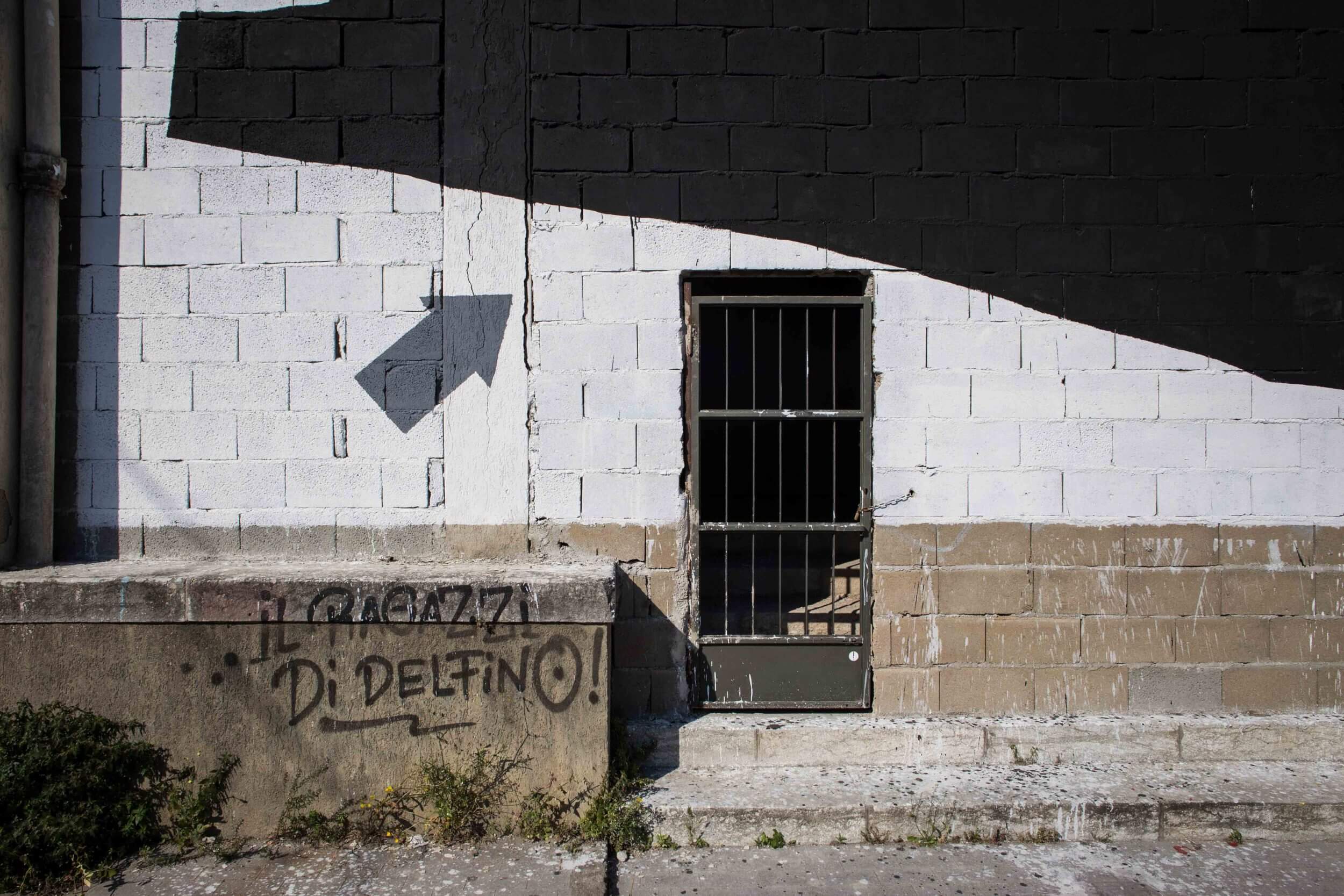 Sbagliato chaotically pastes the iconic window shutter on the wall in Sarrottino, Catanzaro. The mural, conceived in an area of high seismic risk, refers to the social situation in Sarrottino, which Sbagliato describes as new generations, living on the earth, with continual trembles under their feet.