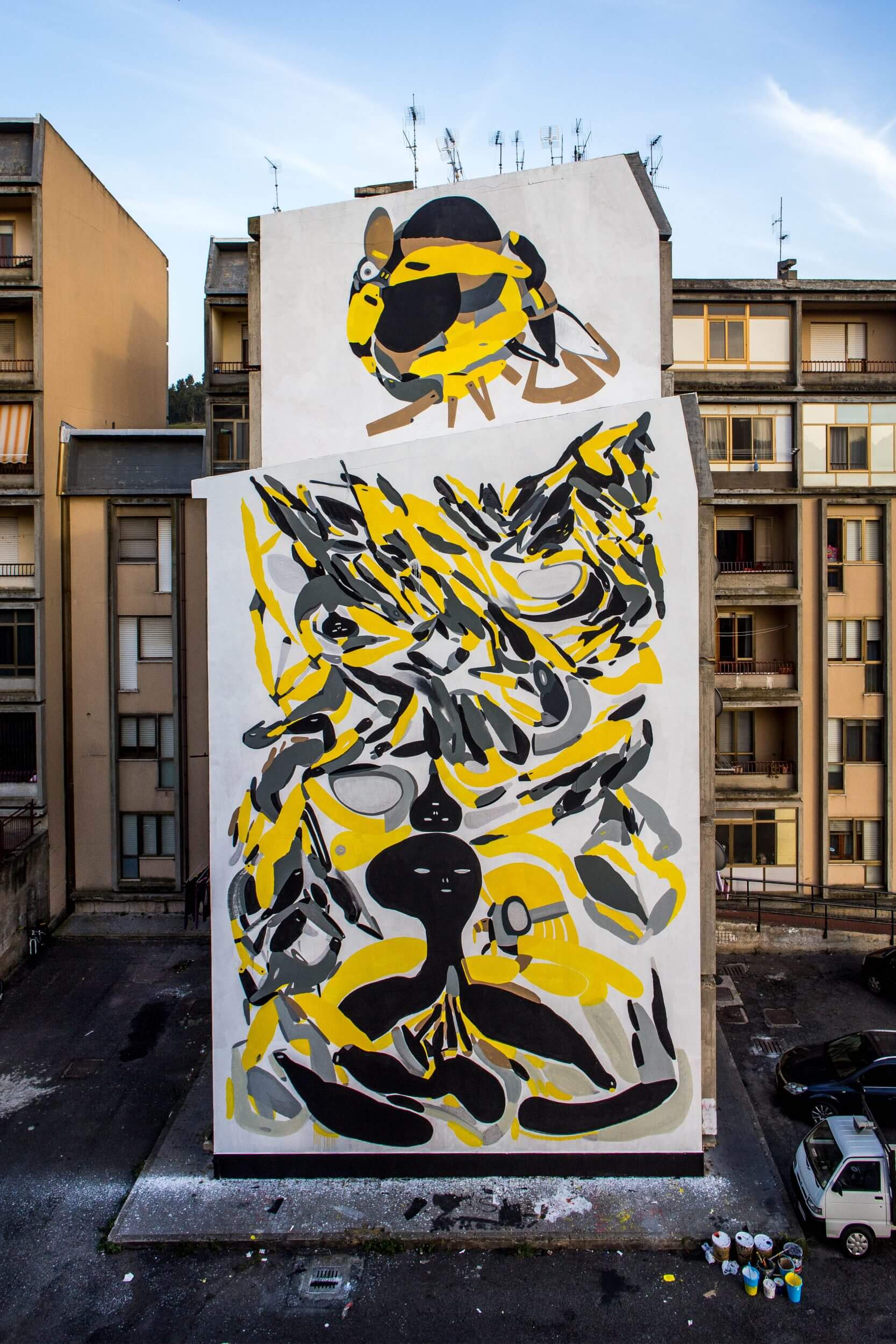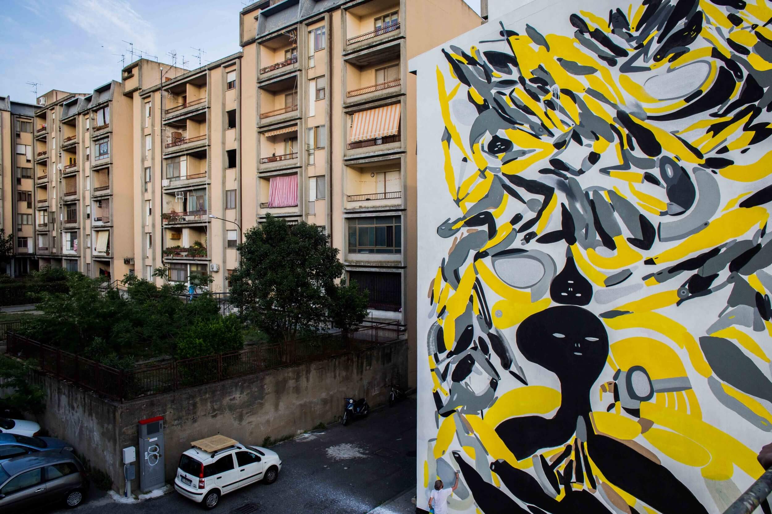 Street artist Jeroen Erosie mural is on the outskirts of Piano Casa, close to the old town of Catanzaro, Erosie has painted a triptych entitled “Linguaggio Universale”. Initially, after three days Erosie finished his diptych, But, the owners of the building wanted more!! Erosie painted an extra 120 square meters in one day with the help of the locals car headlights cars and Catanzaro football team’s scarves as inspiration.