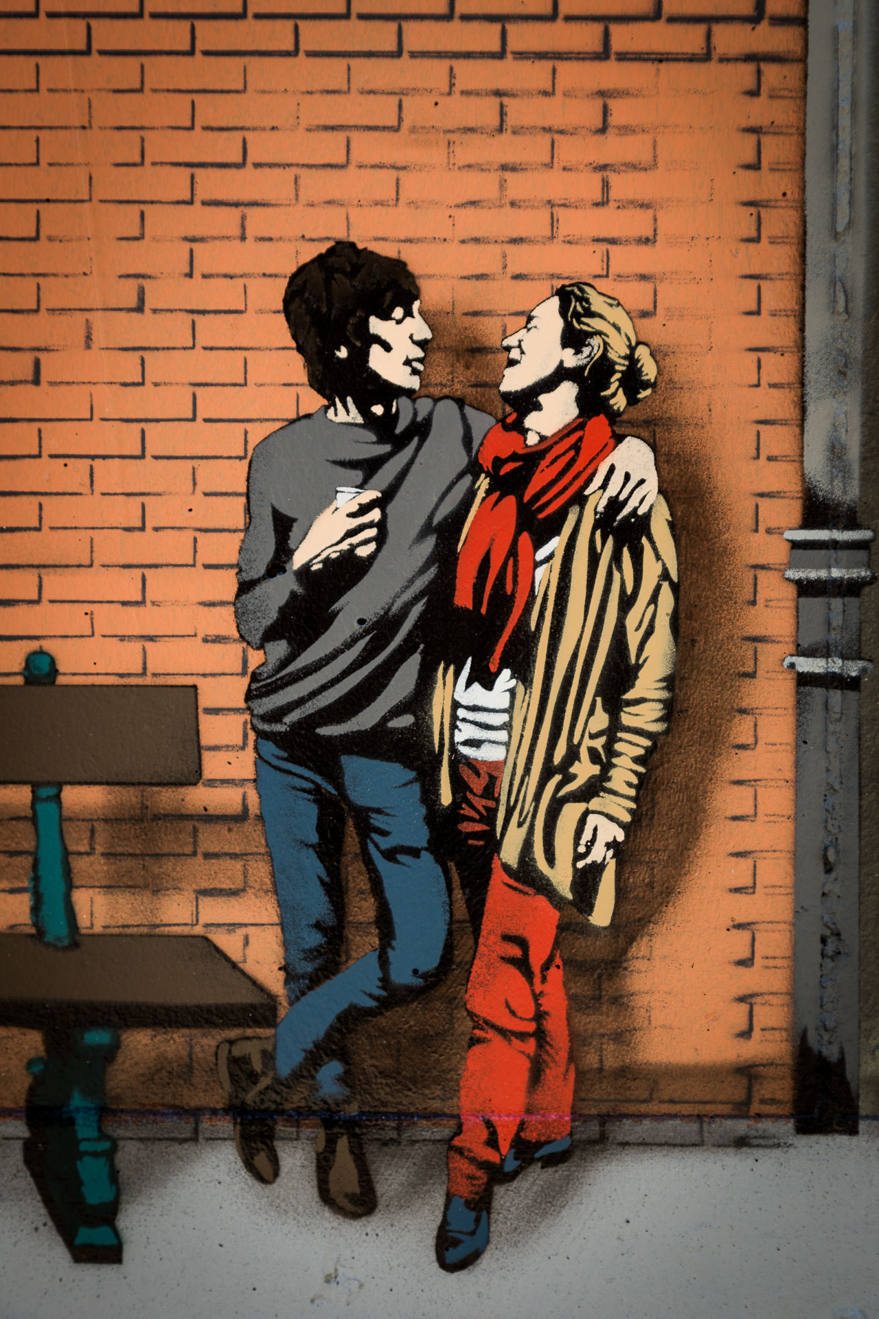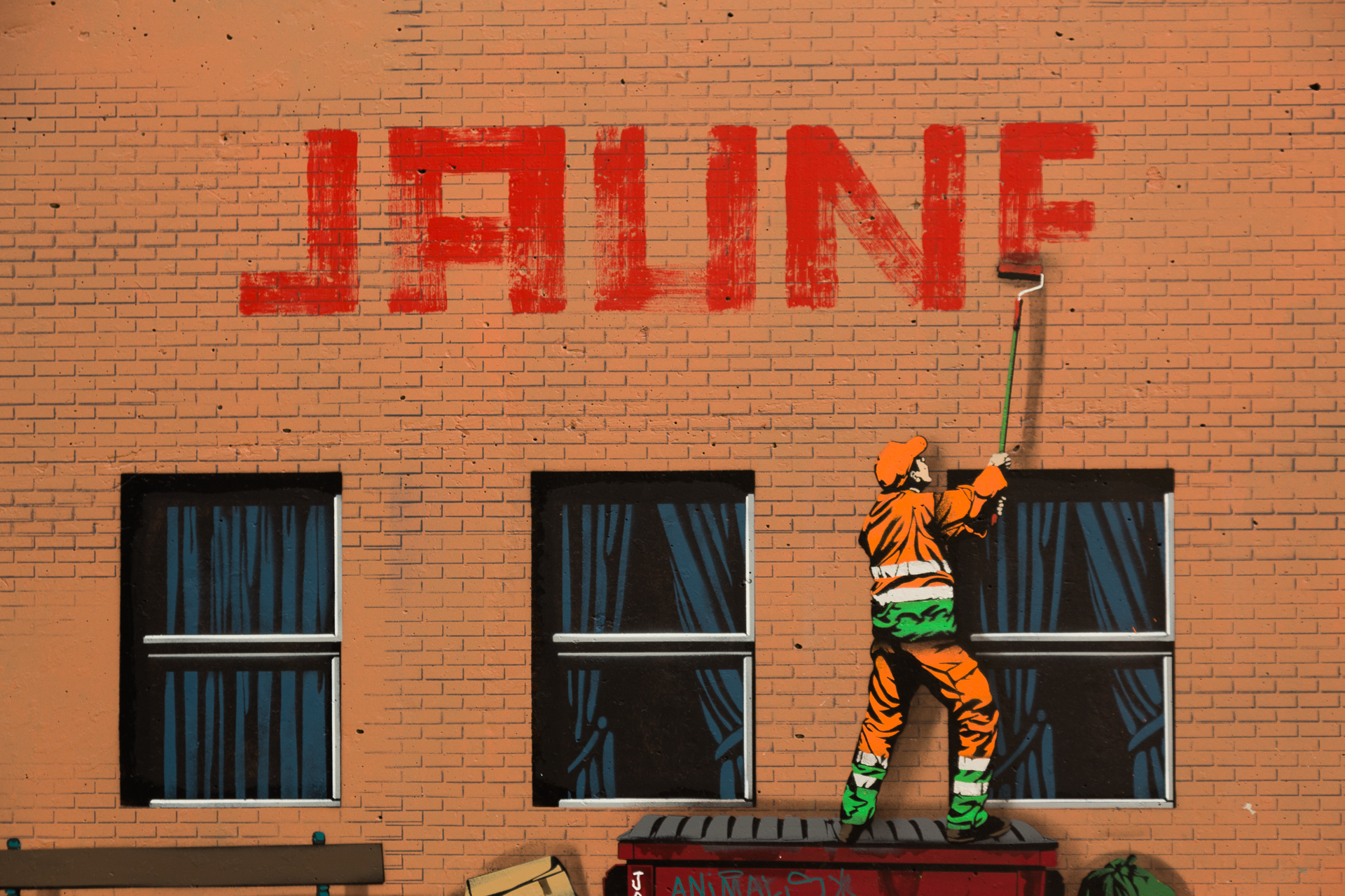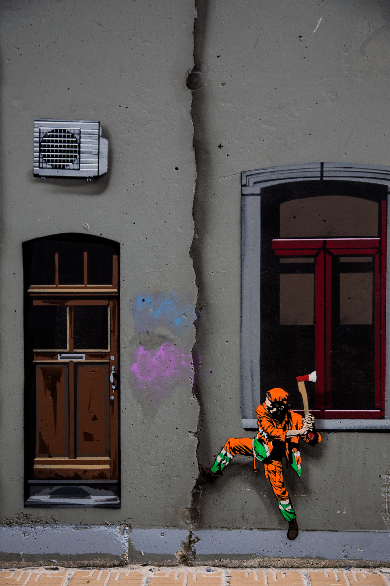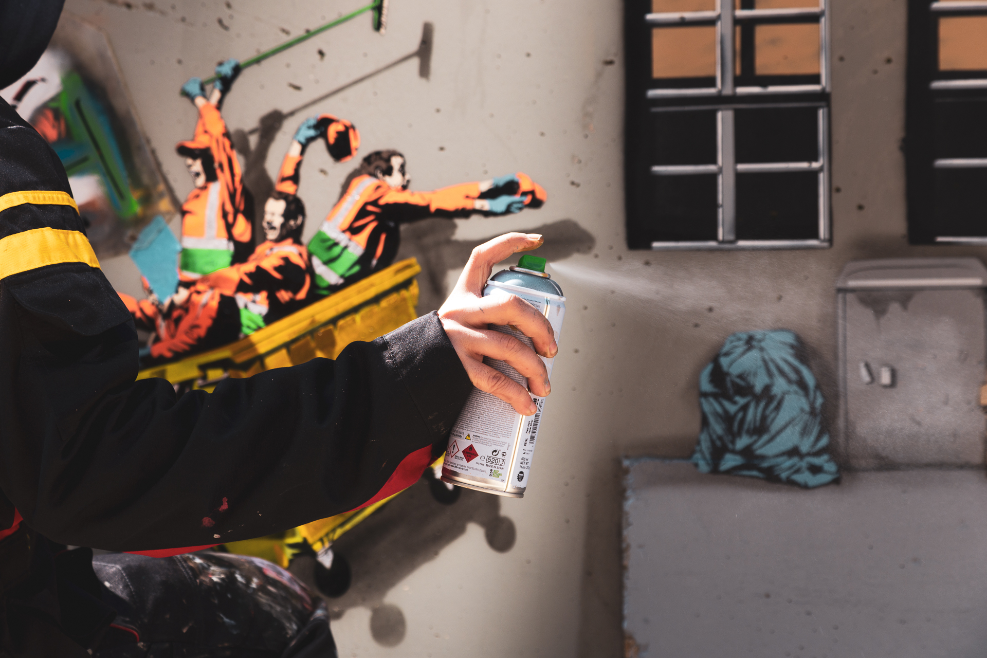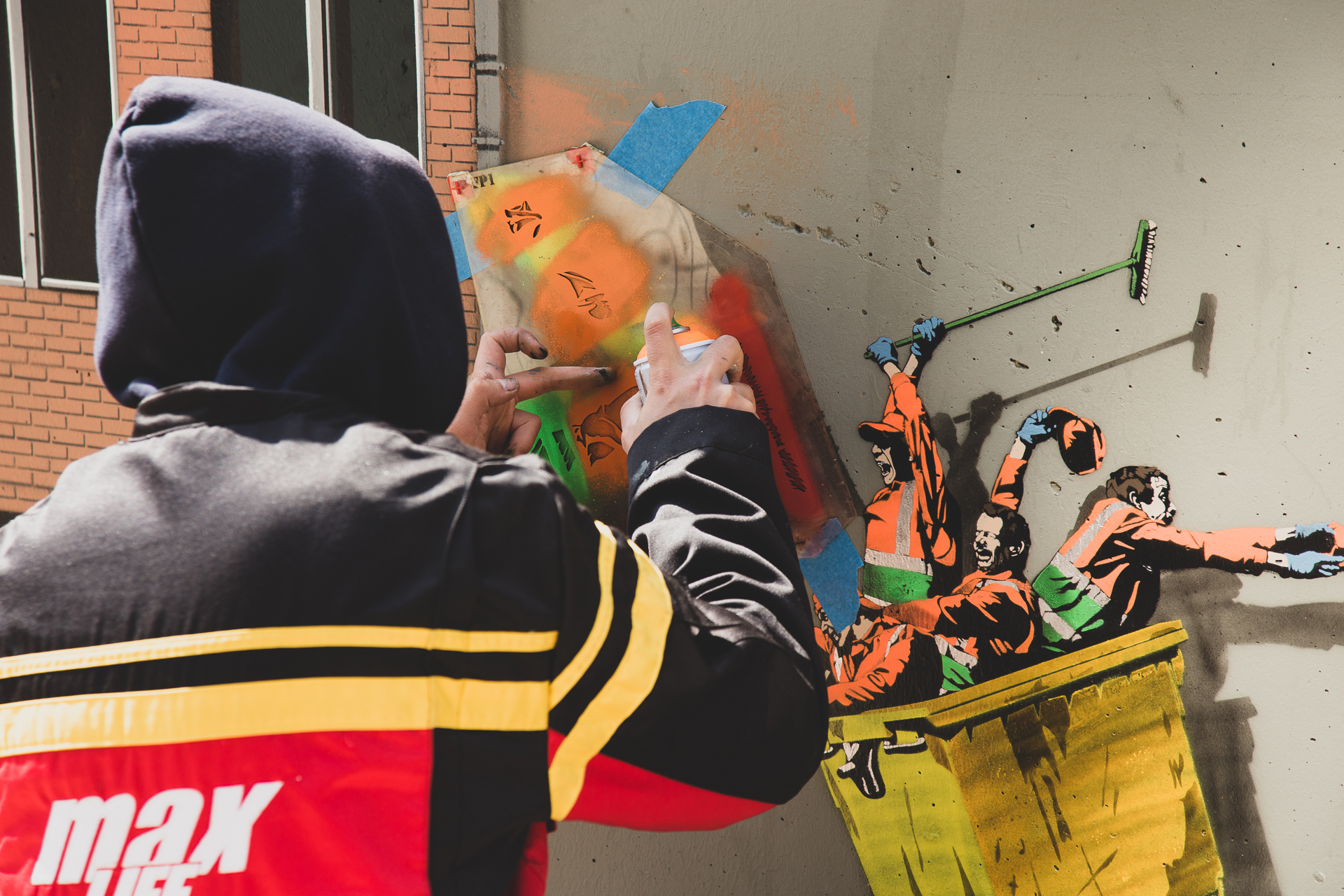 We leave Crystal and walk through the city centre and head over to crystal ship mascot Jaune, who is adding the final touches to his epic 100 metre stencil street mural. The mural is a long street, full of scenarios and includes local characters such as The Crystal Ship curator Bjørn Van Poucke.