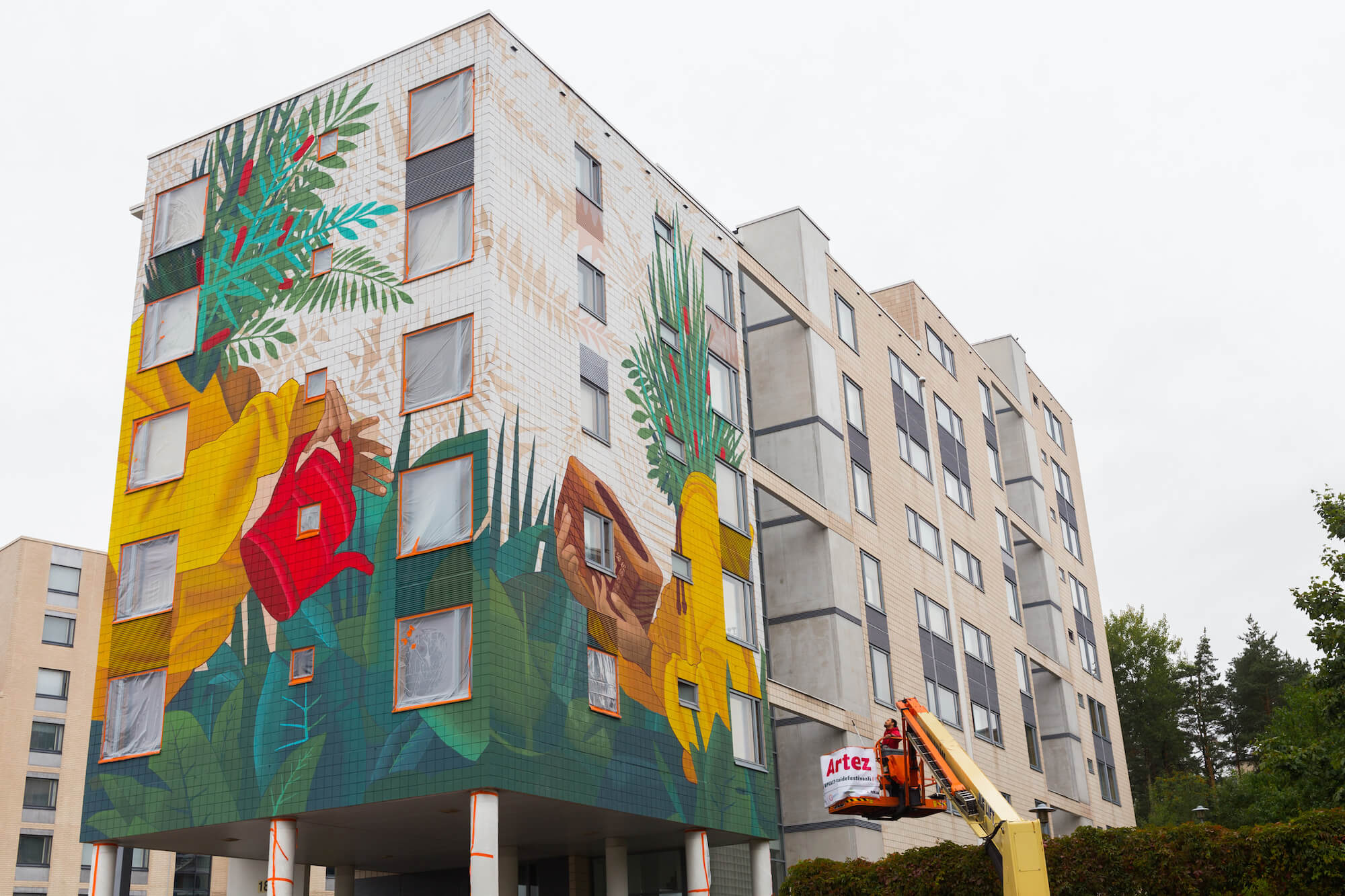 The surrounding green areas and the idyllic neighbourhood atmosphere provided the inspiration for his mural. Artez enjoyed how nature and the local neighbourhood all live in harmony with each other.
