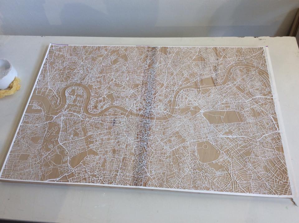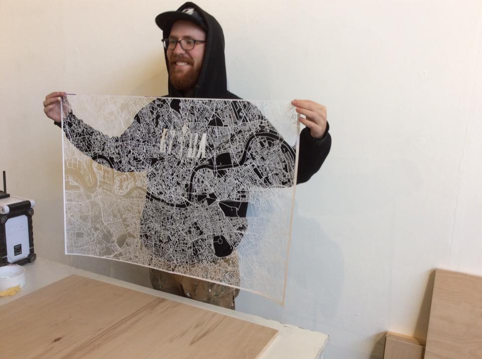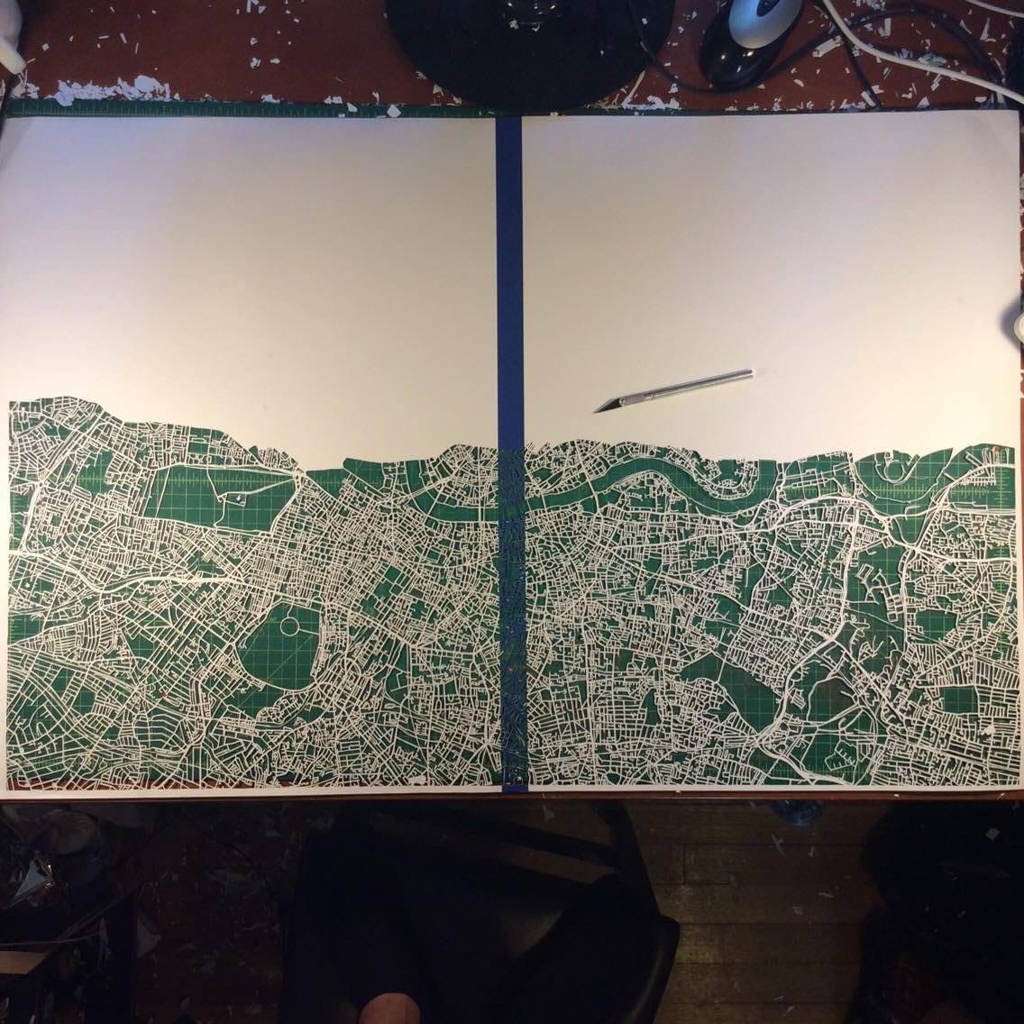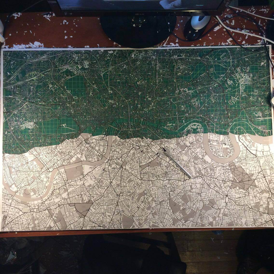 Nils printed out a map of London, and then painstakingly cut between the streets and tube system.