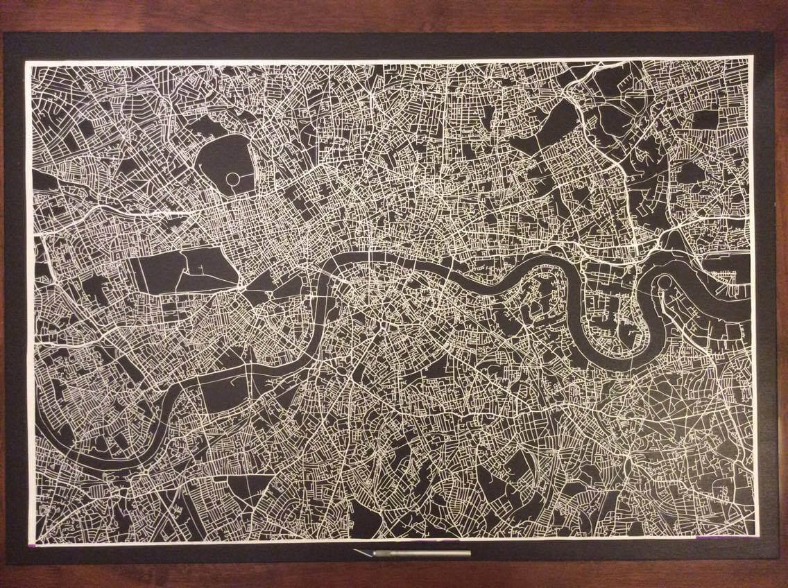 The paper he used was 117 lbs and after 104 hours of determination the result is a perfect map 24″ x 36″ of the capital of England.