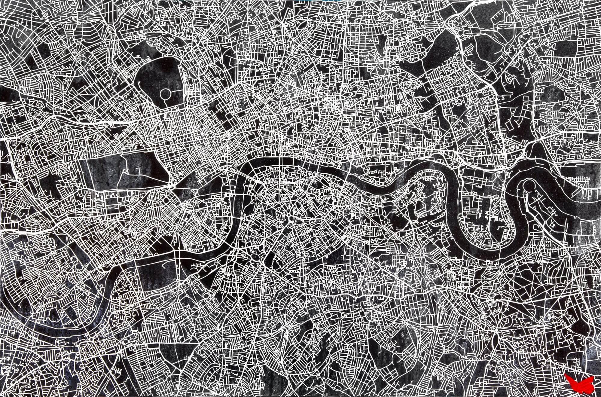 Nils Westergard travelled from Richmond, USA to London for our urban art group show ‘Underground 2016’ and he decided to bring his own map of the capital! Not just any map… a hand cut stencilled map, proving he’s a cut above the rest!