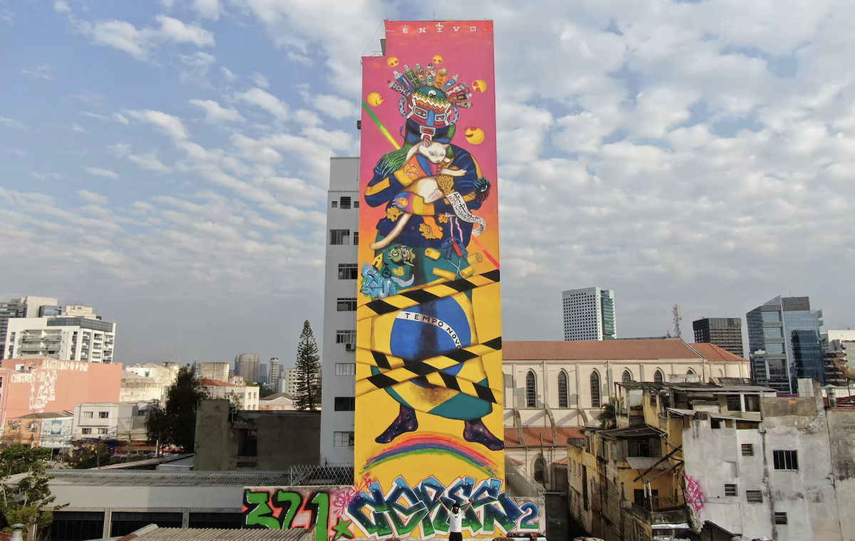 Born in 1986 in Grajaú, on the southern outskirts of São Paulo, Marcos Ramos, known as Enivo, began painting at twelve and developed a practice rooted in graffiti culture. Refined through formal study at the Faculdade Paulista de Artes, he moves fluidly between monumental murals and intimate studio works. His visual language merges Afro-Brazilian heritage with Afrofuturist imagination, combining ancestral symbolism, protective icons, and scenes of everyday tenderness. Balancing memory and projection, he documents lived realities while envisioning luminous futures. As co-founder and curator of Galeria A7MA, Enivo has played a key role in expanding urban art in São Paulo. Across walls and canvases, his work navigates the space between looking outward and inward, holding past and possibility in dynamic equilibrium.