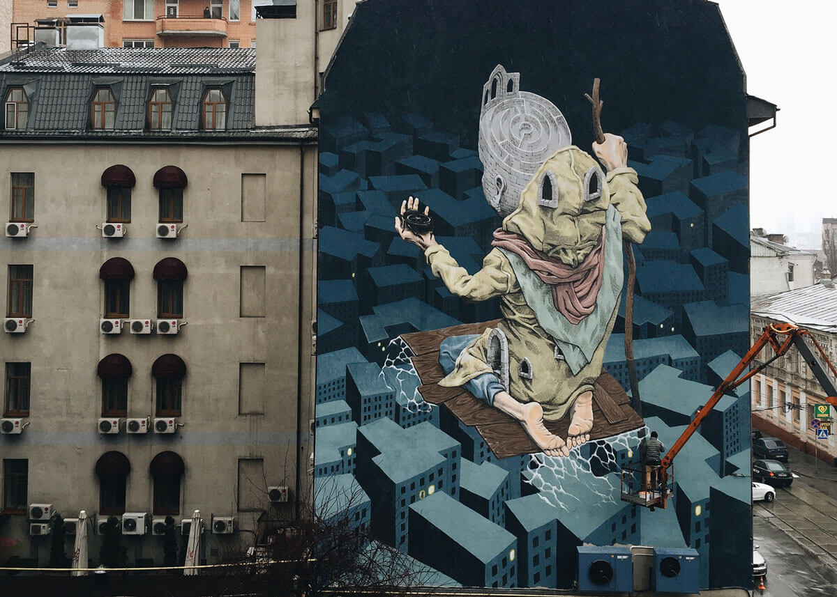 The project has already started in Kiev, the capital of Ukraine with street artist Rustam Qbic. Rustam has painted Labyrinth. The mural depicts a character wearing a crown shaped like a labyrinth over his head who guided by scarab beetle compass, tries to find a way out of a massive maze of life challenges. The mural reflects on the meaning of this journey, a journey we all undertake at some point in our lives.