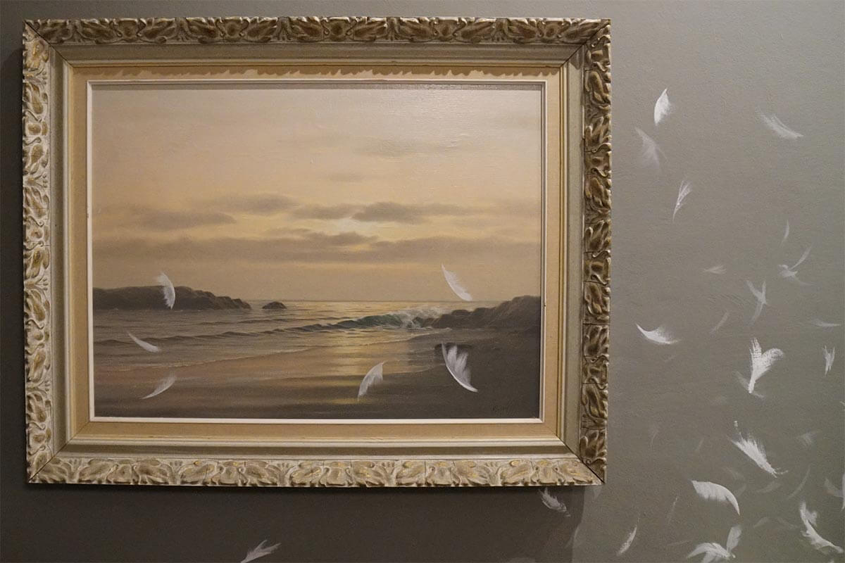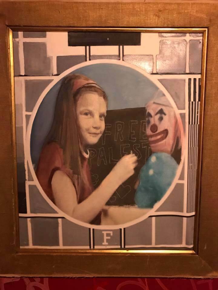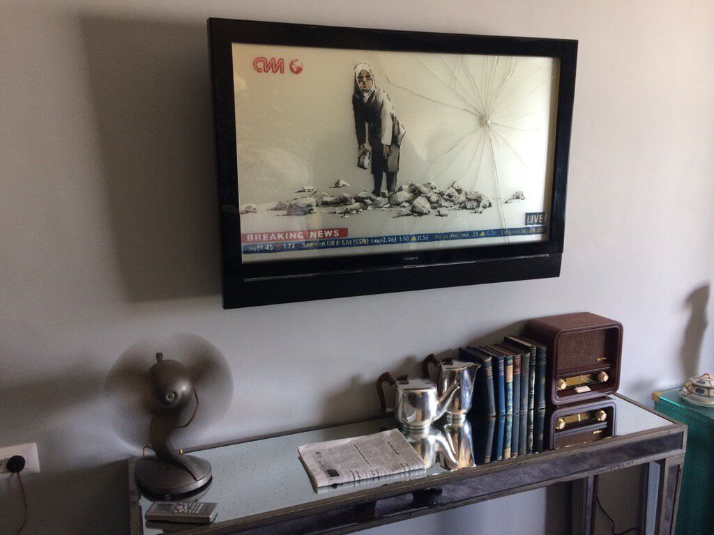 There is a cinema room where you can find this framed old test card, typically displayed when no programs were being broadcast, which has been repurposed with the message “Free Palestine” written in chalk over the original noughts and crosses game. The fact that this message is being displayed is a powerful commentary on the silence of mainstream media when it comes to issues surrounding Palestine. This artwork challenges the viewer to question the narratives presented through media and recognise the importance of seeking alternative perspectives and voices.
