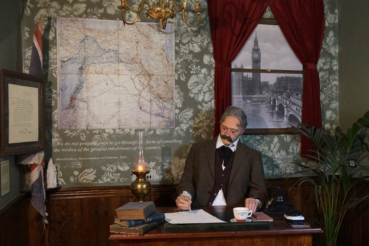 A museum has been curated with Dr. Gavin Grindon from Essex University. The museum features a collection of fact-checked materials and is an ongoing repository for local stories, artefacts, and testimonies. As you enter the museum, you’ll see a depiction of Arthur James Balfour sitting and signing off the Balfour Declaration. Interestingly, his hand goes around the paper without actually signing it. The Balfour Declaration was created in 1917 ( one hundred years ago) and confirmed the British government’s support for establishing a “national home” for the Jewish people in Palestine.