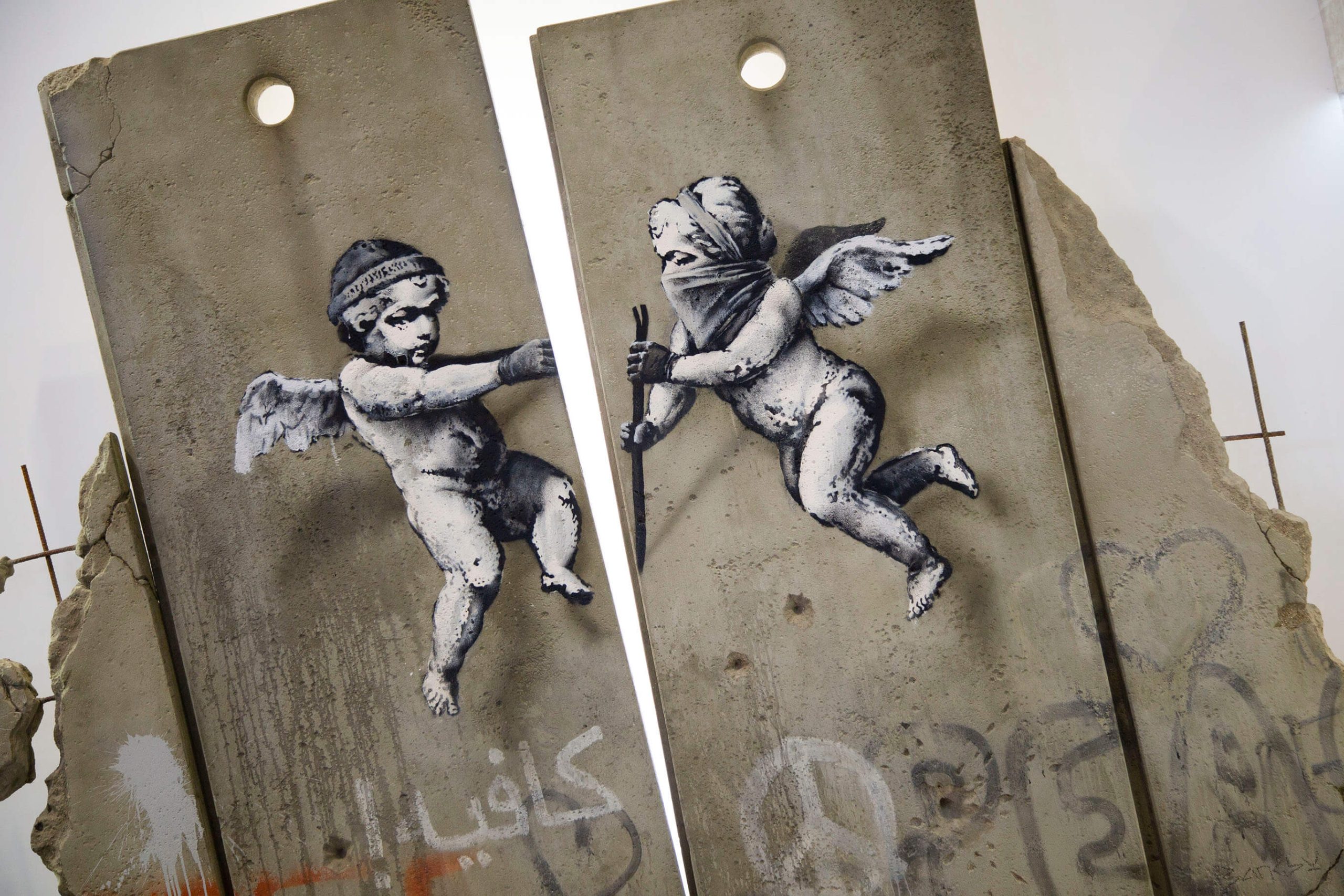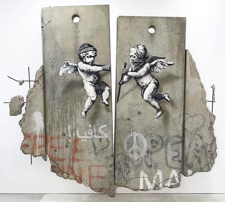 For the trade fair Banksy created a replica separation barrier that places emphasis on the Israeli-Palestinian conflict. The replica on the Palestine stand shows two cherubs crowbarring the separation wall open.