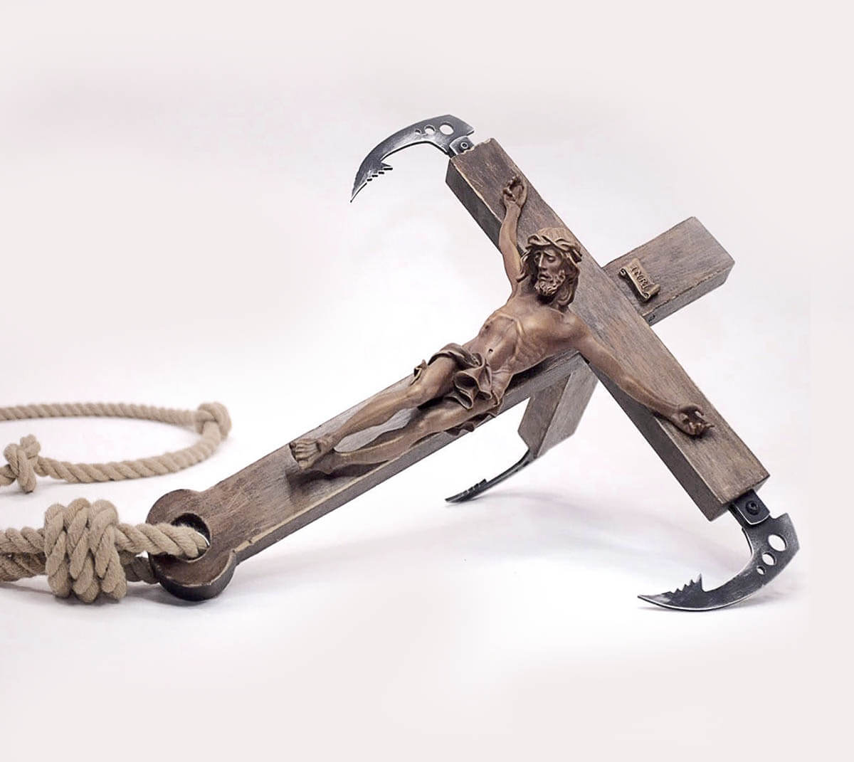The Crucifix Grappling Hook is a tactical support device constructed from high tensile aluminium and sacred ornament.