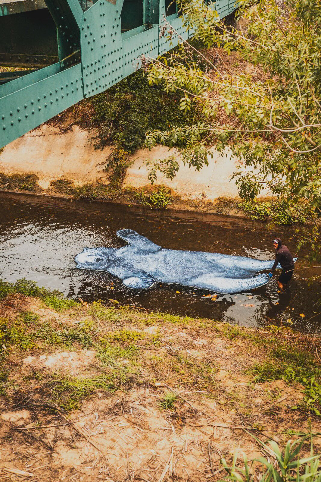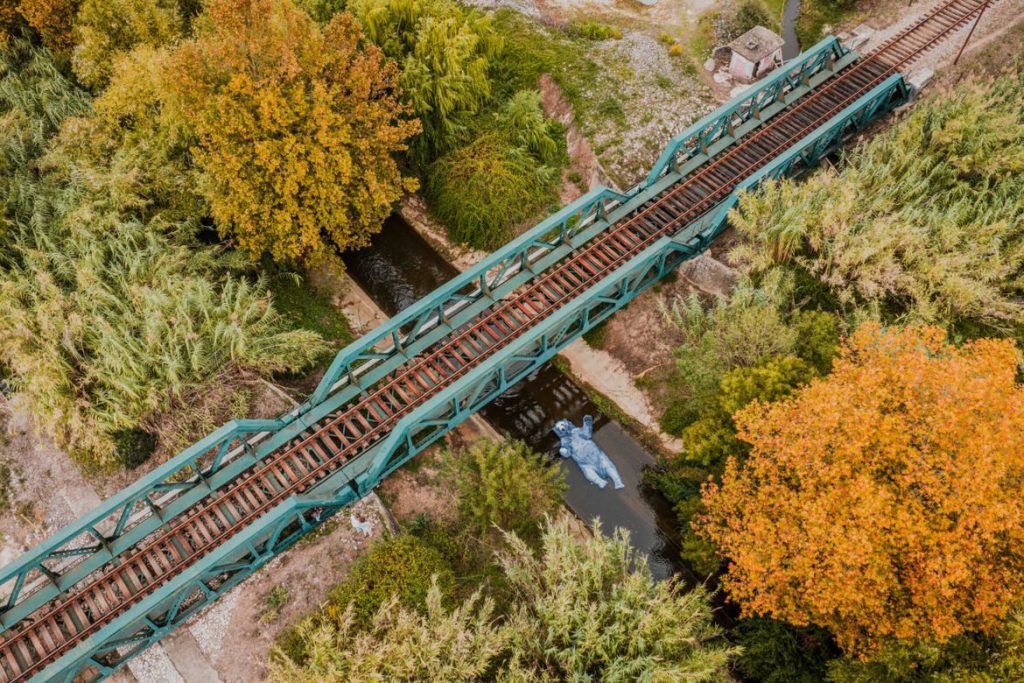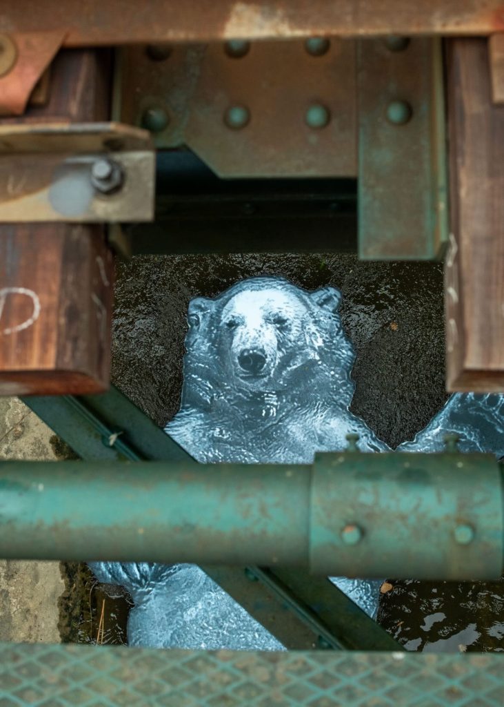 Stretching across 15 meters of poetic absurdity and environmental reflection, the work presents a surreal yet deeply moving image: a polar bear floating beneath a railway bridge, its image gliding atop a quiet river like an apparition from another world.