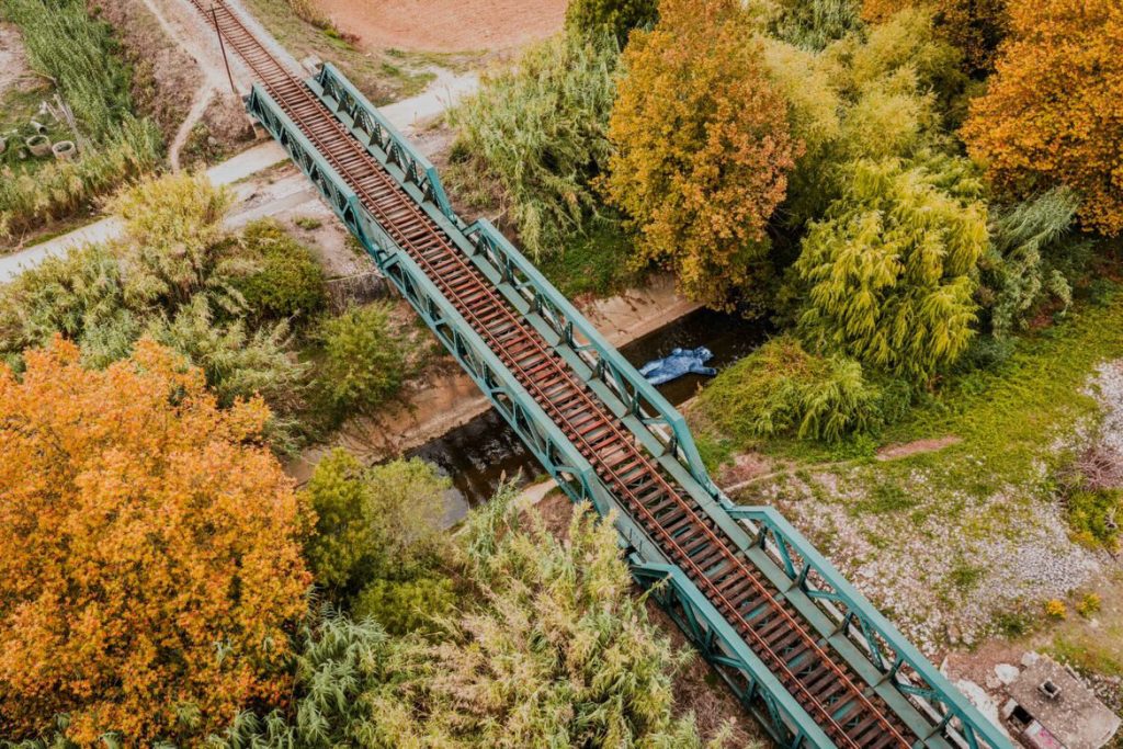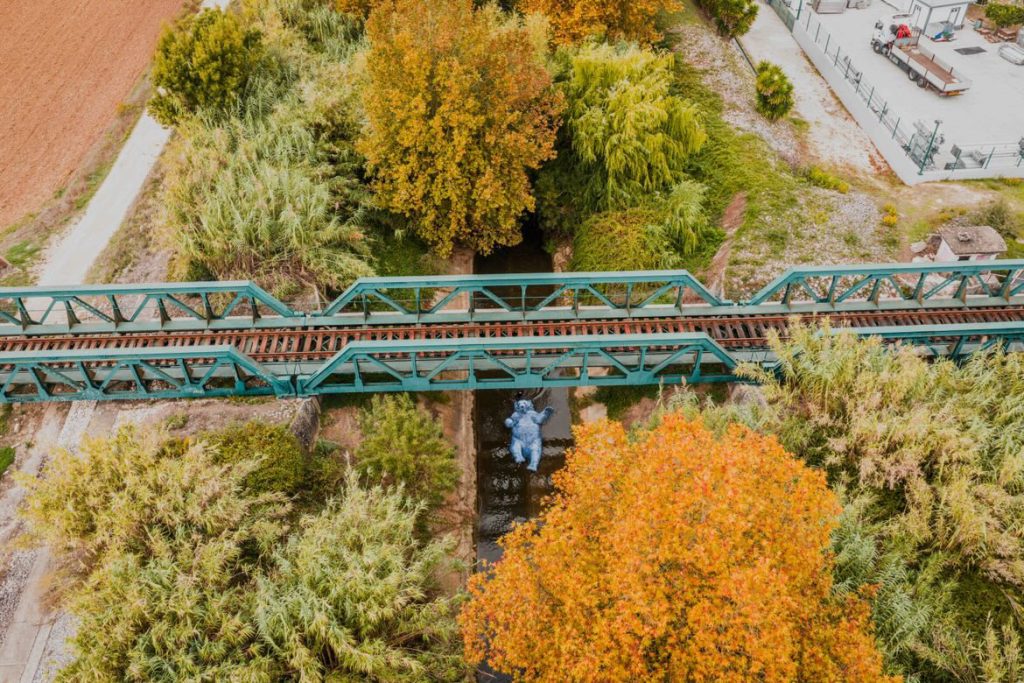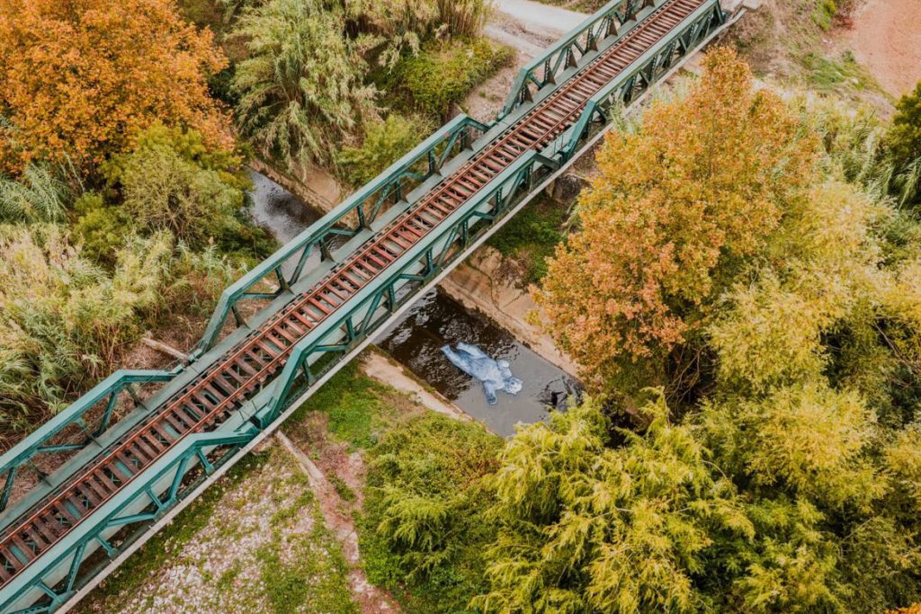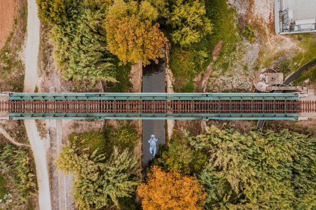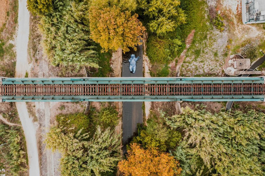 The installation flows beneath an old steel bridge, its faded green framework cutting across the natural hues of autumn sets the scene.