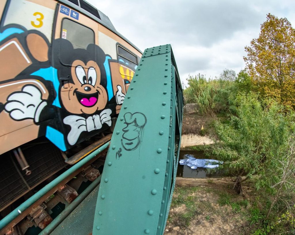 Above: the industrial rhythm of rails and graffitied trains, symbols of movement, progress, and modern velocity. Below: stillness, fragility, and the spectral presence of the polar bear, reflecting their gaze at us, carried forward by the water with each passing second, on the edge of climate memory.
