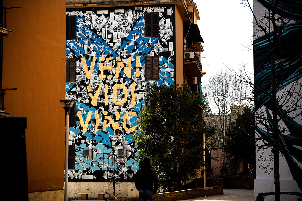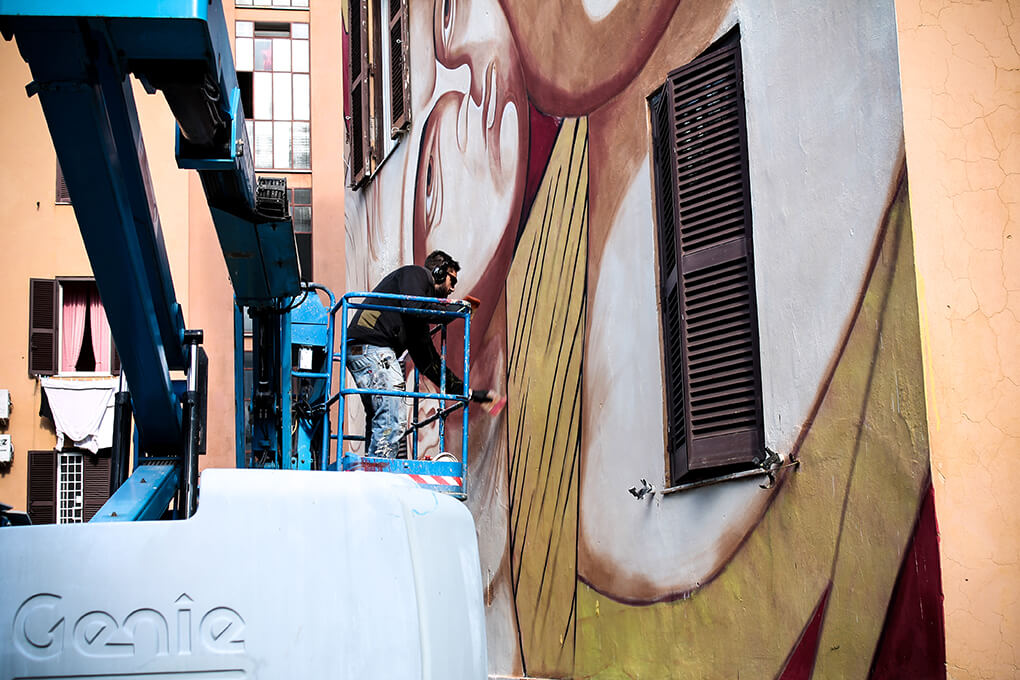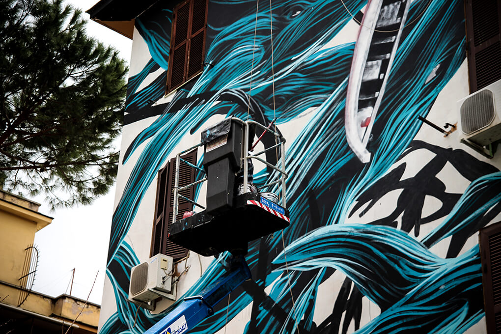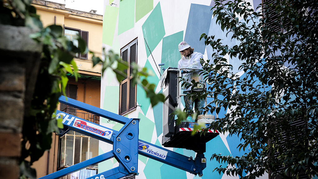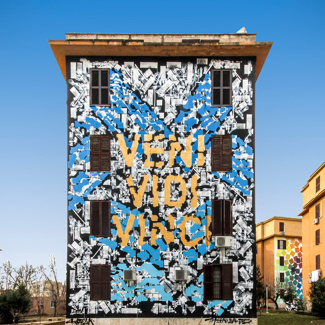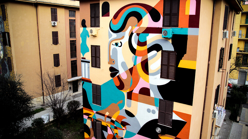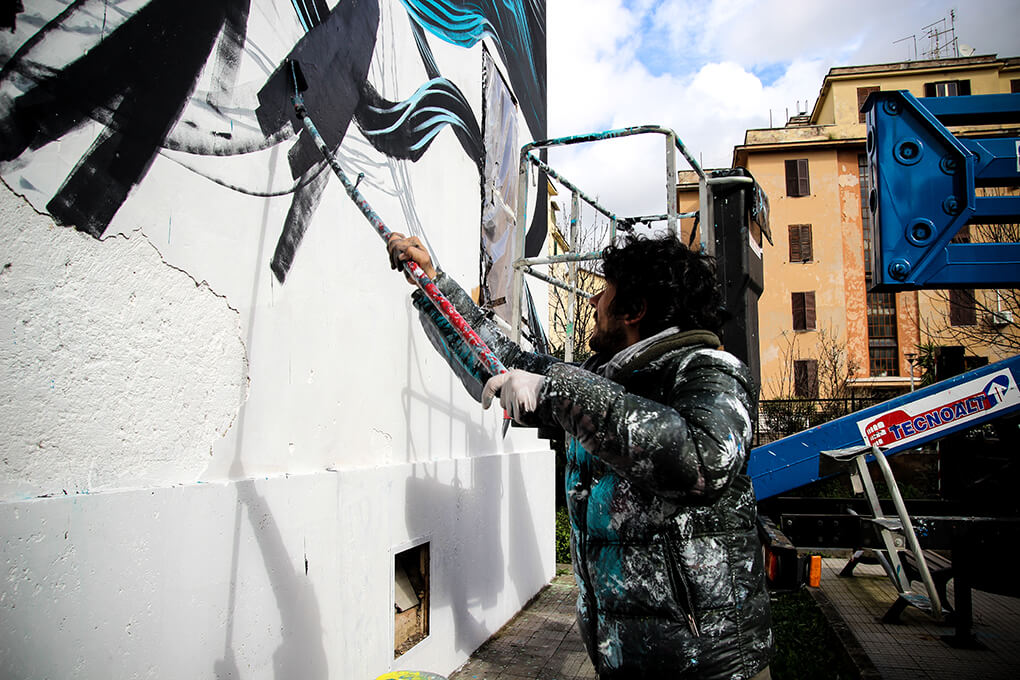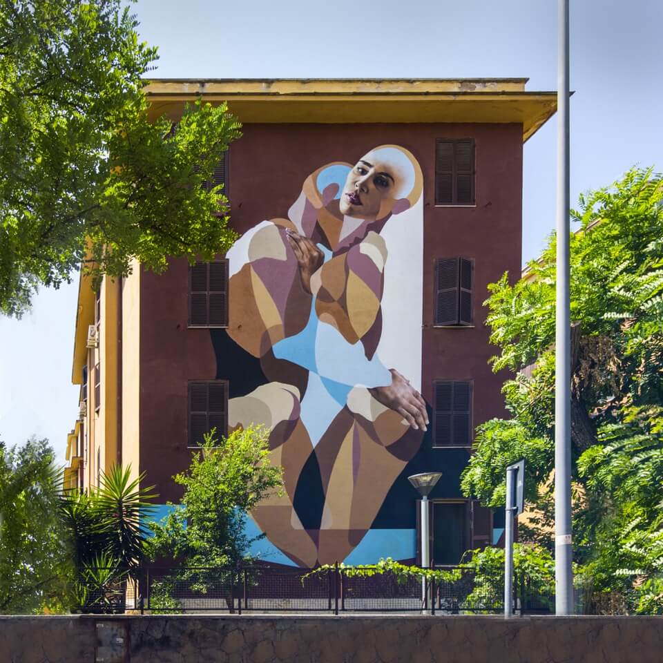 Italian street artist Moneyless also painted along with this theme and produced his mural ‘wind’ in one day. The traits are broken and dynamic and the perfect geometric minimalism representation of the Roman breeze.