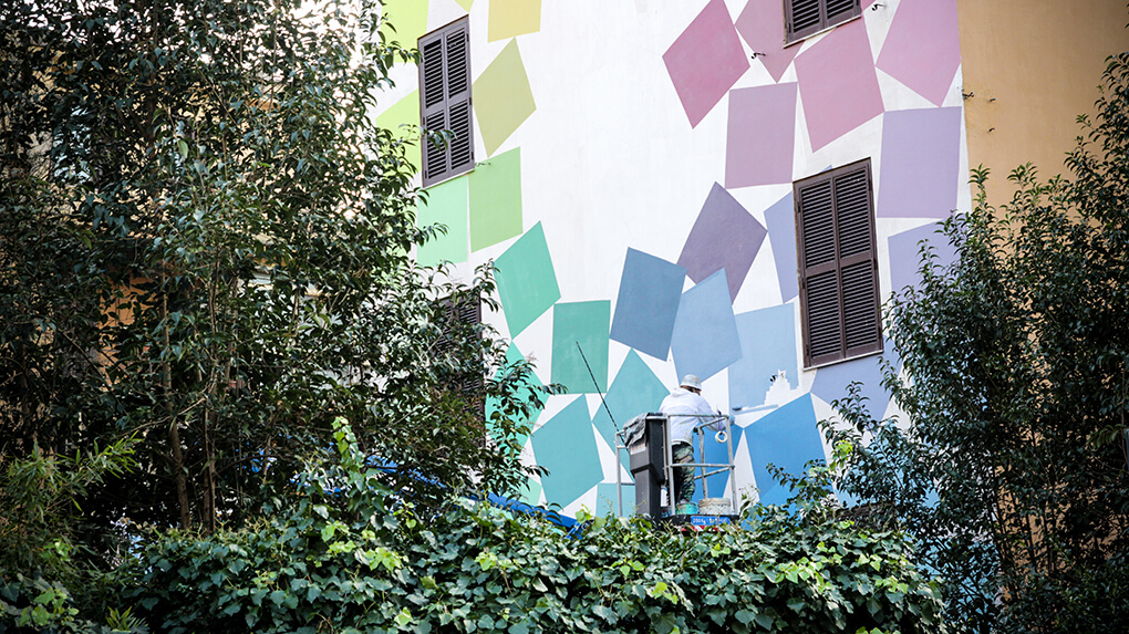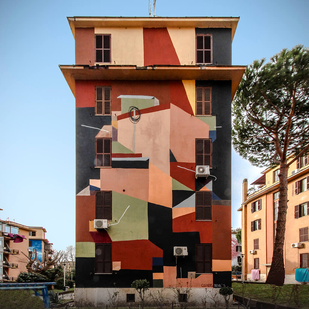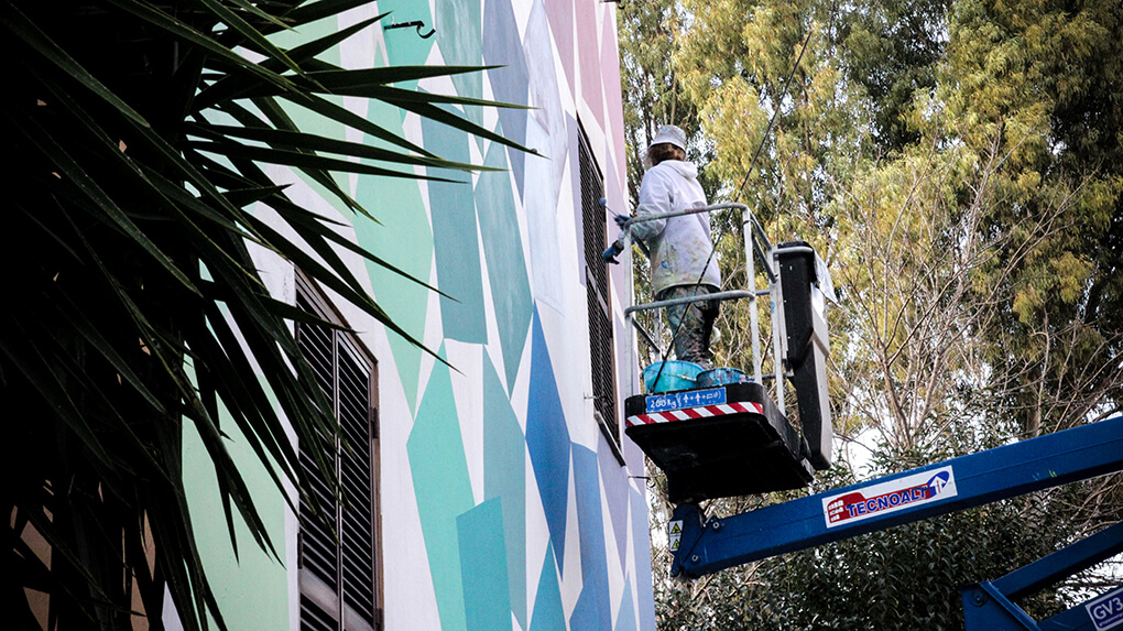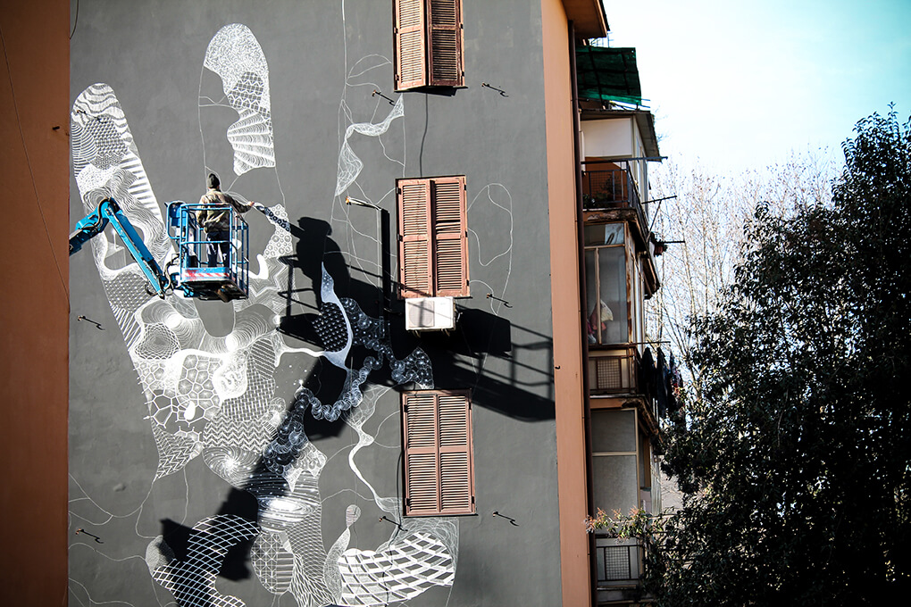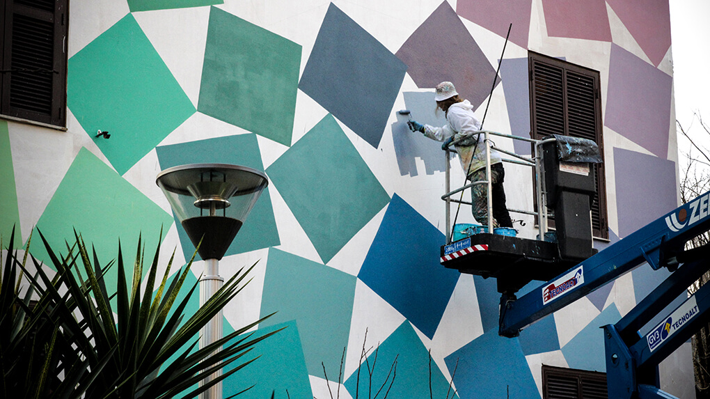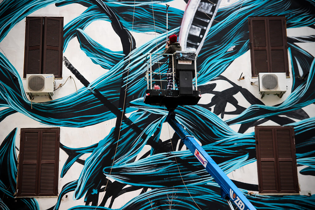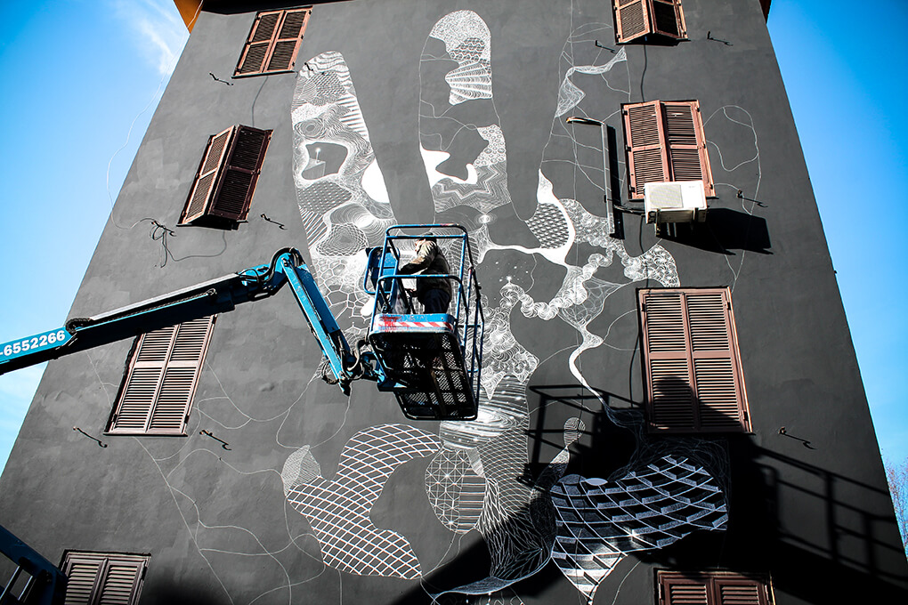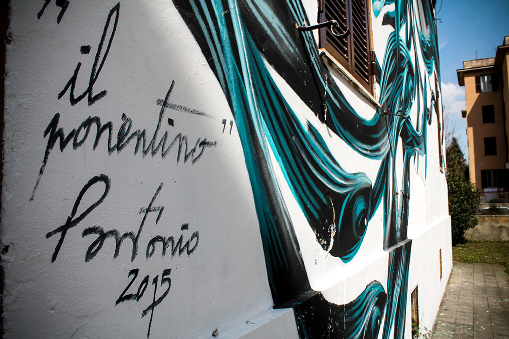 Italian street artist Moneyless also painted along with this theme and produced his mural ‘wind’ in one day. The traits are broken and dynamic and the perfect geometric minimalism representation of the Roman breeze.