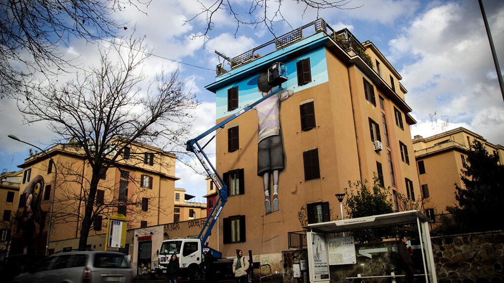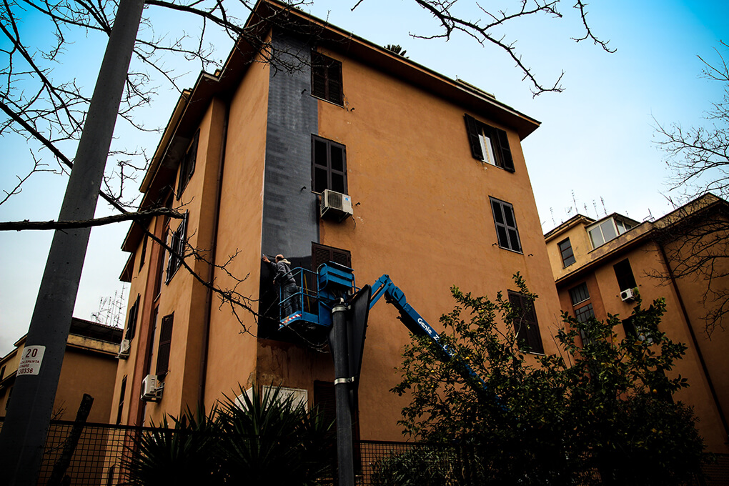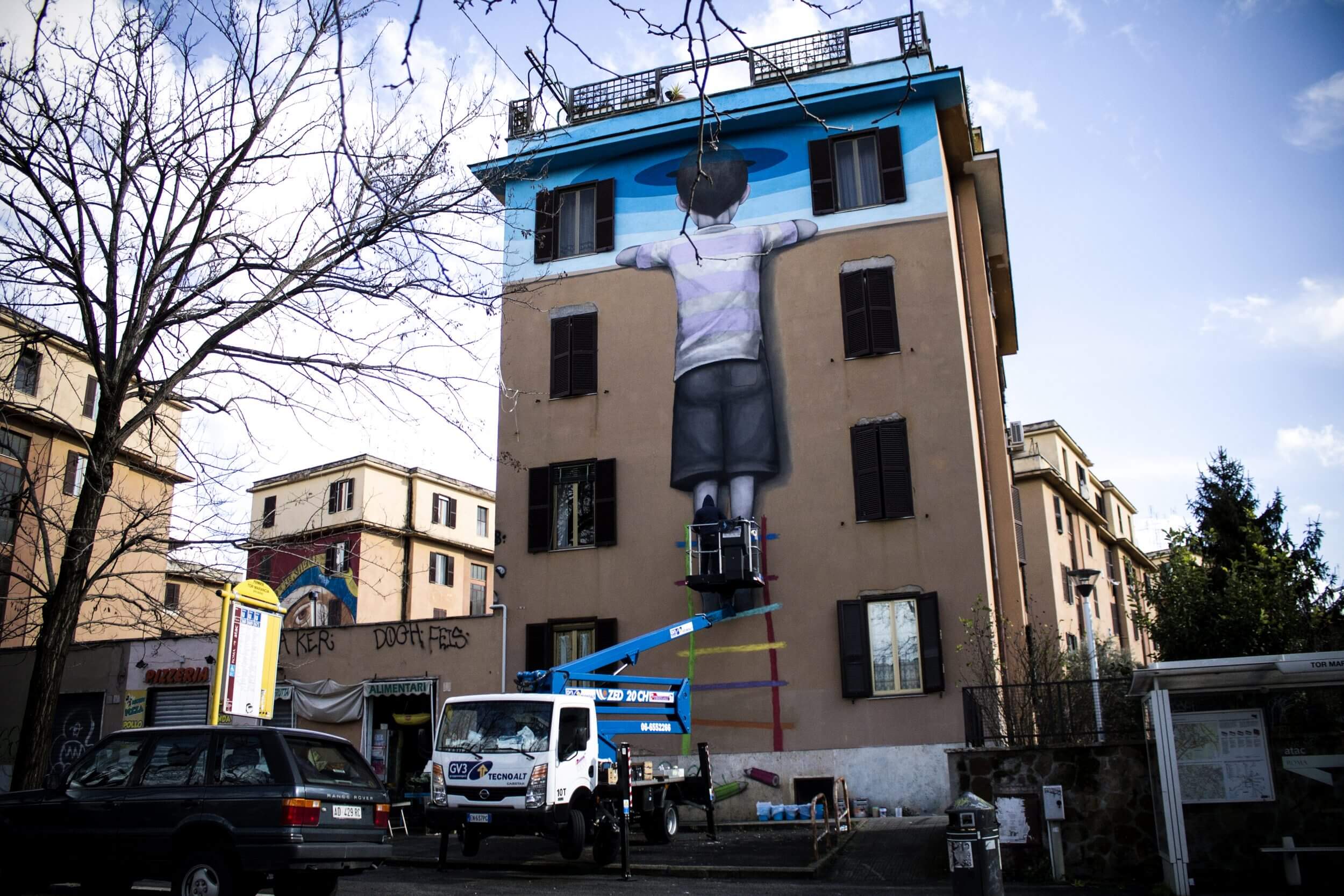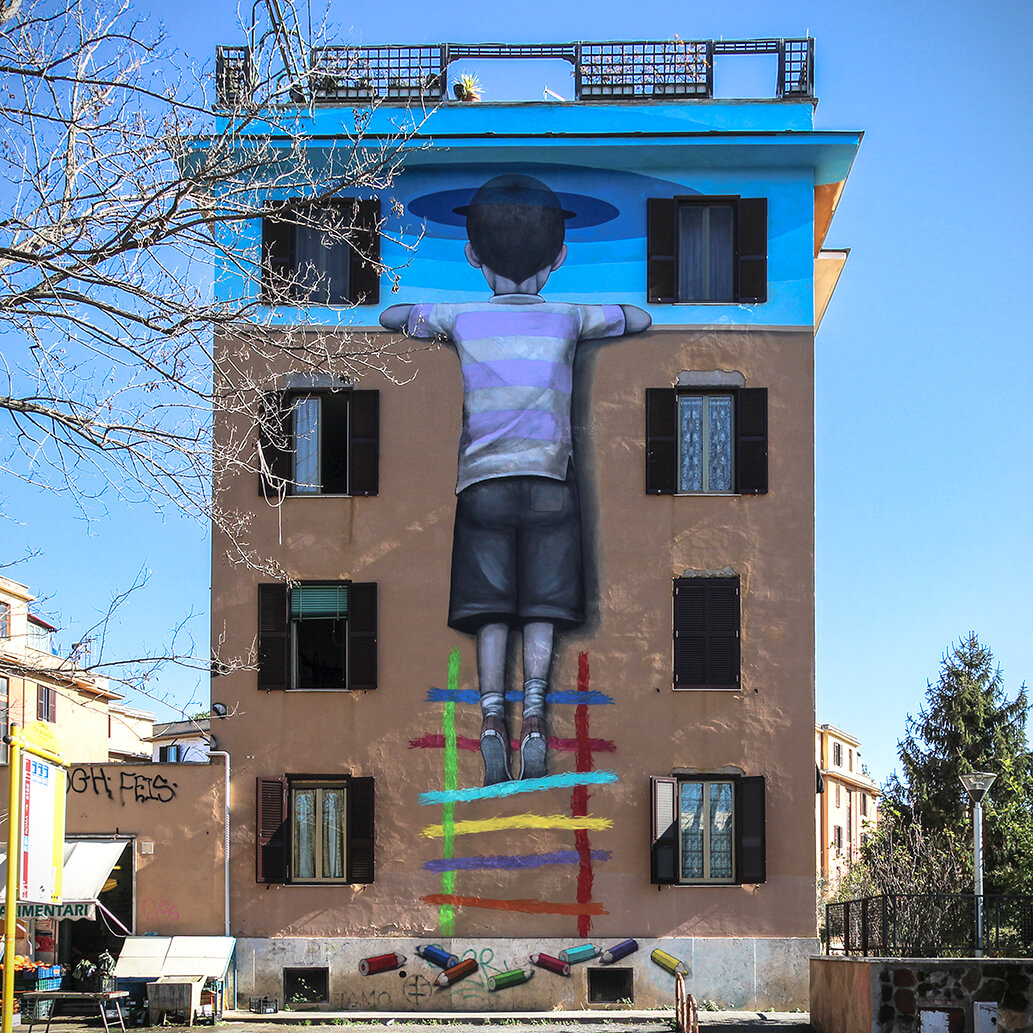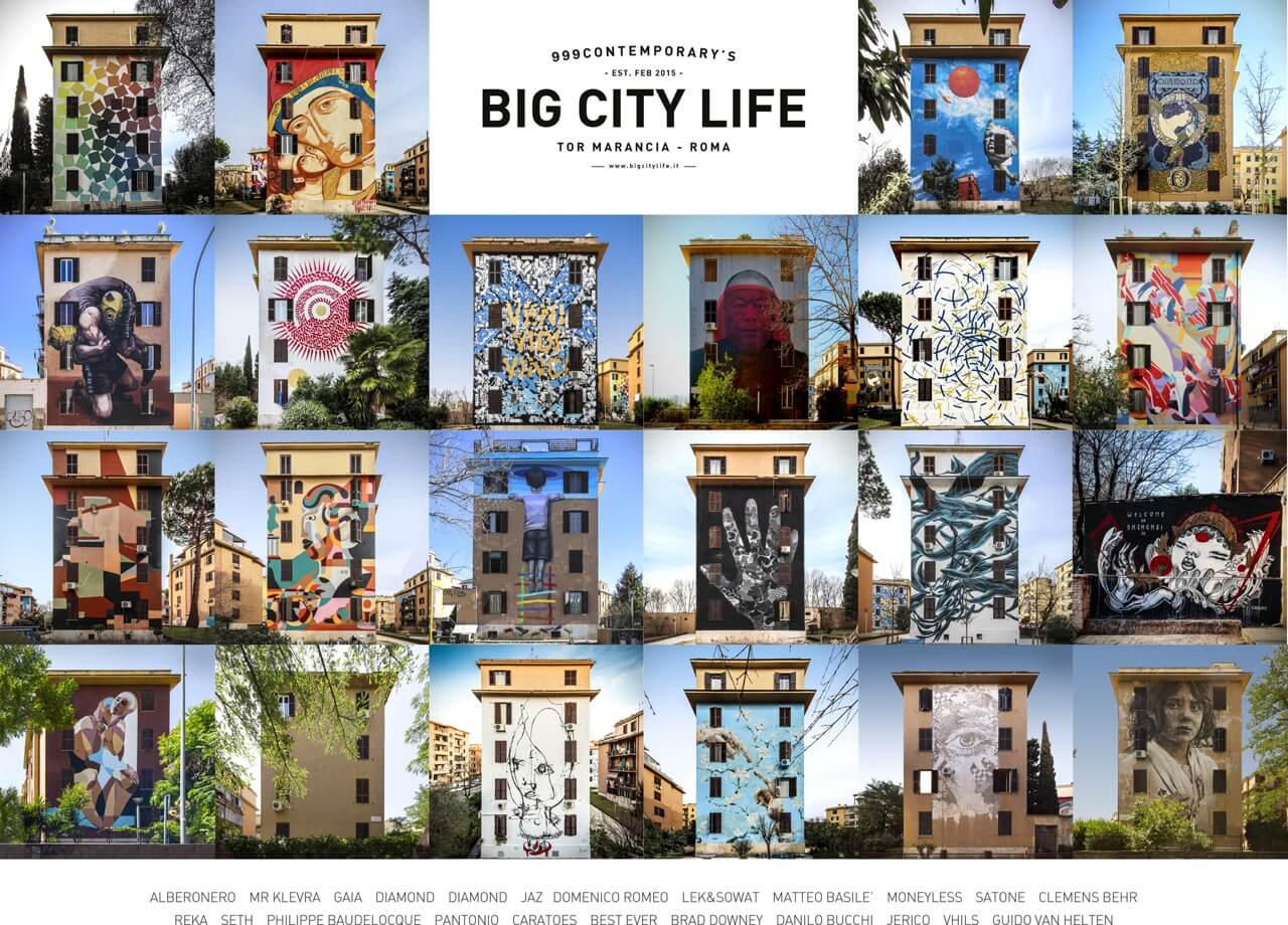 ‘Big City Life‘ is a public art project for urban regeneration, cultural and social development curated by 999contemporary. The Big City Life project collaborated with the local community and twenty local and international street artists to beautify and culturally enrich the Tor Marancia district of Rome in forty-three days.