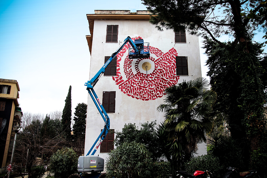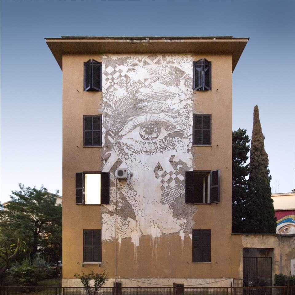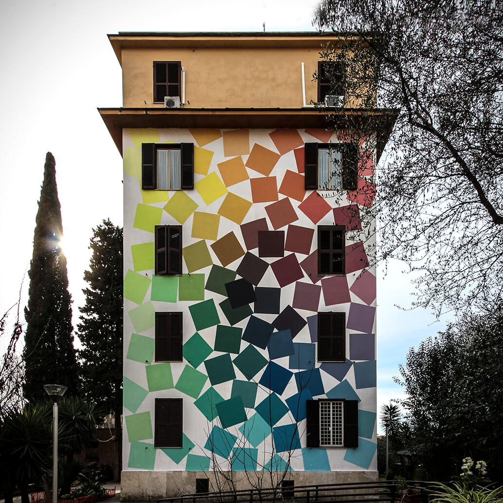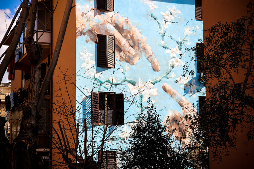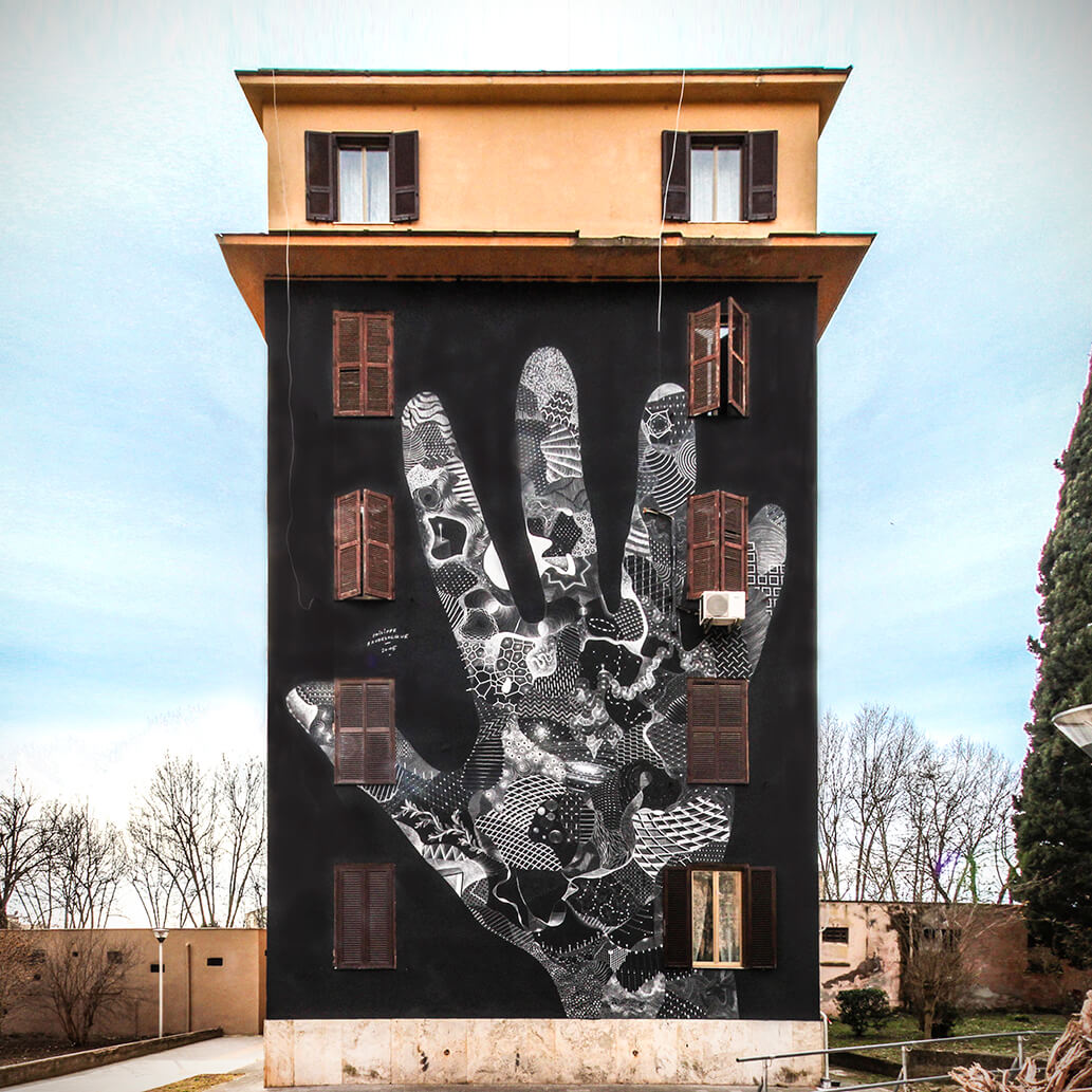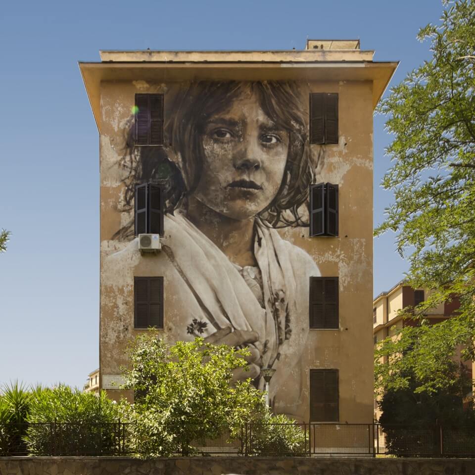 ‘Big City Life‘ is a public art project for urban regeneration, cultural and social development curated by 999contemporary. The Big City Life project collaborated with the local community and twenty local and international street artists to beautify and culturally enrich the Tor Marancia district of Rome in forty-three days.