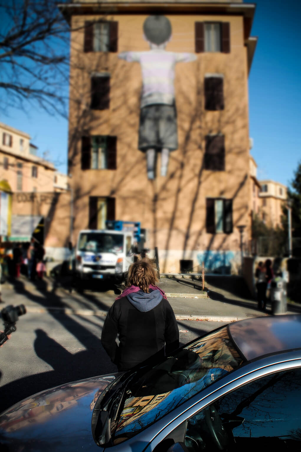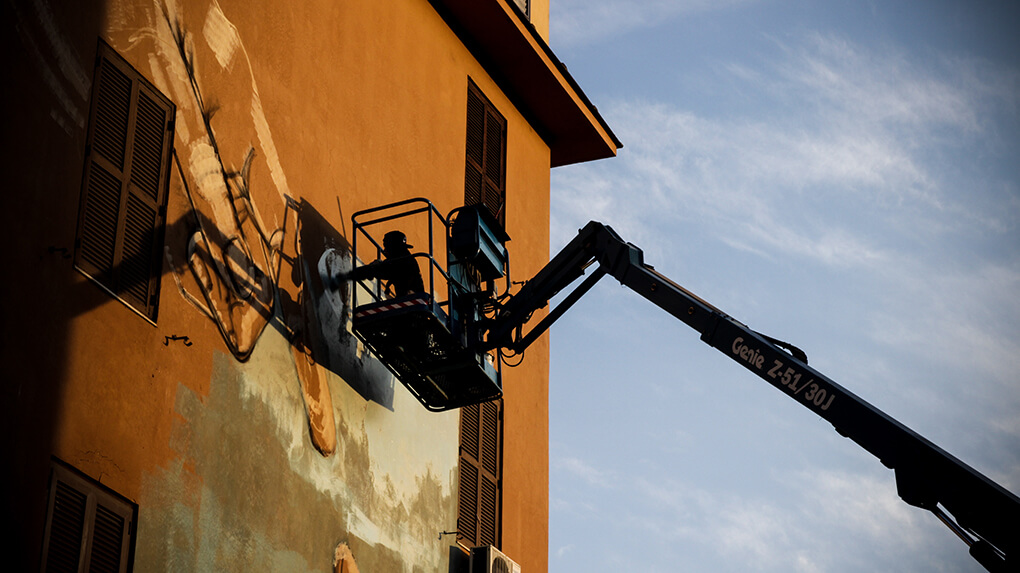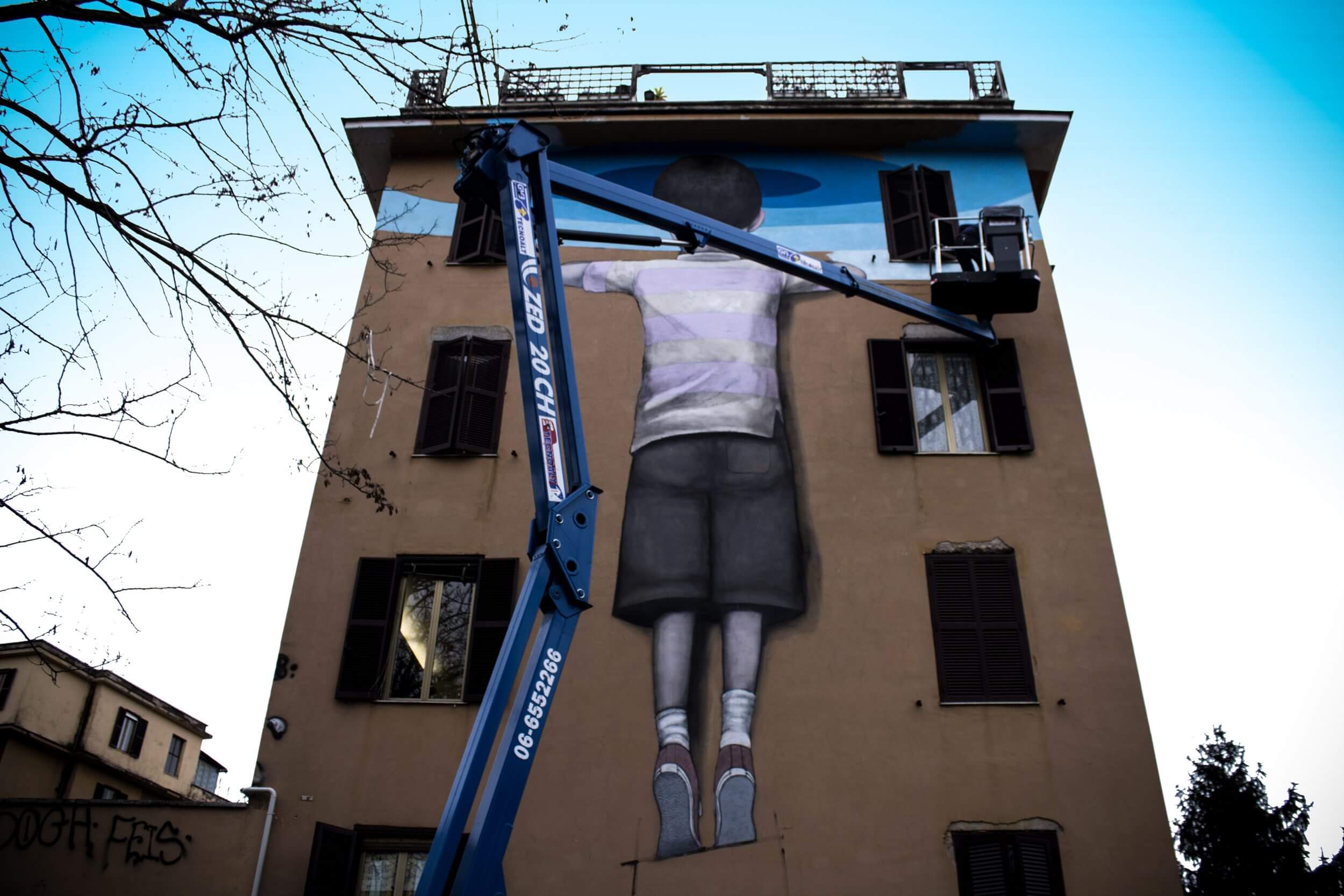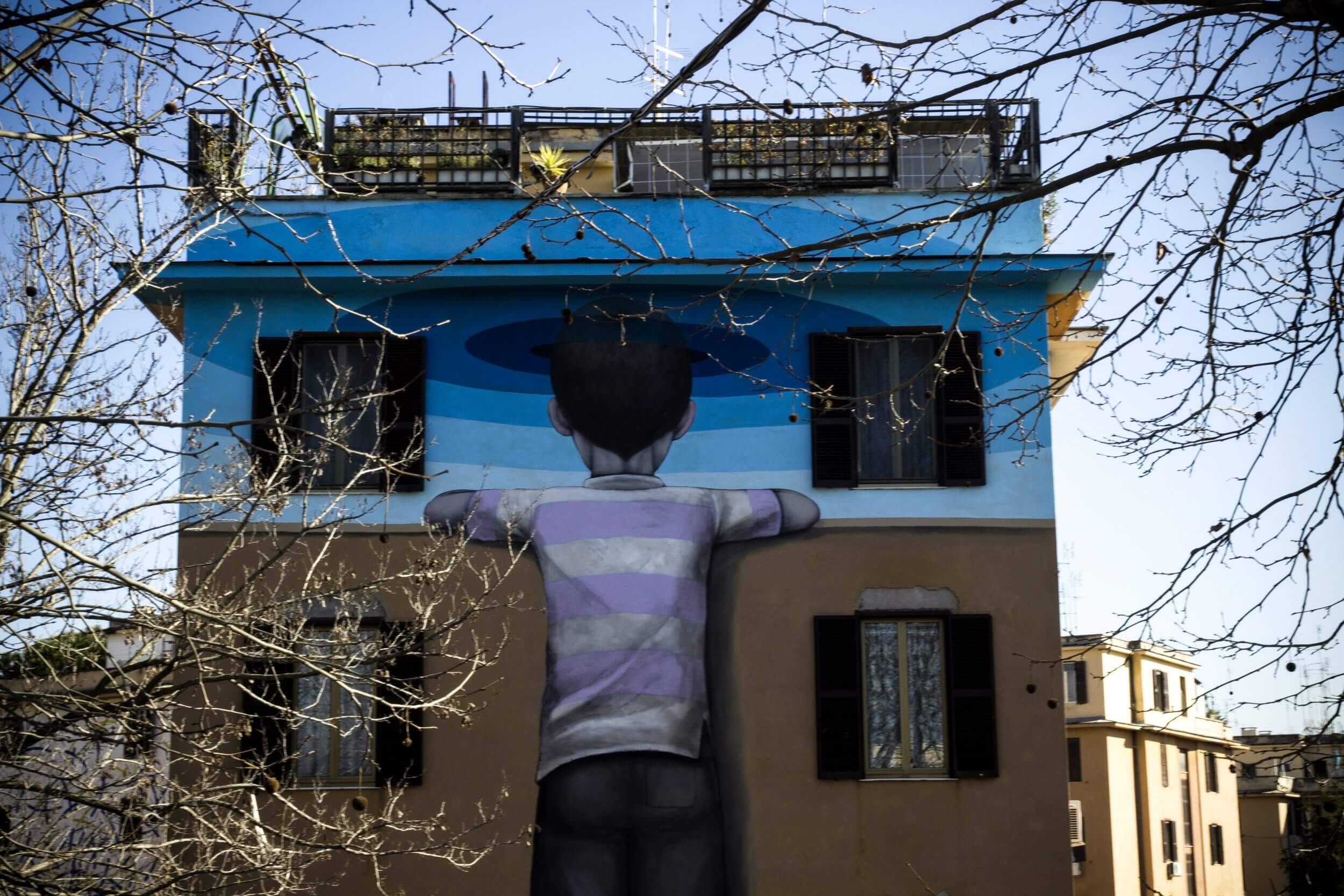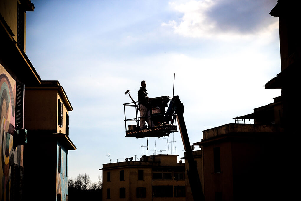 ‘Big City Life‘ is a public art project for urban regeneration, cultural and social development curated by 999contemporary. The Big City Life project collaborated with the local community and twenty local and international street artists to beautify and culturally enrich the Tor Marancia district of Rome in forty-three days.