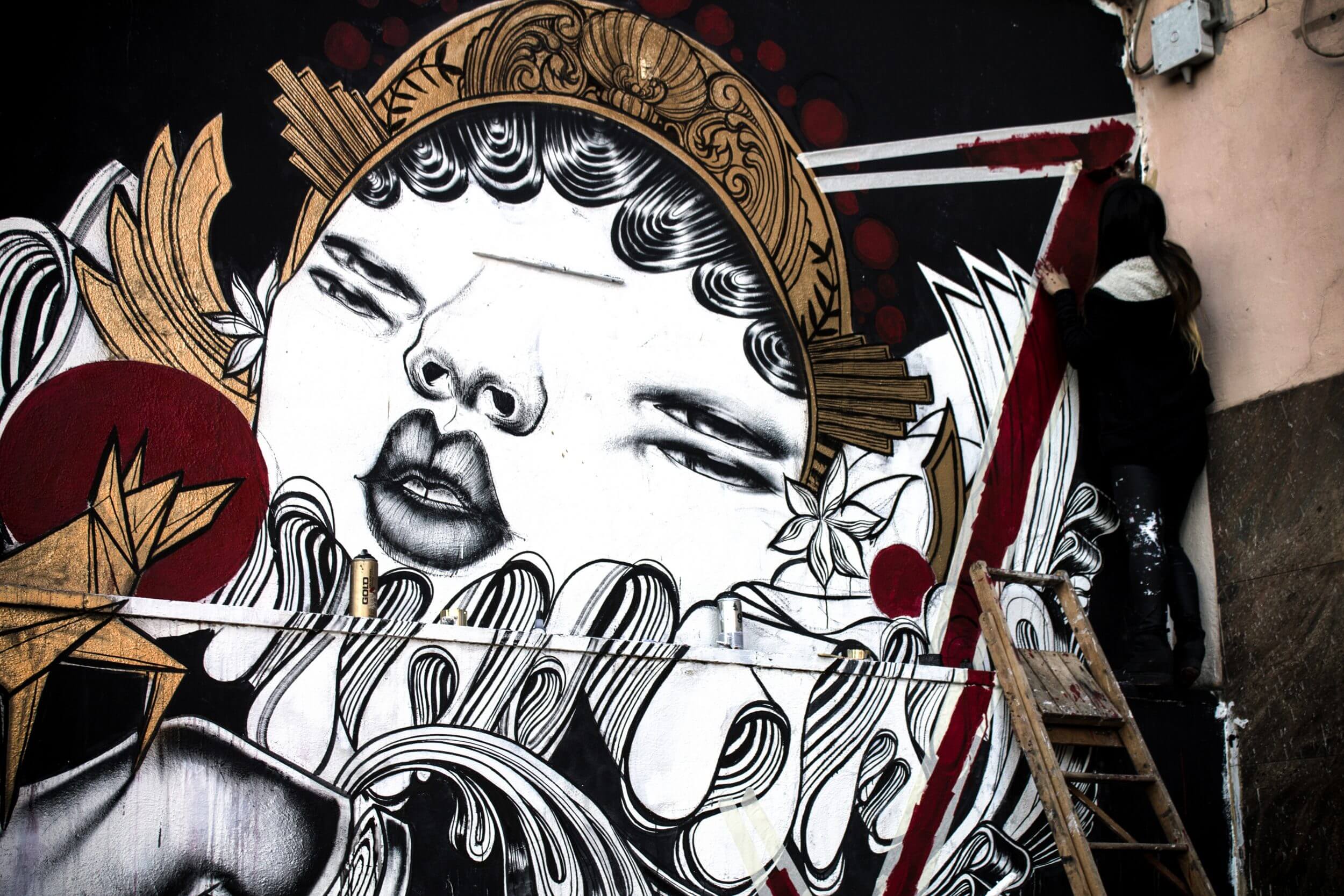 Italian Danilo Bucchi mural ‘Assolo’ meaning solo is of a black and white simple and beautiful image on a woman. Later on he adds the red glamorous shoes.