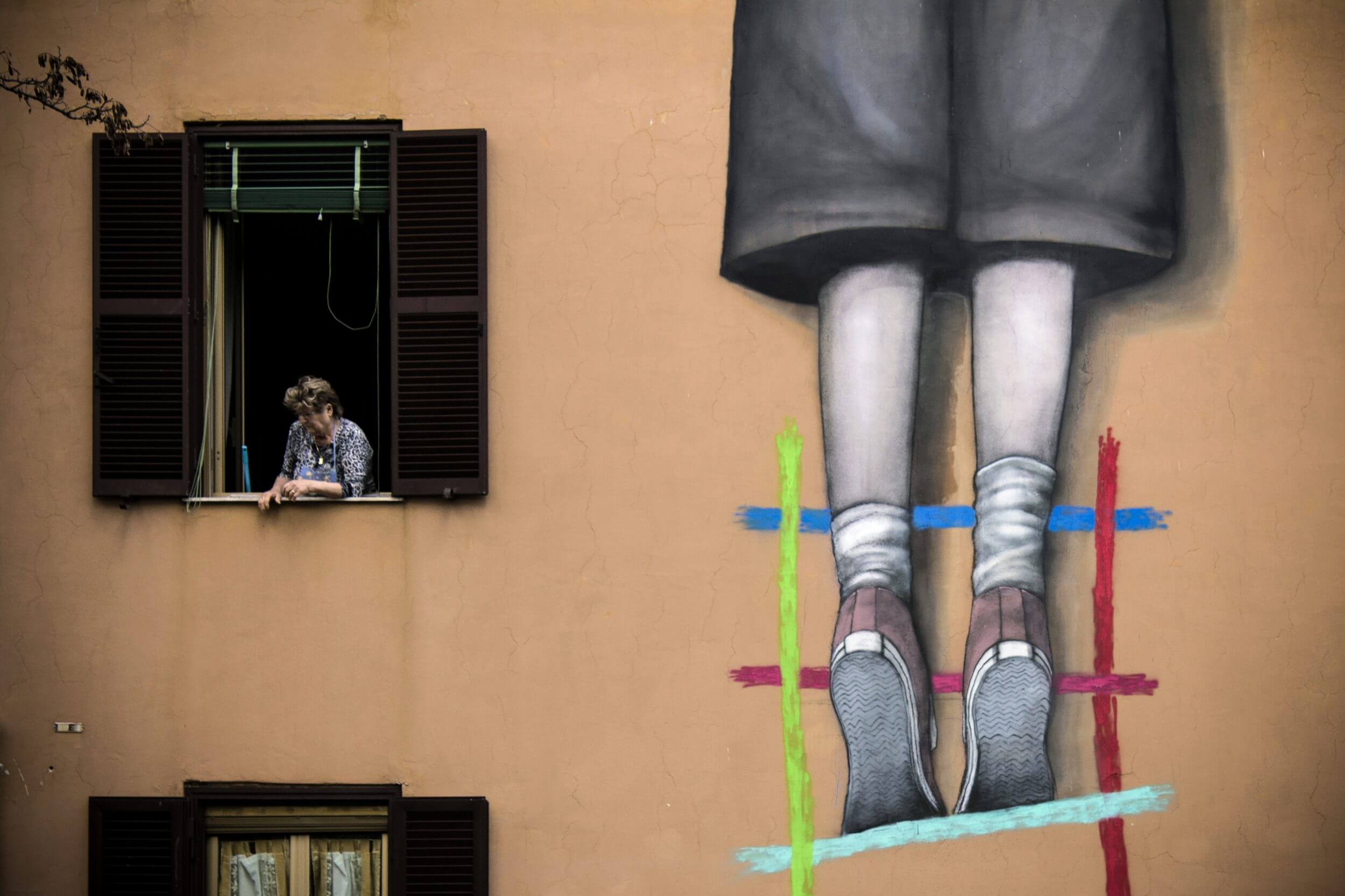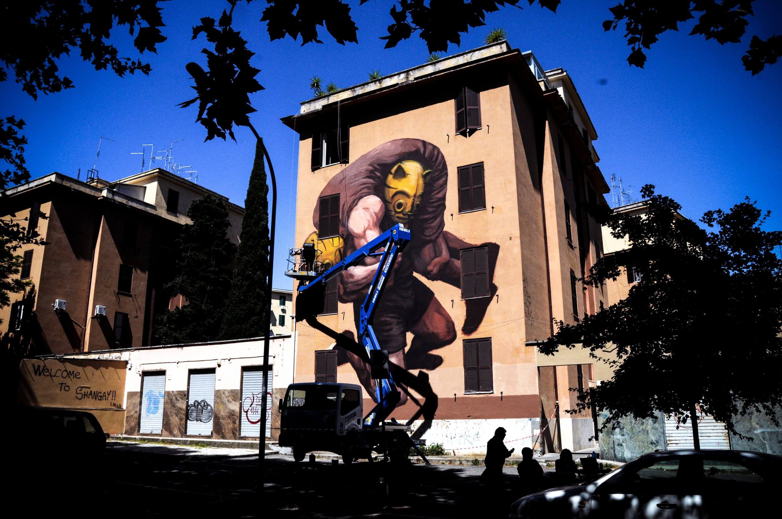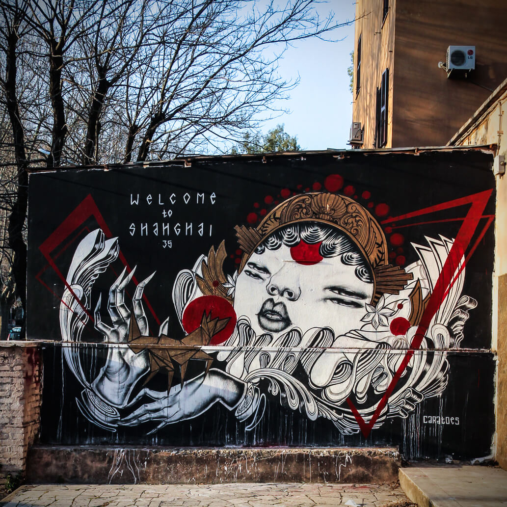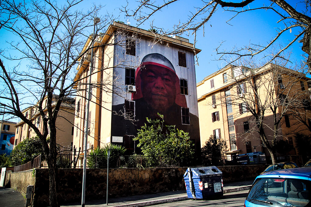 Hong Kong street artist Caratoes mural ‘Welcome to Shanghai 35’ plays on the nickname of the township “Shanghai” during the violence and poverty. Tor Marancia was founded in 1935 as a result of forced evictions carried out in Piazza Venezia, and the town subsequently developed after the war when the Law De Gasperi on the rehabilitation of villages and social housing came into place.