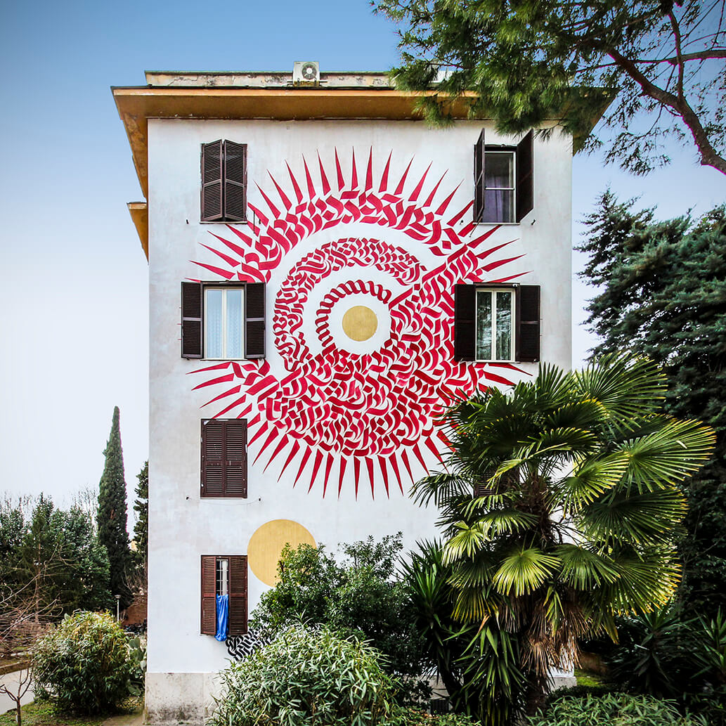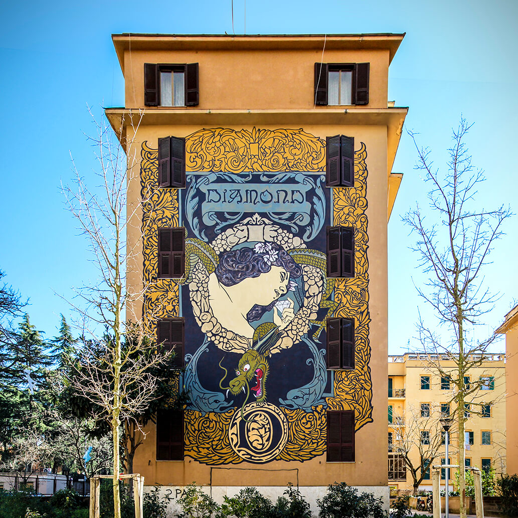 From the title “Alme Sol Invictus”Italian artist Domenico Romeo was inspired by the sun-god of the ancient romans, offering to the inhabitants of the neighbourhood, hope for the future. Through his symbols the artist stimulus a rebirth of a social and economic revival of these once poor areas of Rome.