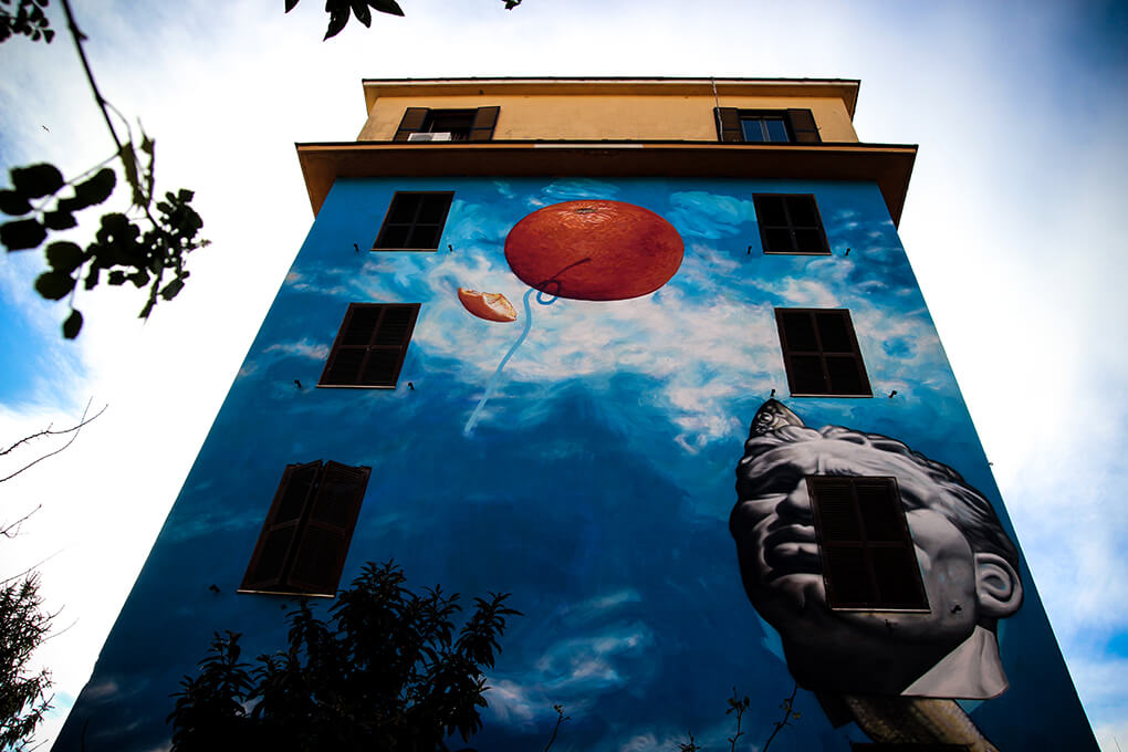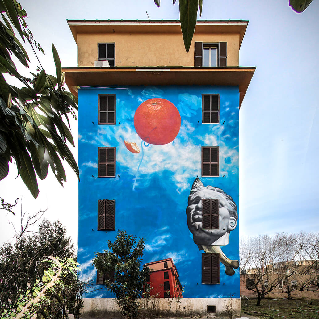 American street artist Gaia challenges our perceptions of reality just as Italian artist Giorgio De Chirico did. The chosen disordered images reflect Rome, known for its orange groves and rooted sculptural history. A beautiful tribute to De Chirico’s memory.