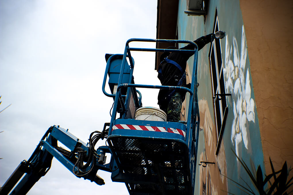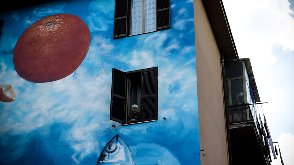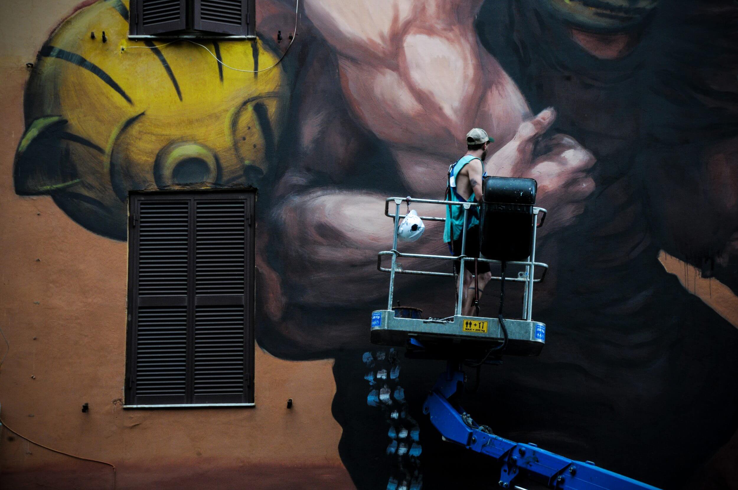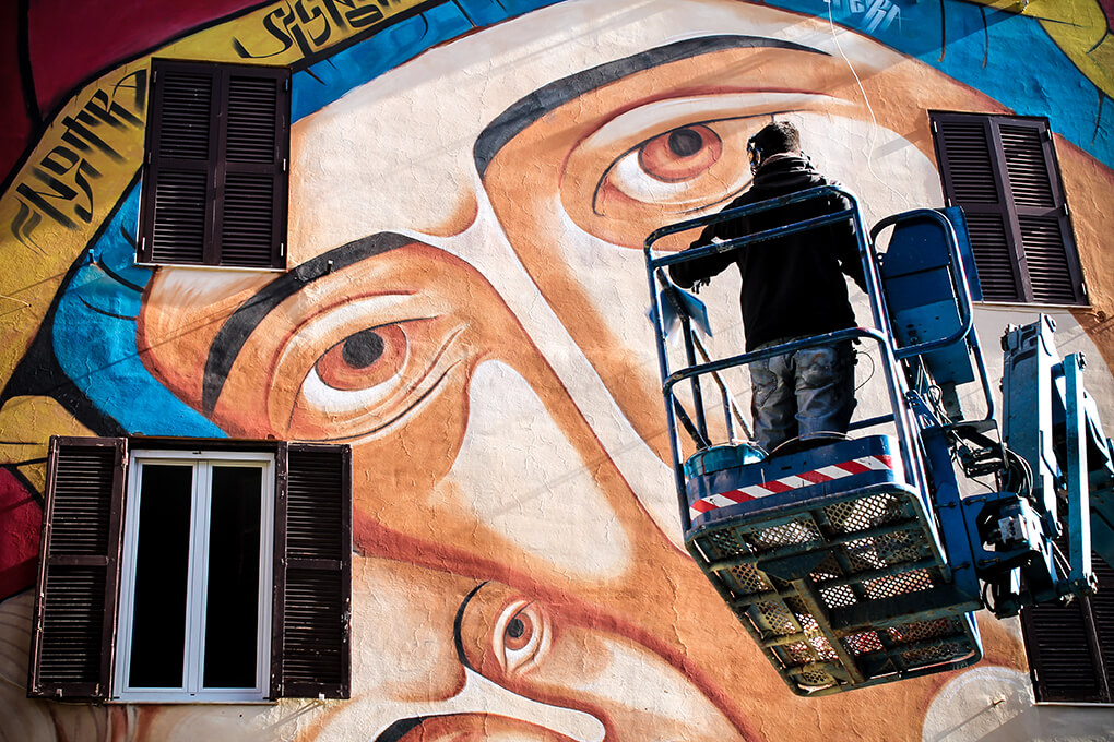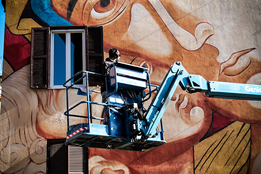 Street Artists Lek & Sowat were inspired by the story of Andrea Vinci. Andrea is a disabled 27-year-old who became paralysed from the waist down in an accident as a child. Andrea lives on the second floor of the building they were painting and sadly there is no elevator. Every day his brother comes to visit and carries him up and down the stairs on his shoulders. Lek & Sowat dedicated ‘Veni, vidi, vinci’, a tribute to the Latin motto and to the brothers.