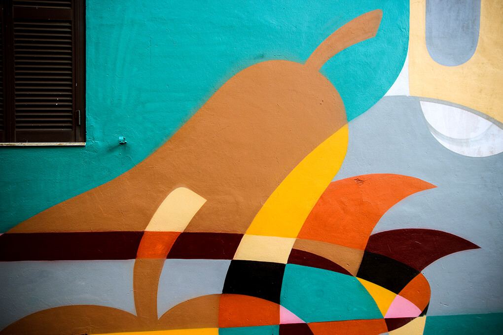 Clearly inspired by traditional Italian art Australian street artist Reka mural is simple abstracted still life, featuring typical pieces found in still life paintings ,fruit, a wine glass and statue figures.