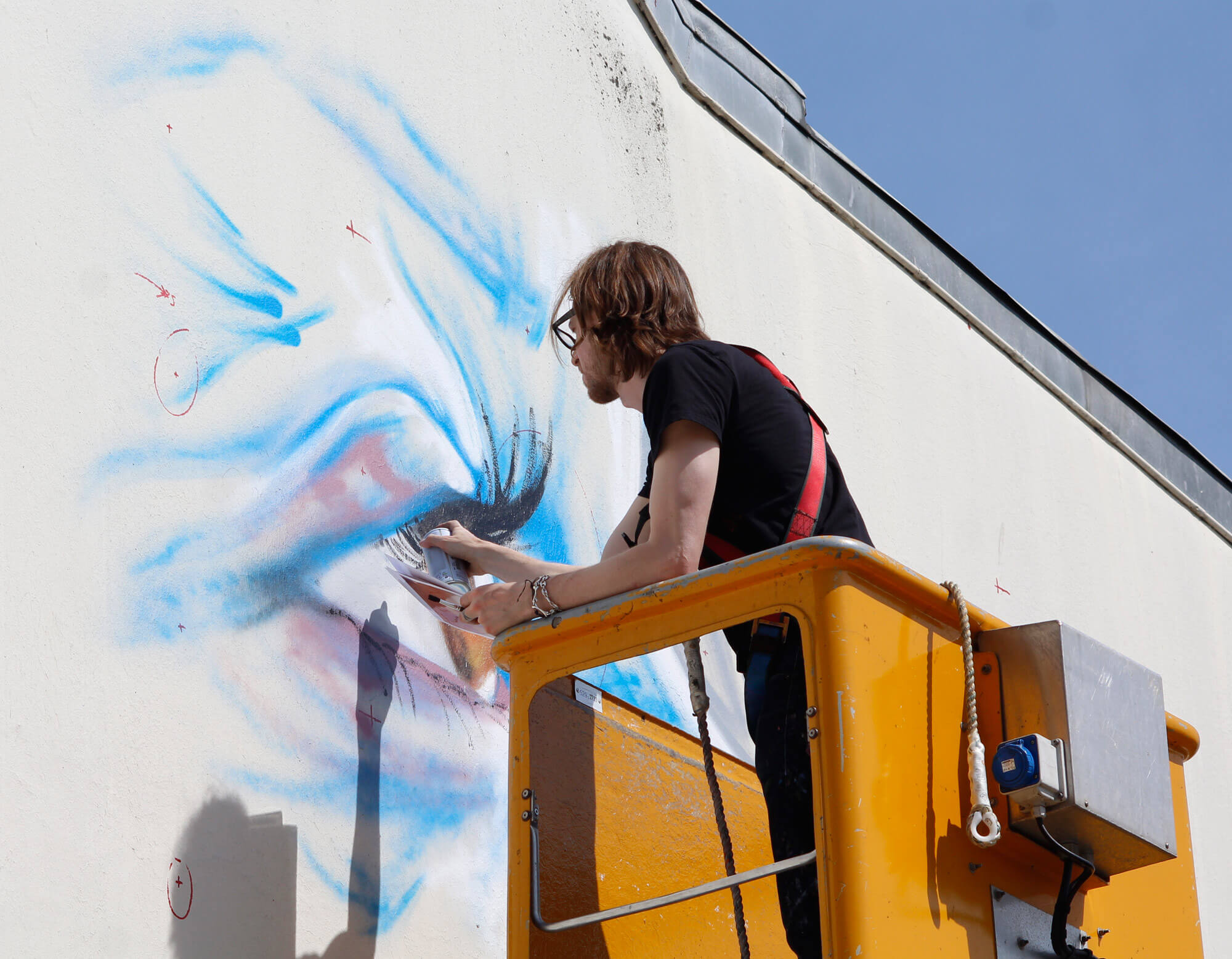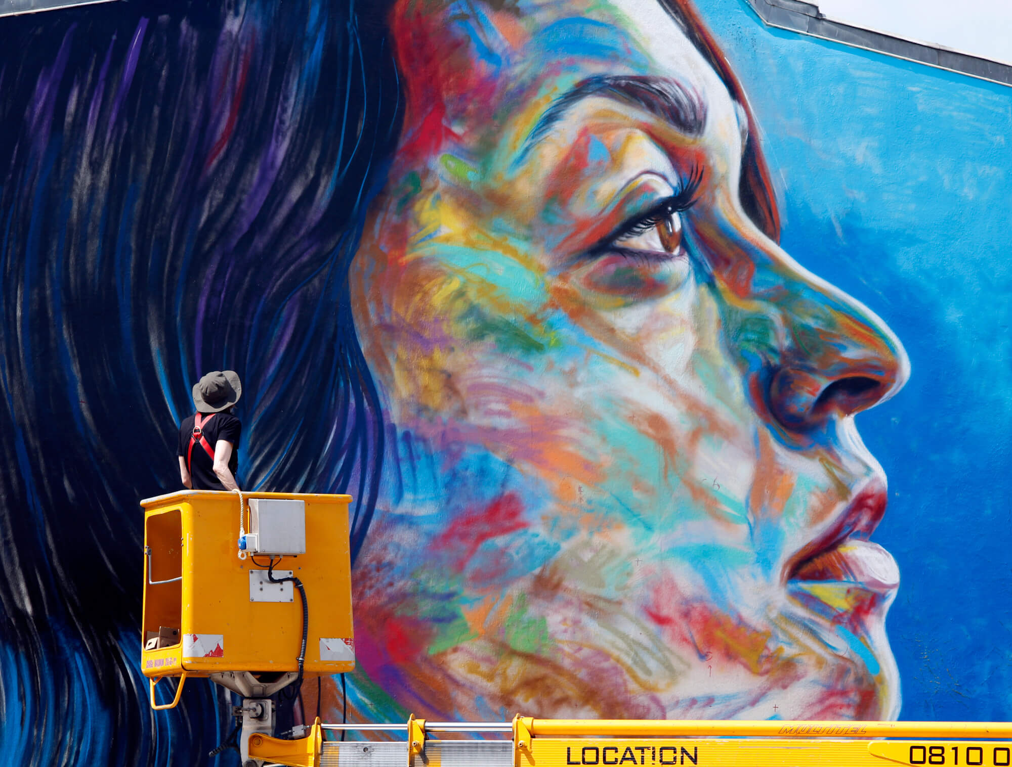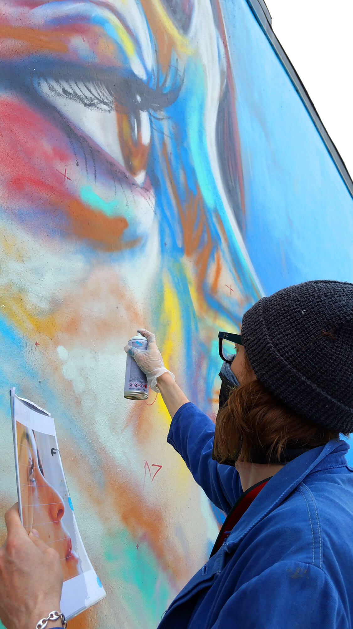 David Walker’s mural is the portrait of a young woman named Yuli. One recognizes the artist’s particular graffiti style, colourful layers forming a portrait that sometimes borders with hyperrealism.