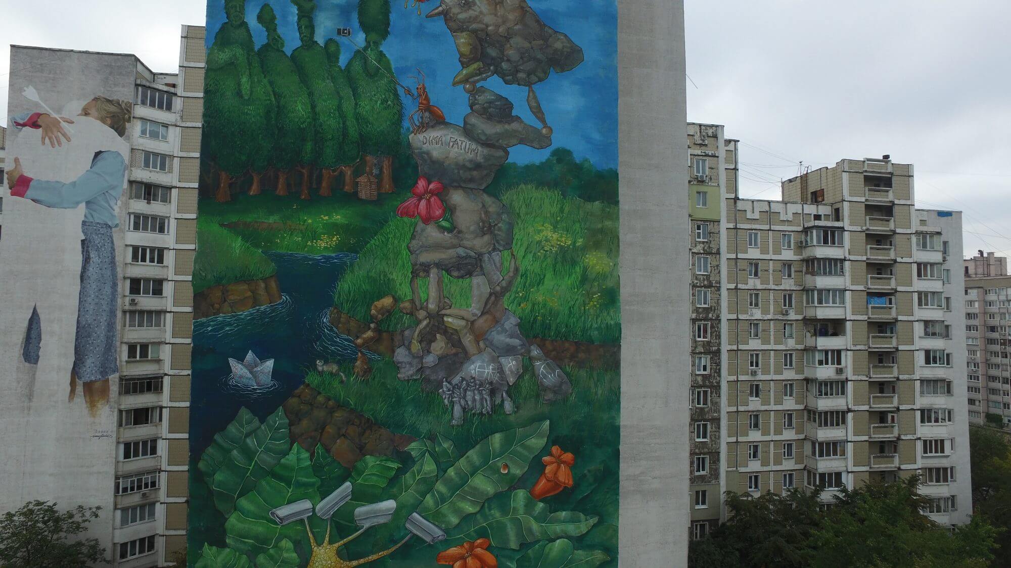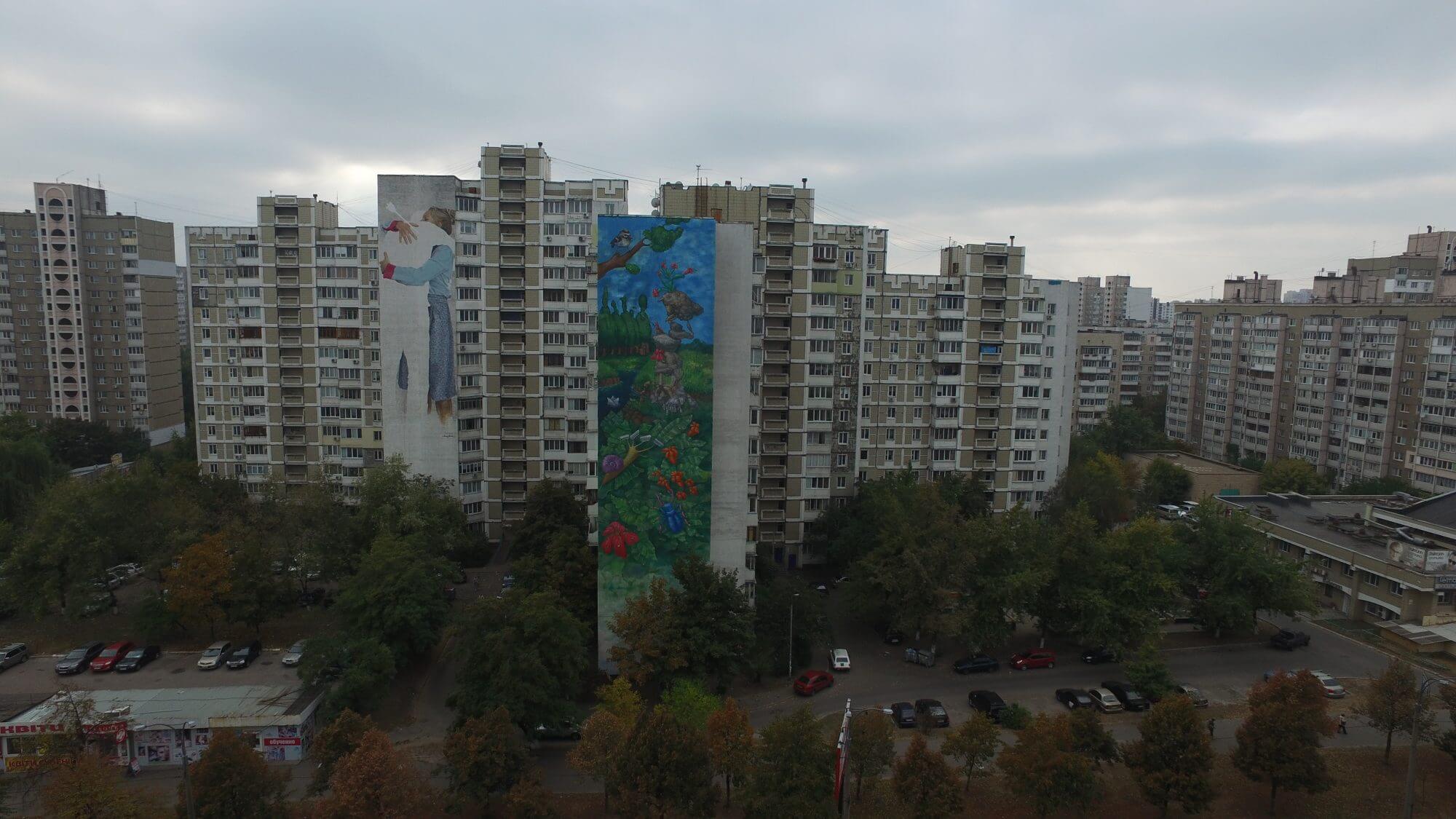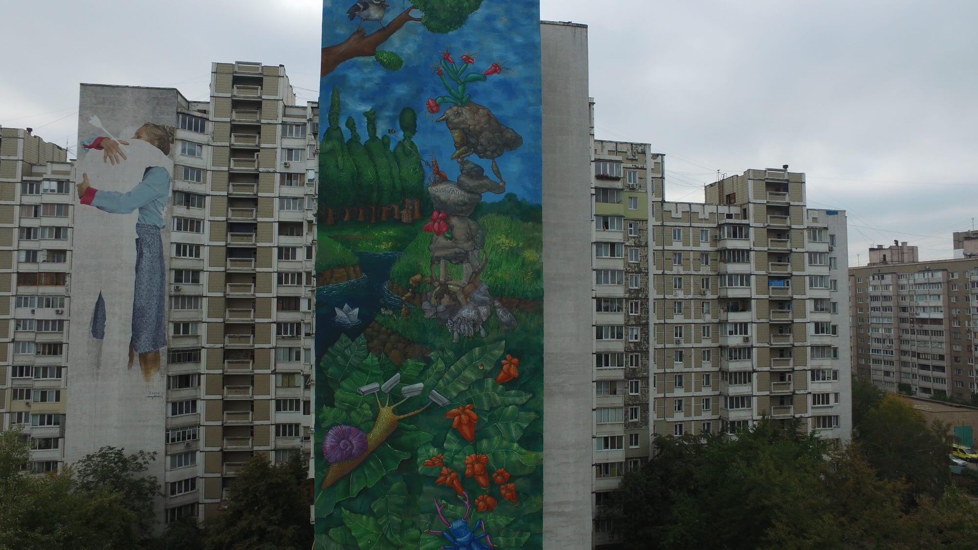 Street artist Dima Fatum has finished painting another huge wall on offer in Kiev, Ukraine for Art United Us. Art United Us project unites two hundred artists through mural art and the promulgation of maintaining peace on Earth, and is curated by Geo Leros, Iryna Kanishcheva and Waone Interesni Kazki.
