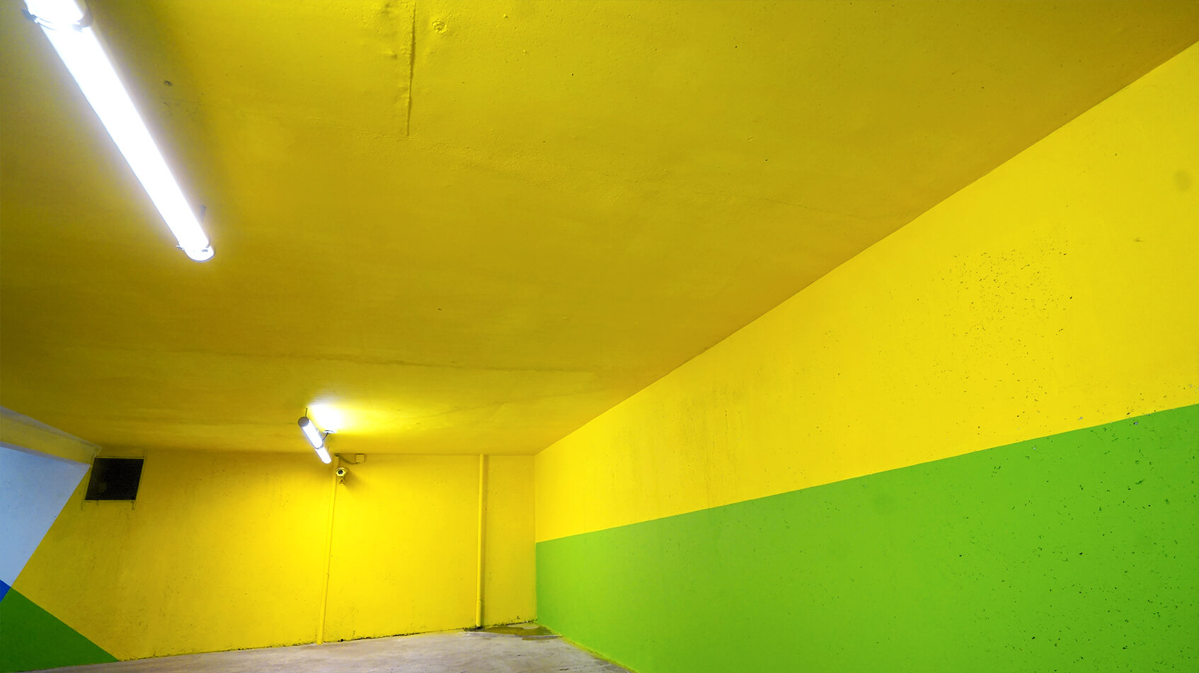 “My work in this parking lot is based on painting as a space creation tool. As we well know, the main feature of sculpture is the relationship with its spatial environment and the ability to modify it. This artwork, which uses the basic geometry and primary colours, makes use of the architectural factors where it inhabits, in order that each element adopts a new function and that the space becomes a huge sculpture”.Elian Chali