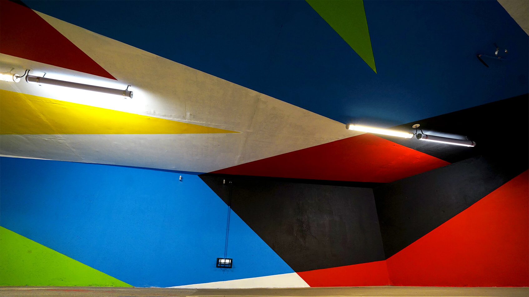 Elian is known for his abstract style and graphic design using vibrant colours and a rich mix of shapes, patterns and varied inclinations. Elian was asked to paint was a parking lot, which he pimped up in his anamorphic style.