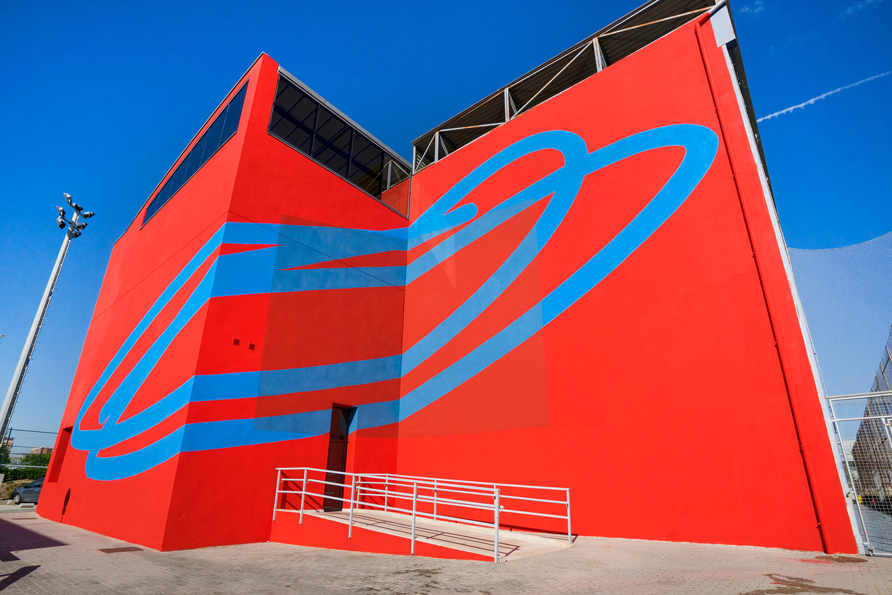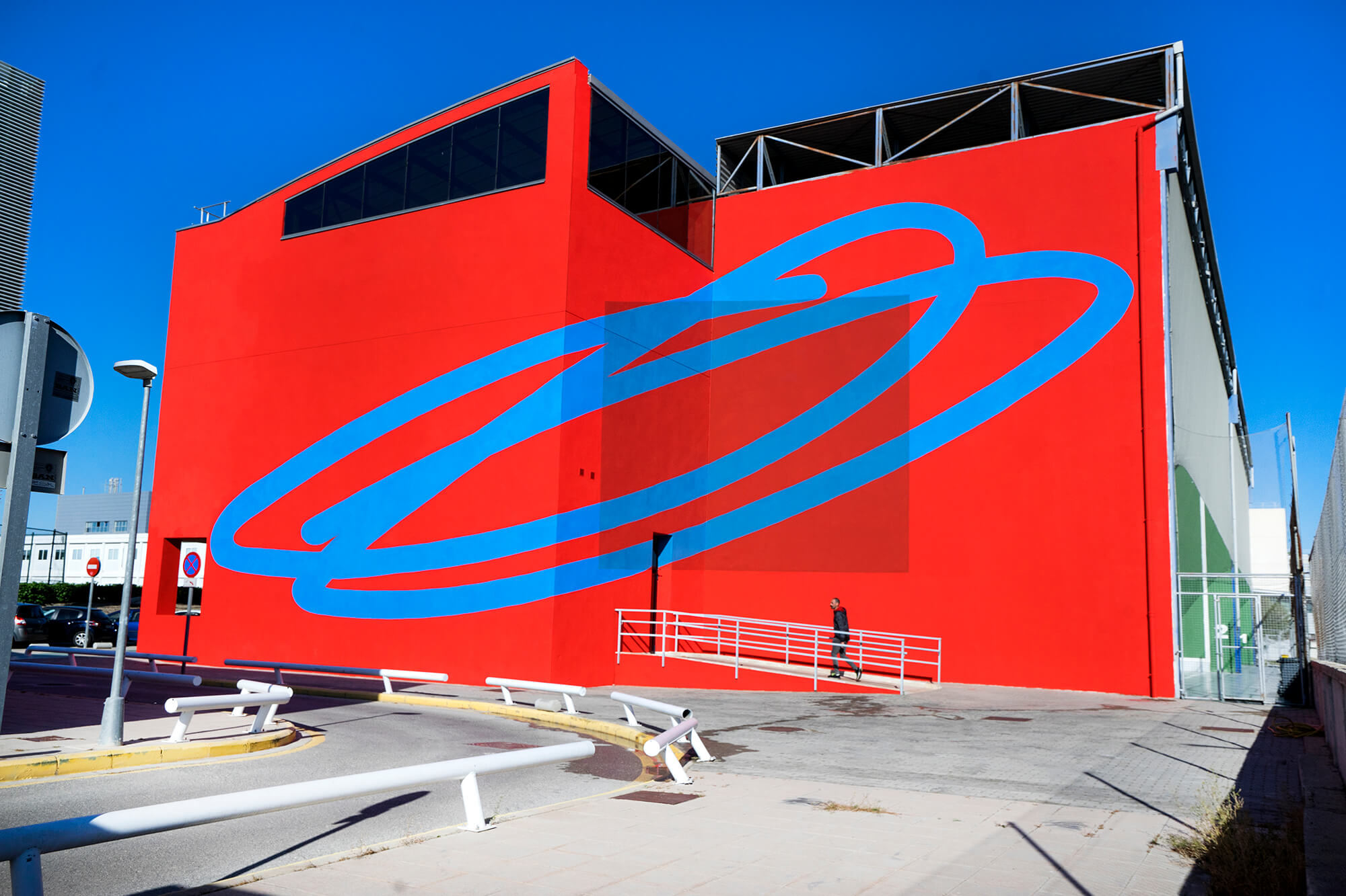 The chromatic vibration of the piece detaches the figure from the background. I decided to use only red and blue because the building is used as a Trinquete court, a typically Valencian sport, where each team is represented by these colours.