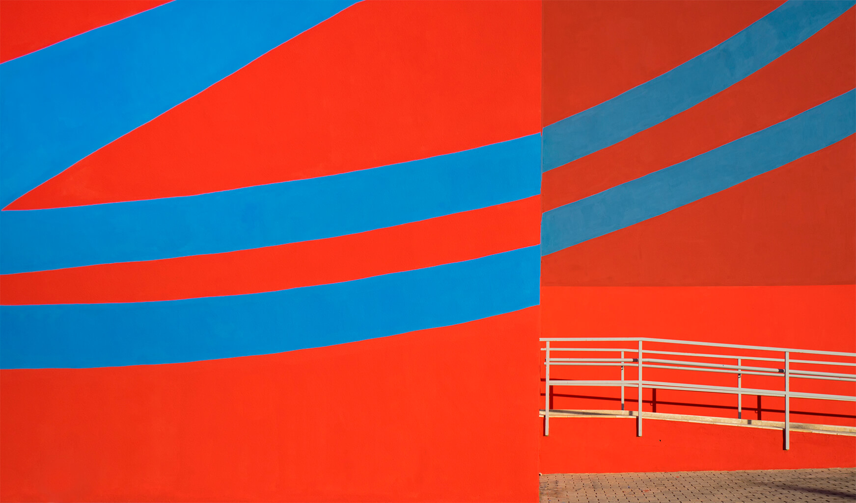 “Besides the floating effect of the blue figure and grey square, this piece seeks to highlight the architectural lines through the transformation of the white surface to red.