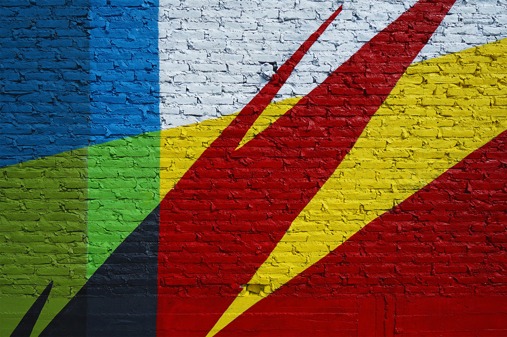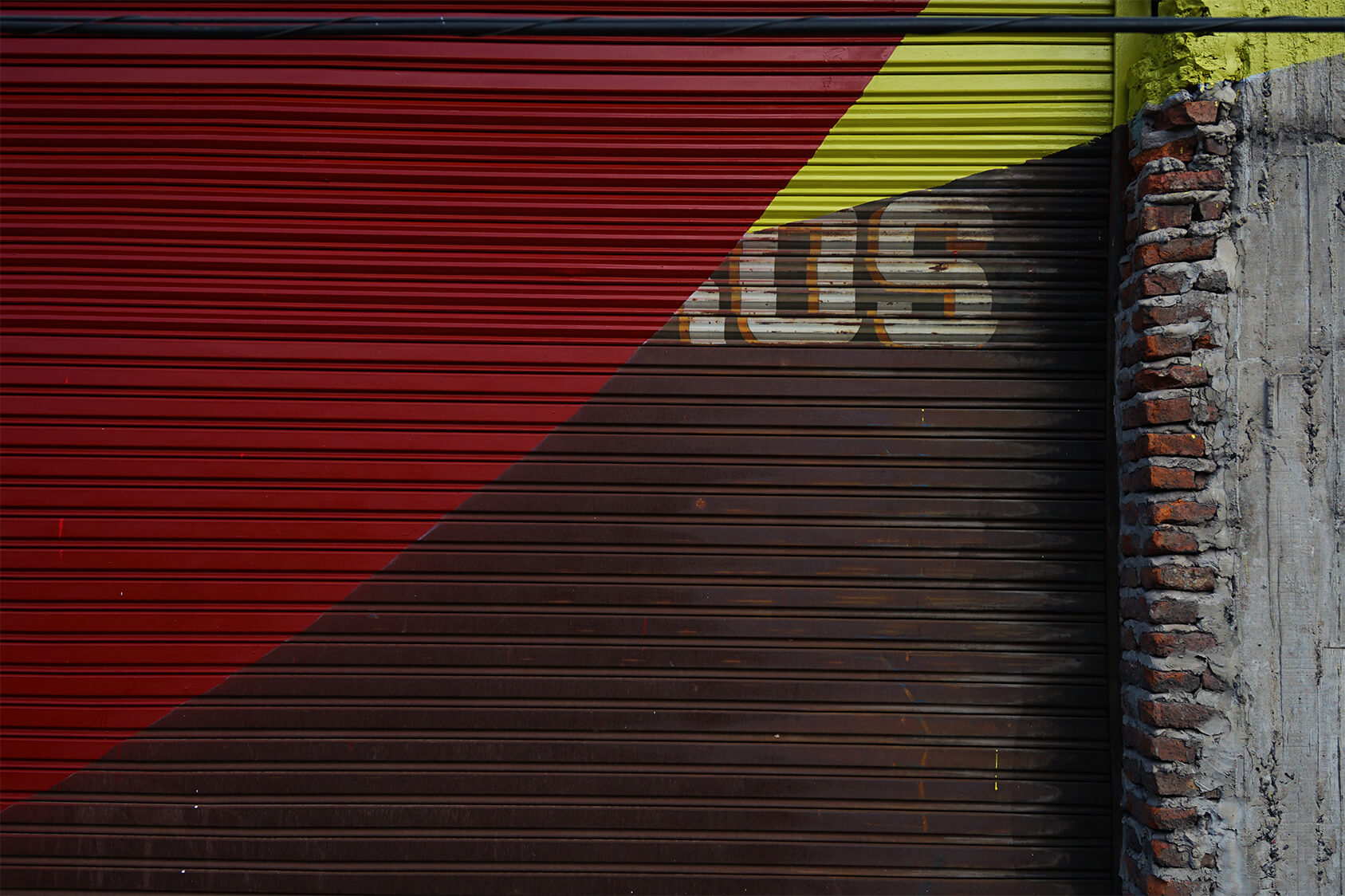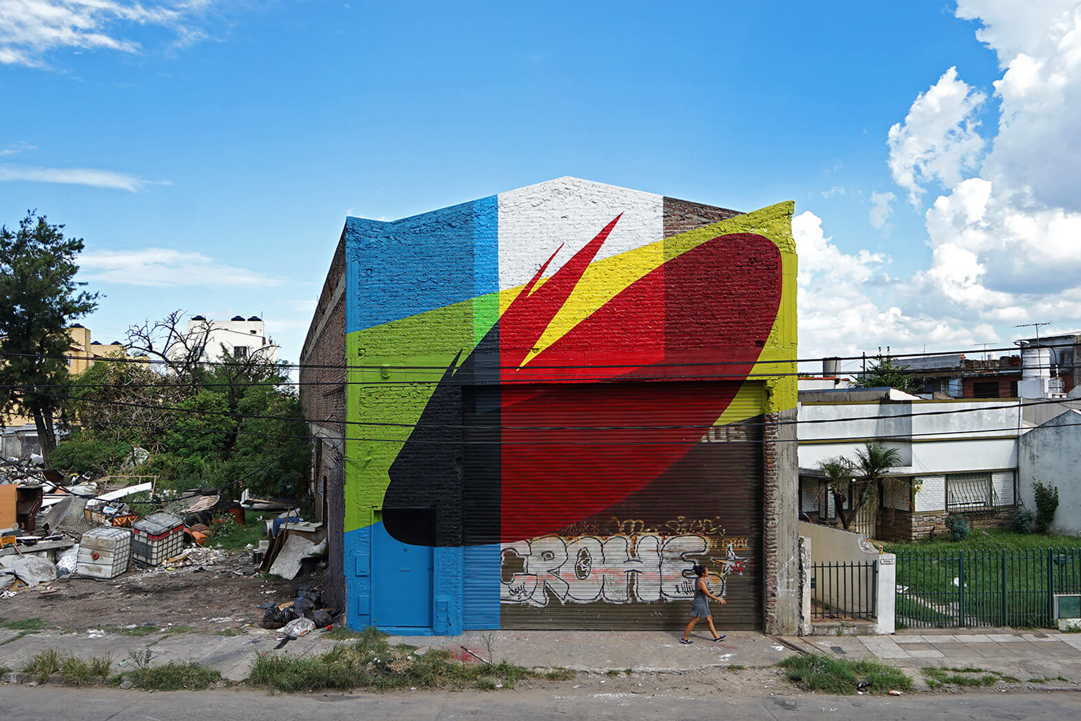 Elian is known for his abstract style and graphic design using vibrant colours and a rich mix of shapes, patterns and varied inclinations. The facade that Elian was asked to paint was part of an old iron factory, with its wall beautifully decayed, situated next to the garbage dump… like a forgotten story.
