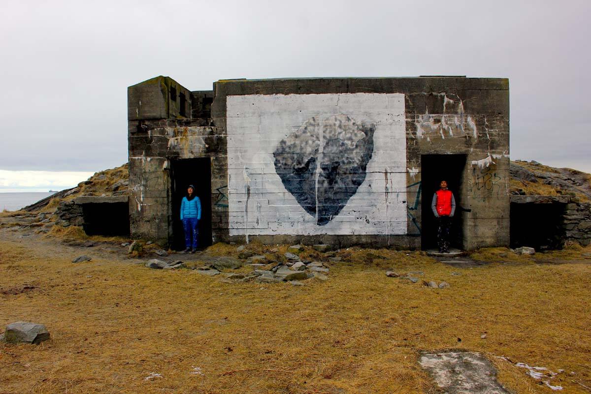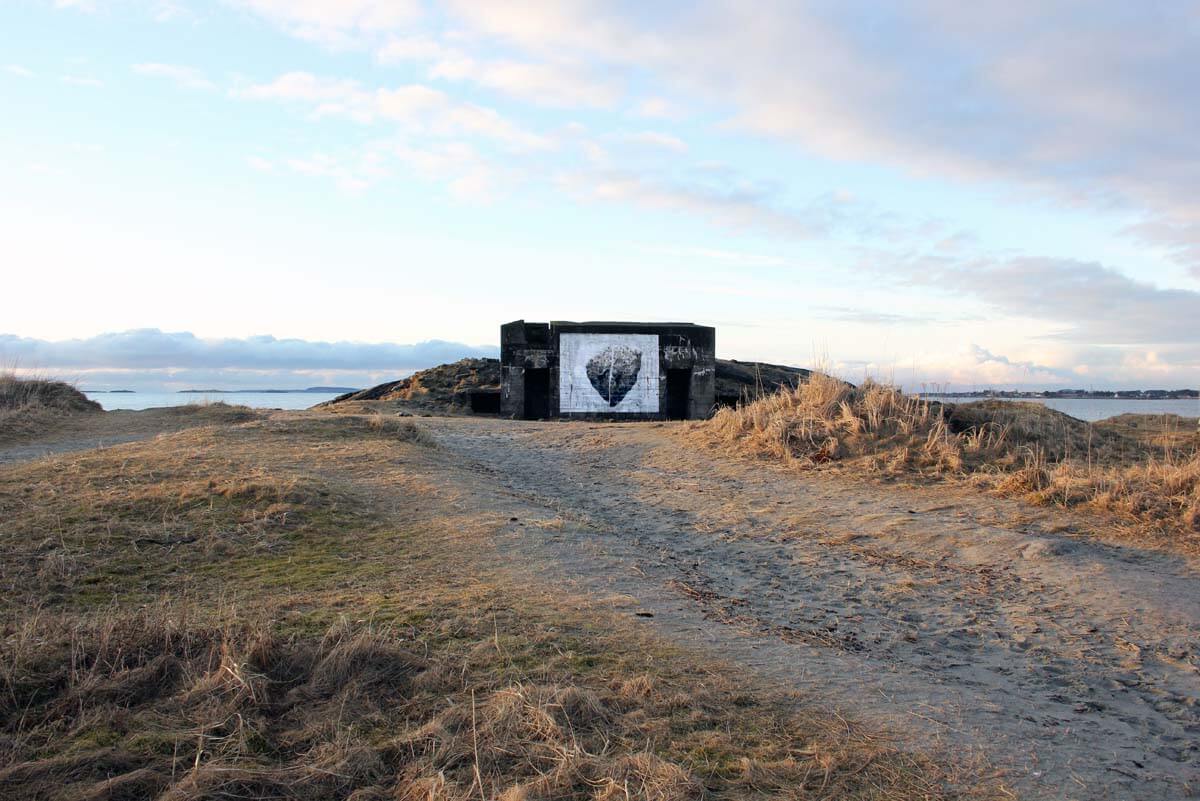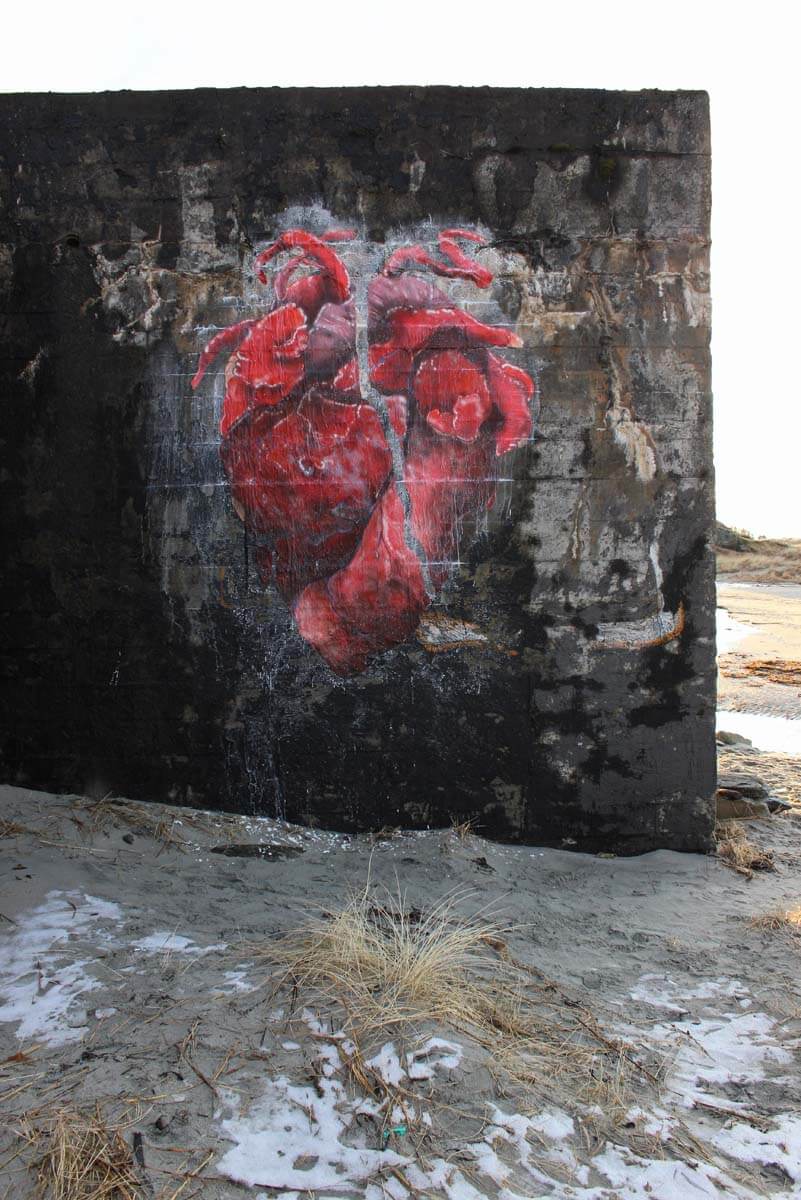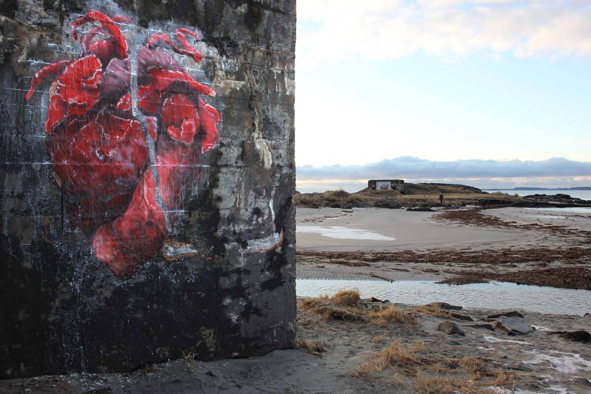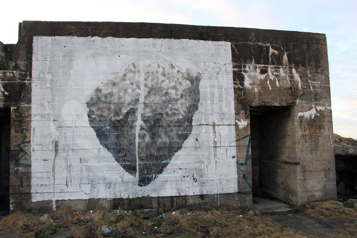They ventured out to Ølbergstranden beach on the outskirts of Stavanger to wheat paste artwork onto the old German-built World War II bunker. They paste broken hearts onto the Bunkers, representing how war tears hearts apart.