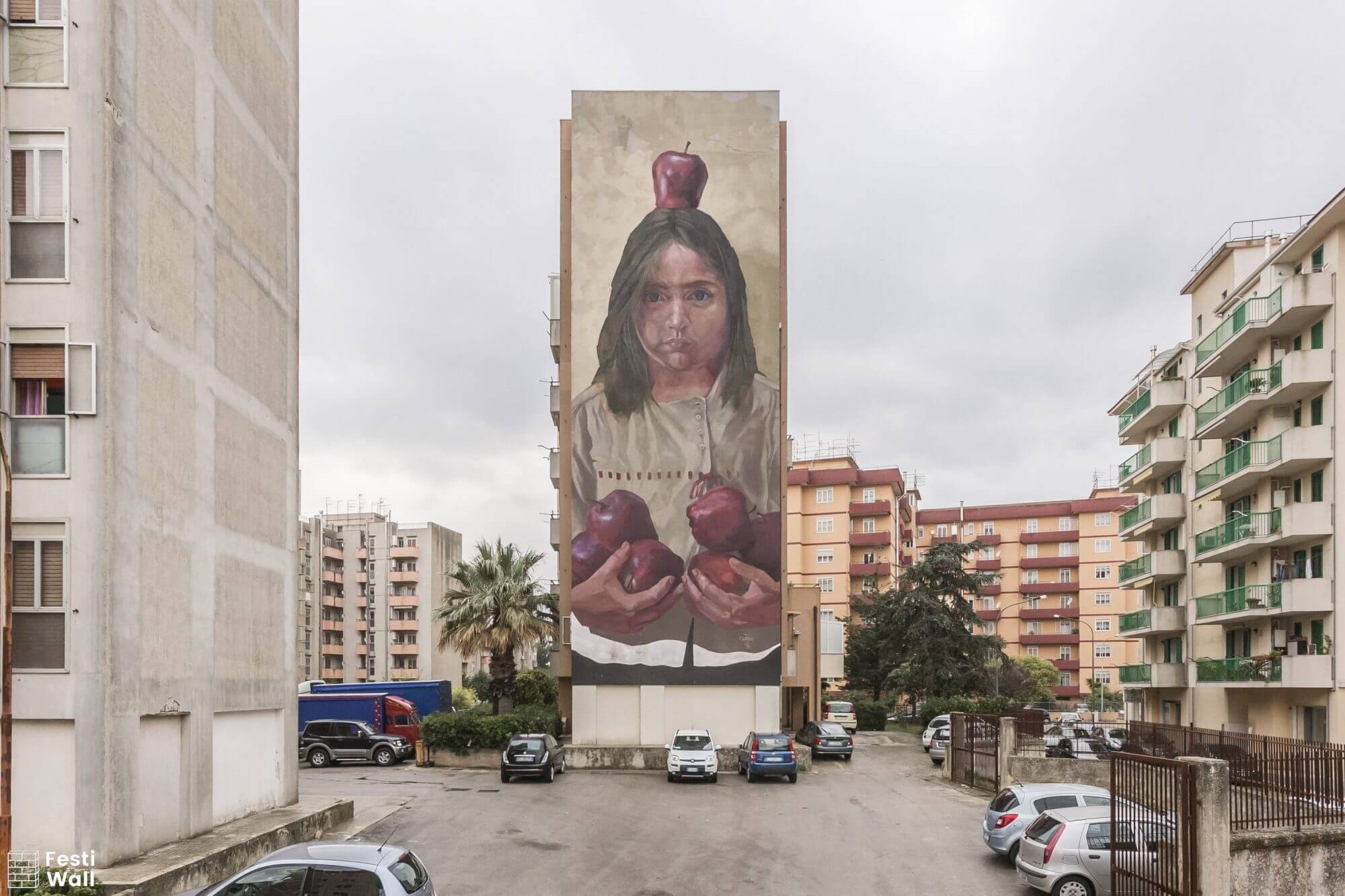 Evoca1 paints “Resistenza di Incertezza/ Resistance of uncertainty”. This mural is part of “Through the perils of our youth”, a series based on the experiences we endure through our lives that help shape who we are. This is the last mural of this series that will conclude in his next exhibition. For the festival Evoca1 paints a young girls balancing apples in her arms and one on her head. You can feel the tension in the mural, if the girl doesn’t keep her balance then the apple on her head will drop, but with her hands full she will not be able to catch it. The apple on the head image also promotes references to a Skillful marks-person being ordered to shoot an apple off their own child’s head with a bow and arrow!
