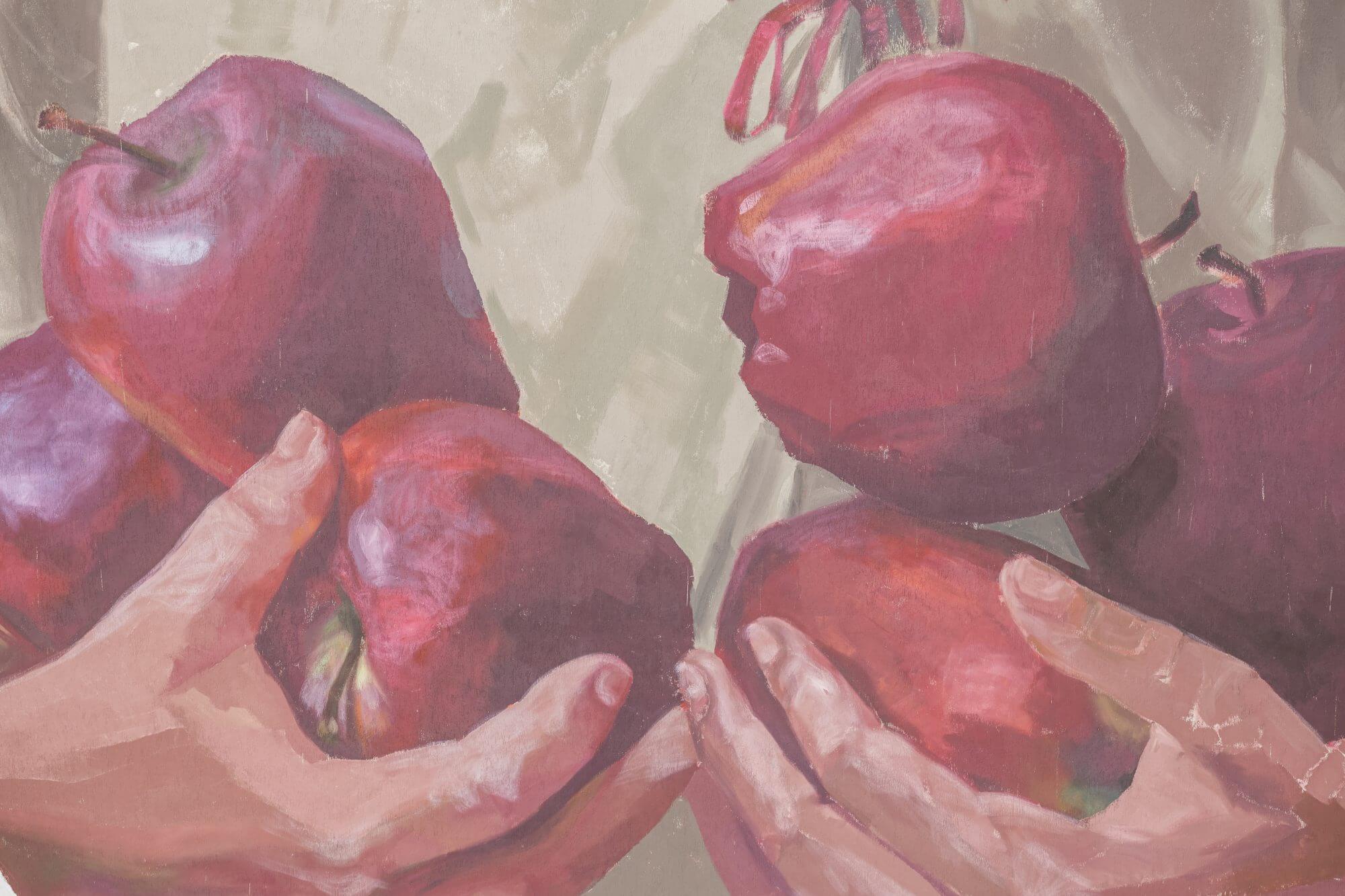 Augustine Iacurci paints “Building” in his signature style focusing more on objects and different elements, thus leaving aside the iconic characters. Augustine Lacurci paints a series of vases on top of each other, in perfect balance, all different in size and pattern. Intertwined between the vases are birds and vegetation, and ontop of the vases an egg. Signifying new beginnings.